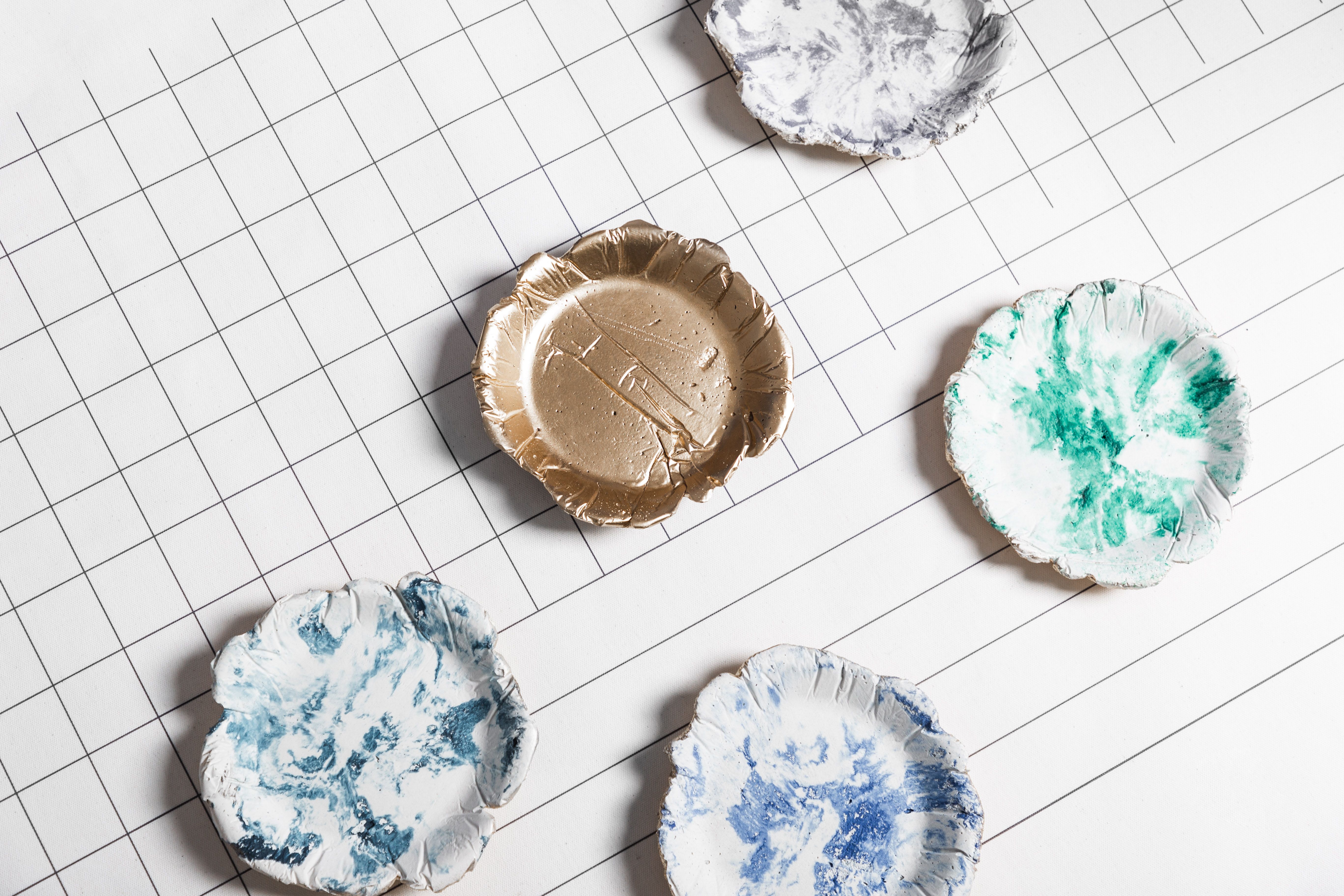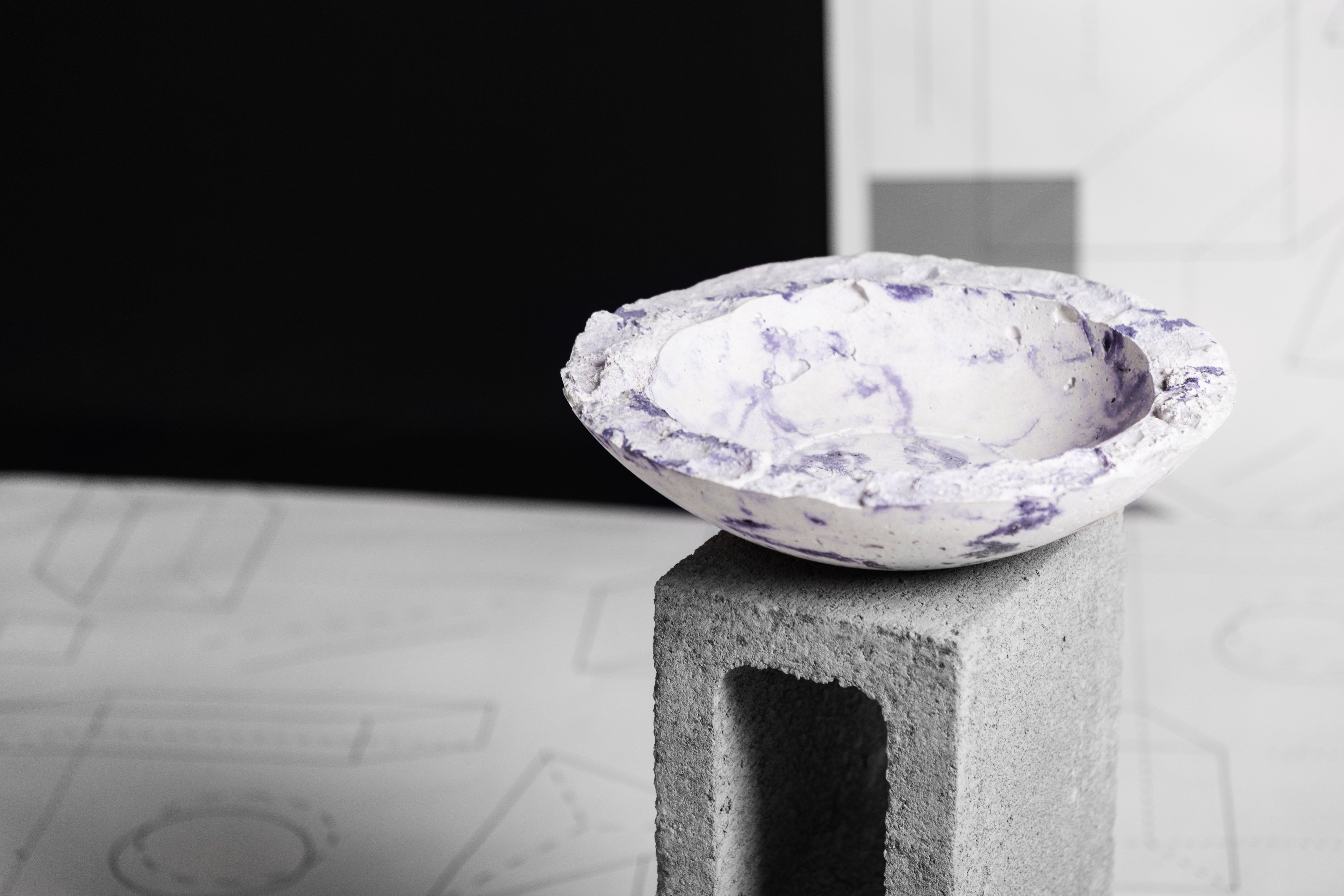 Materiales industriales, usualmente utilizados en la construcción, le dan vida a nuestros centros de mesa cóncavos con efecto marmolizado. Una pieza decorativa que sirve para espacios interiores como exteriores. El concreto es un material resistente. Su composición permite que esta pieza sea duradera. Cuando fundimos el material, tinturamos el cemento, dándole este efecto marmolizado. Cada veta que se forma es única.