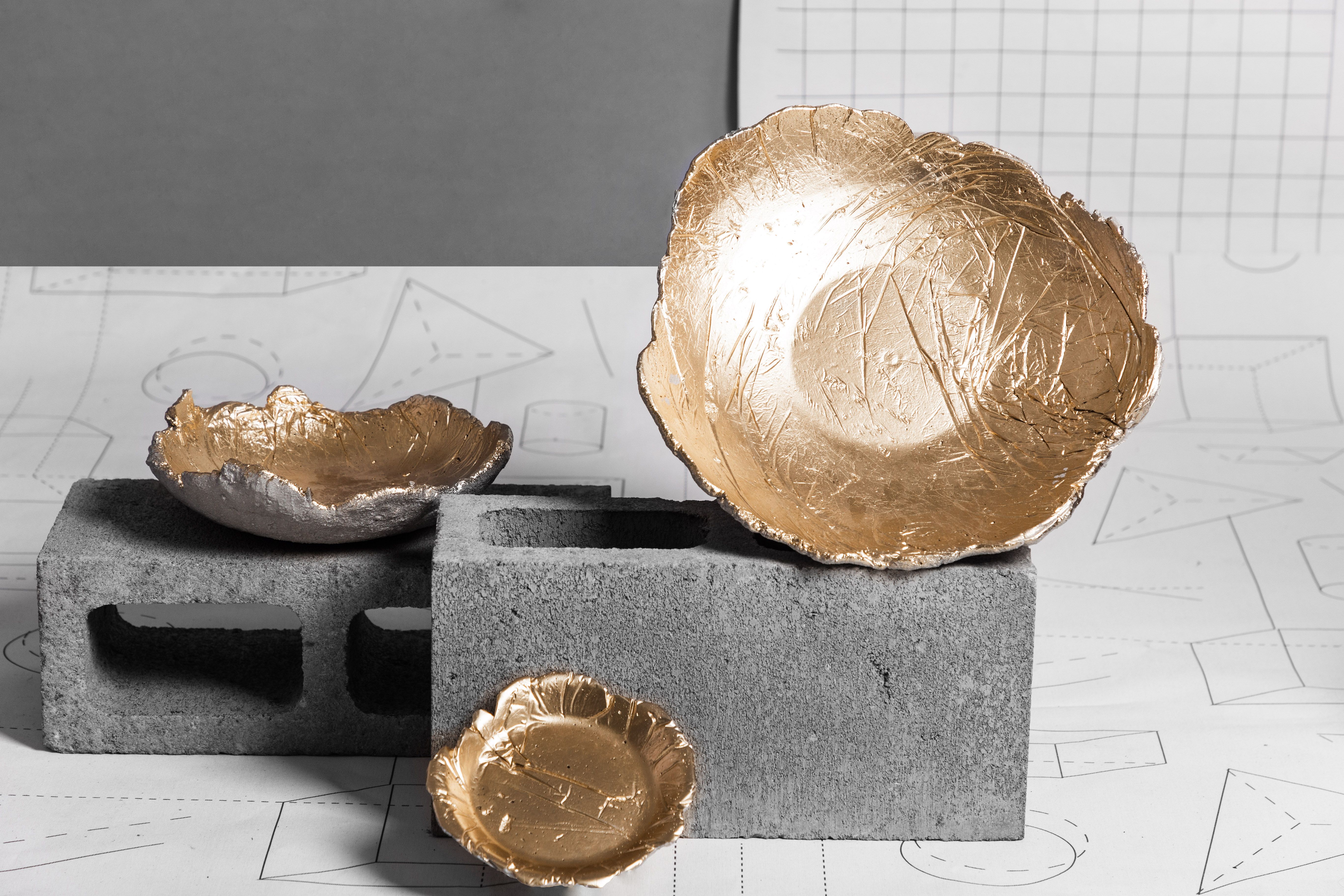 Pensando en esos objetos que le dan un carácter especial a la mesa de comedor, a la mesa de centro y las mesas auxiliares, fabricamos esta serie de piezas en concreto con acabado en color oro, efecto marmolizado o en su acabado natural que resalta el gris del cemento.