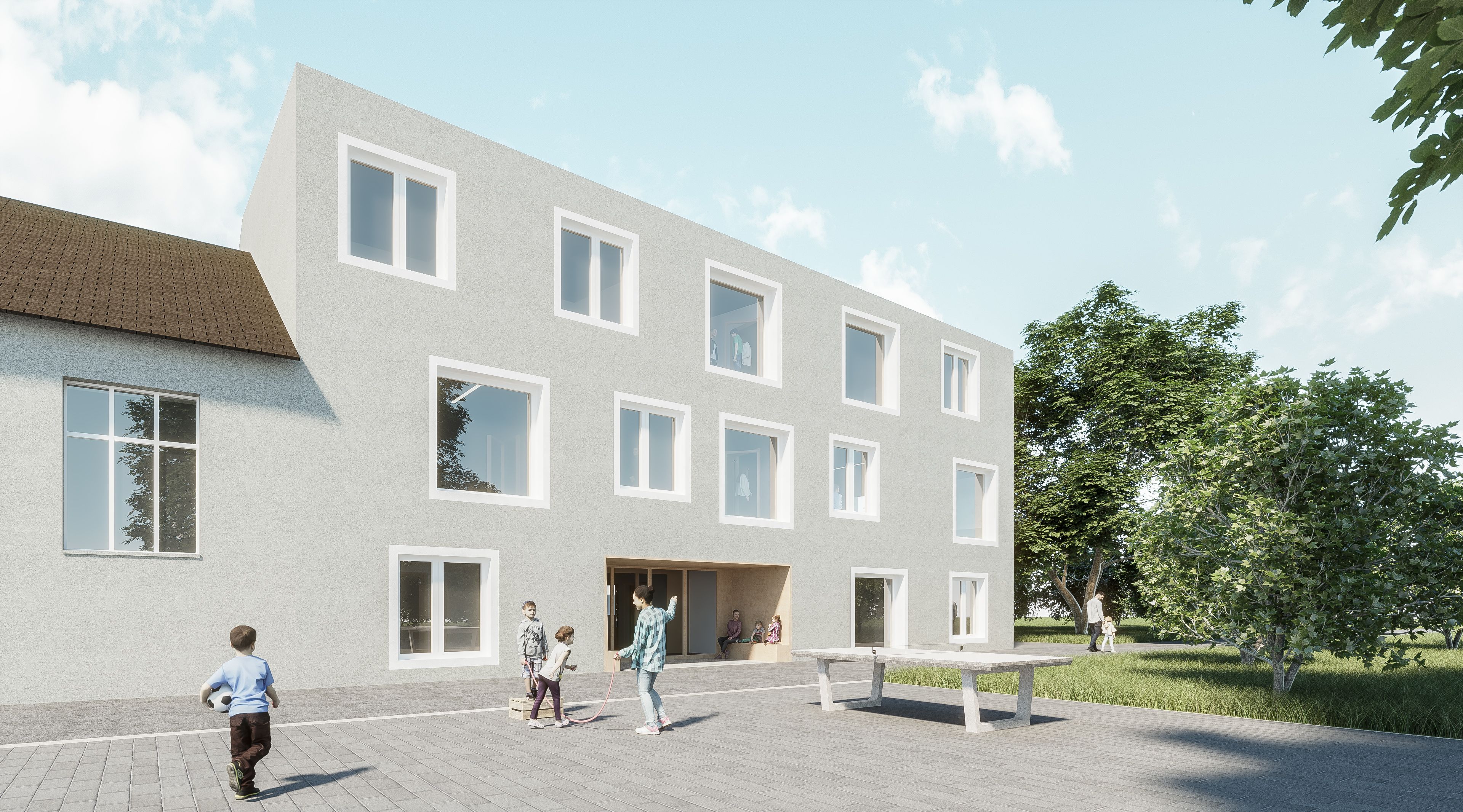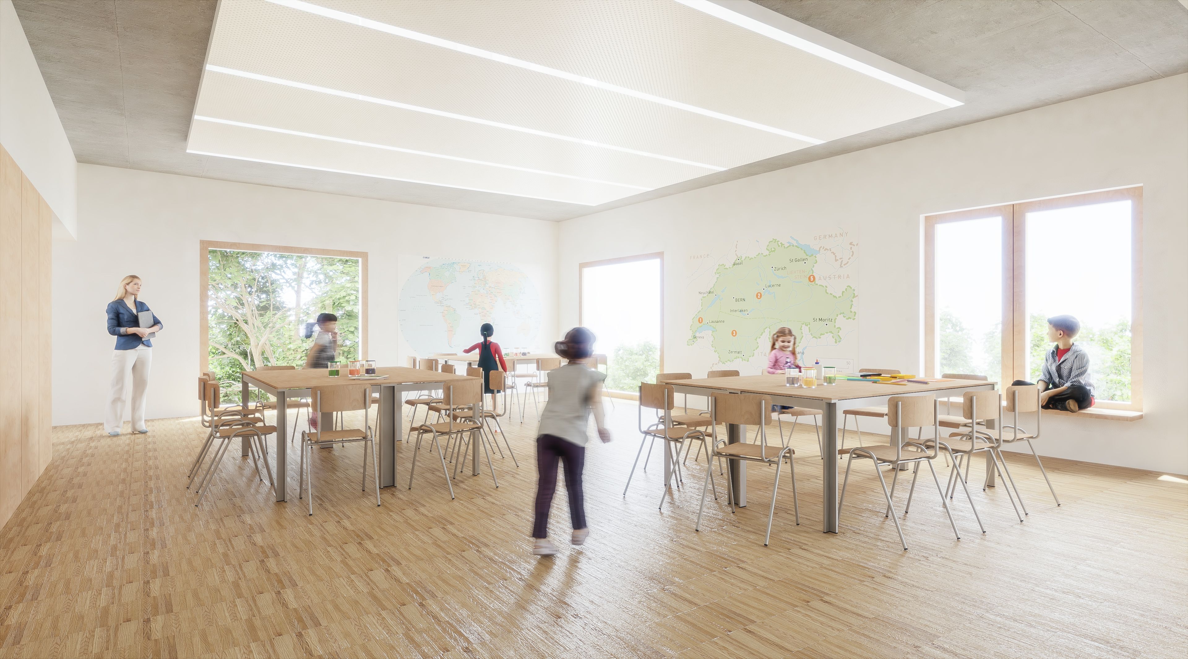 Imágenes 3D para concurso de escuela primaria en Birmestorf, Suiza. Por parte del cliente se recibe un modelo de SketchUp que hay que editar y trabajar para poder aplicar los materiales y la iluminación de Vray.