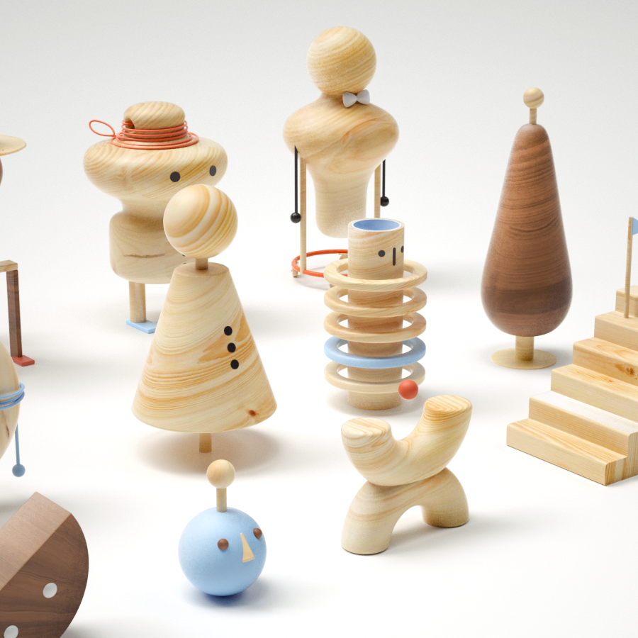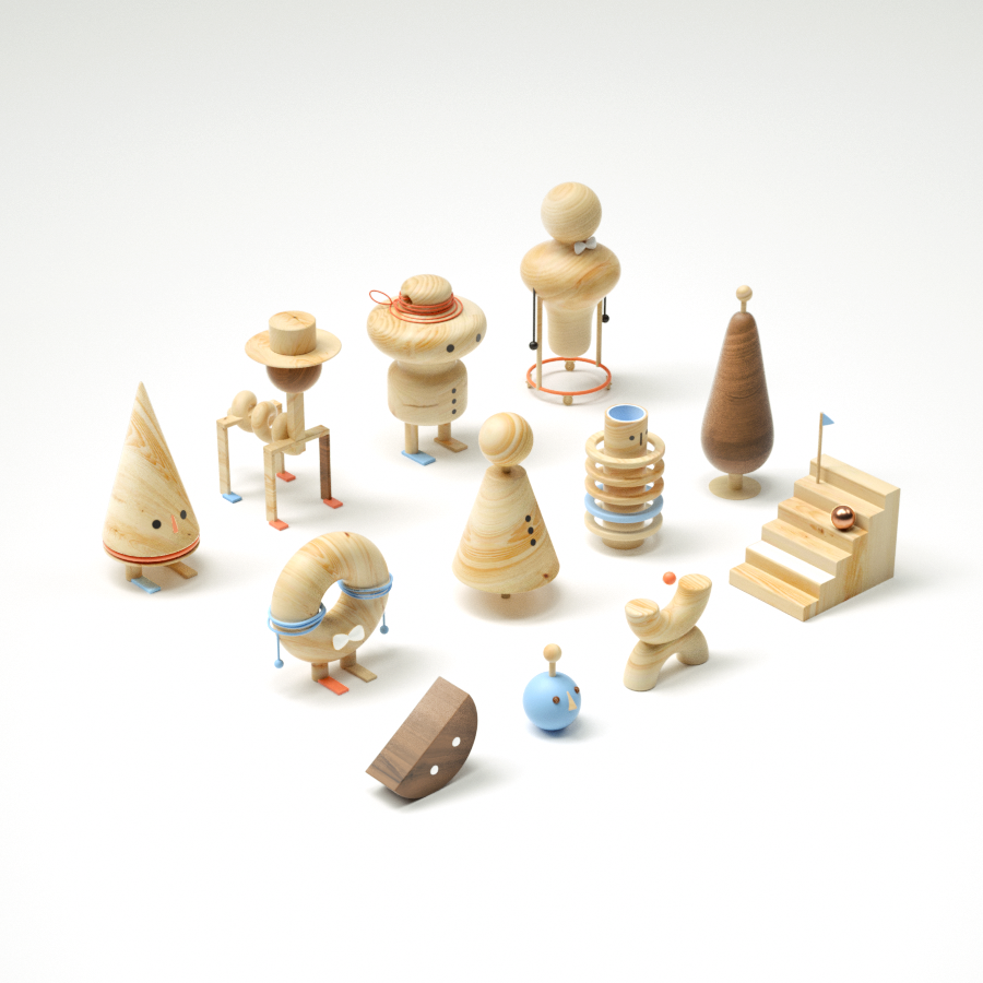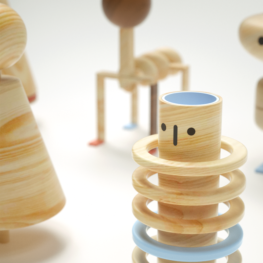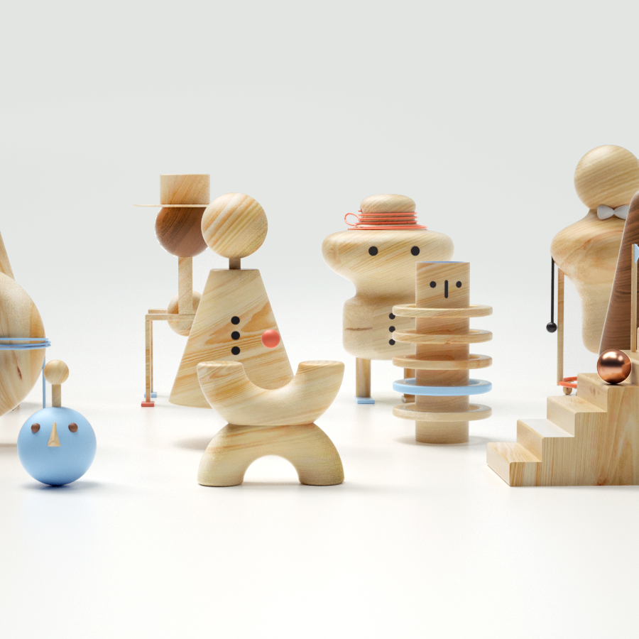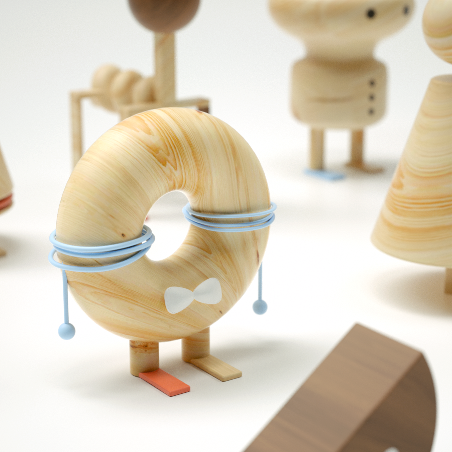 Para contrarrestar mi soledad, me creé varios amigos de madera (en Cinema4D) que a pesar de ser muy geométricos y minimalistas, los considero muy platicadores y risueños. María Antonieta es una elegante cuidadora de ovejas que toma el té todas las mañanas con su incondicional y panzón amigo Donut. Les gusta ver pasar a la gente, y no falta el día en que Gusano Caballo, aunque siempre esté de prisa, vaya a saludarlos y a mostrarles un nuevo truco de magia con su curioso sombrero. El señor Robles vive dentro de un barril, y junto con el cono Conóstenes, planean los mejores atracos y robos de banco de la comarca. Tanizaki es un niño ninja, y Sandy es su amiga cara de sandía. Momo, Tate, Oz, Cromosoma y Podium son otros buenos amigos que cada vez que los llamo por su nombre, me devuelven el saludo. Espero que tú también reconozcas al menos a uno por su nombre.
