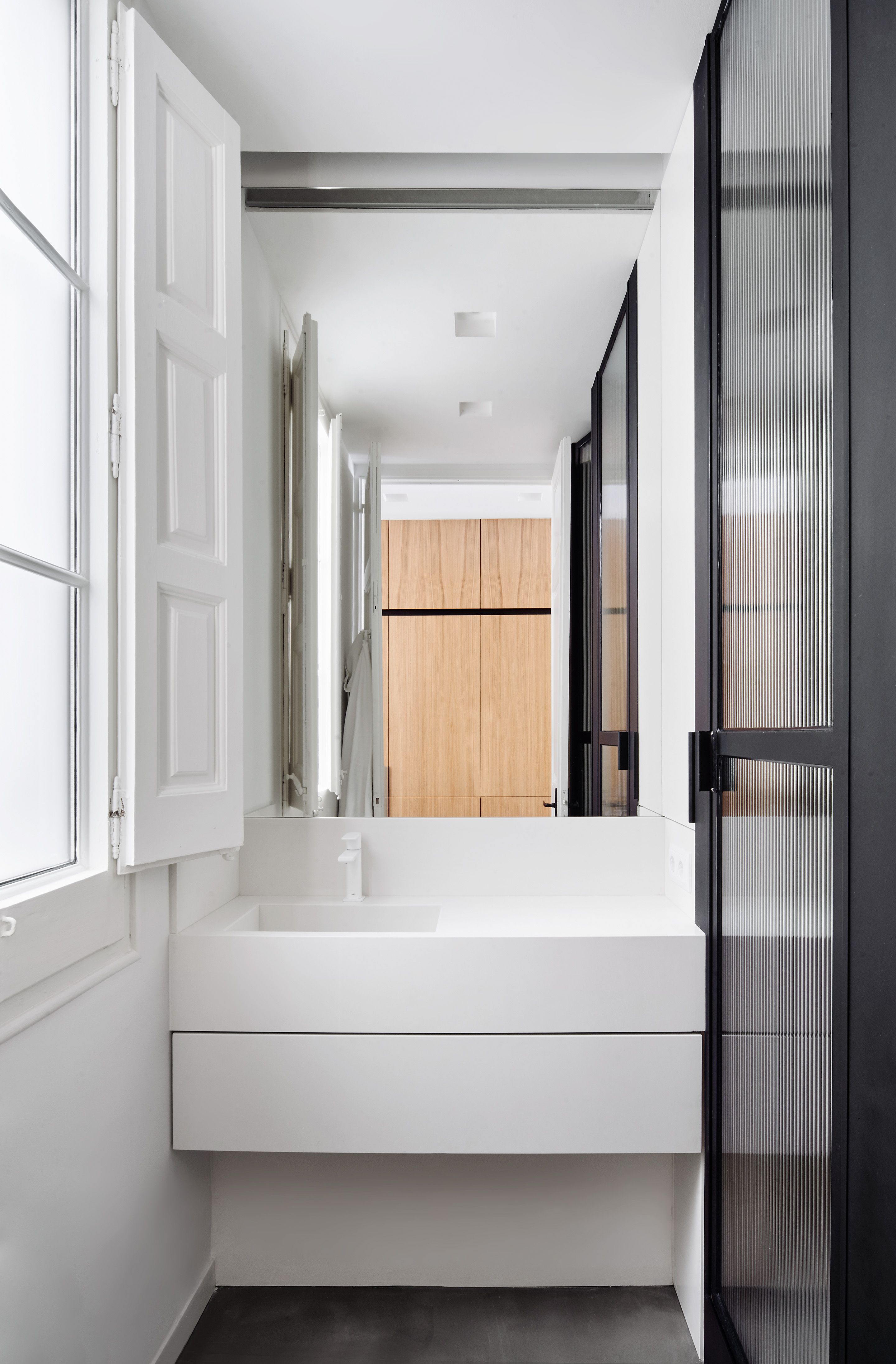 La solución propuesta permite unificar el espacio alrededor de un solo mueble que articula las dos estancias principales de la vivienda: un estar-comedor-cocina y un dormitorio-estudio. La anexión de estos dos espacios permite una buena ventilación cruzada en eje este-oeste.
