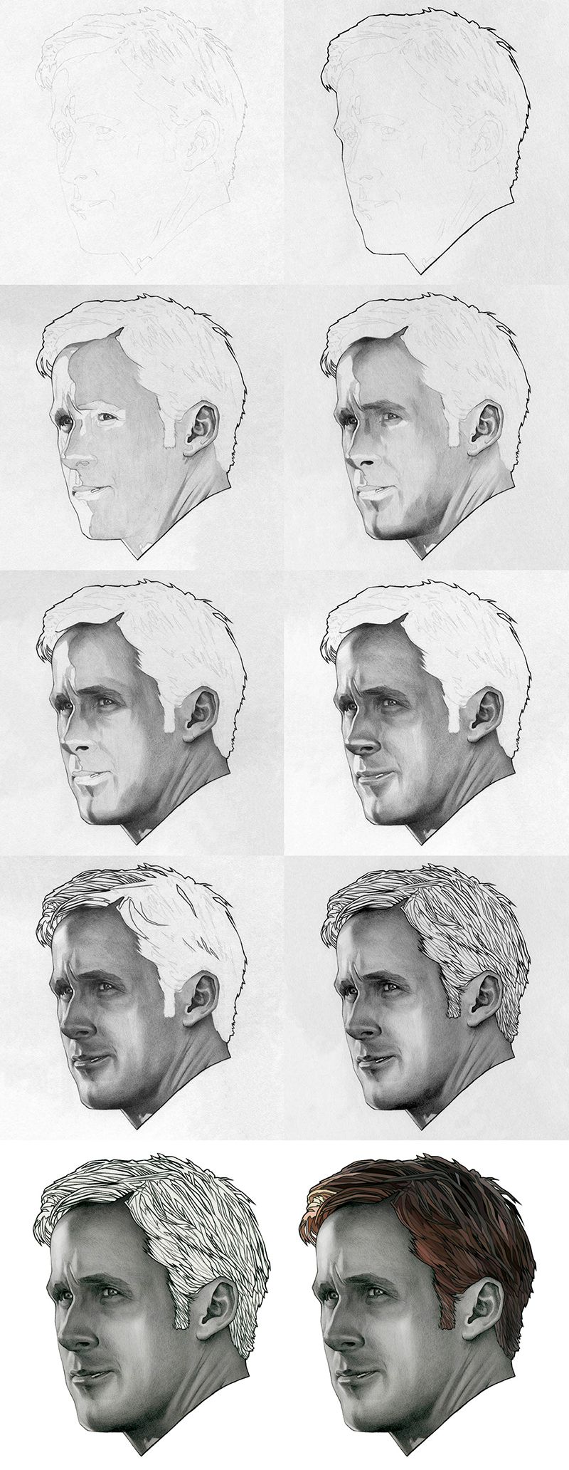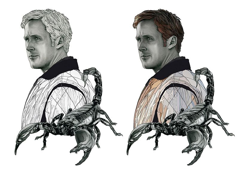 La ilustración está compuesta por tres dibujos a grafito, hechos por separado y después incorporados, ajustados y coloreados con Photoshop. El lettering es también un dibujo a mano, interpretado digitalmente.
