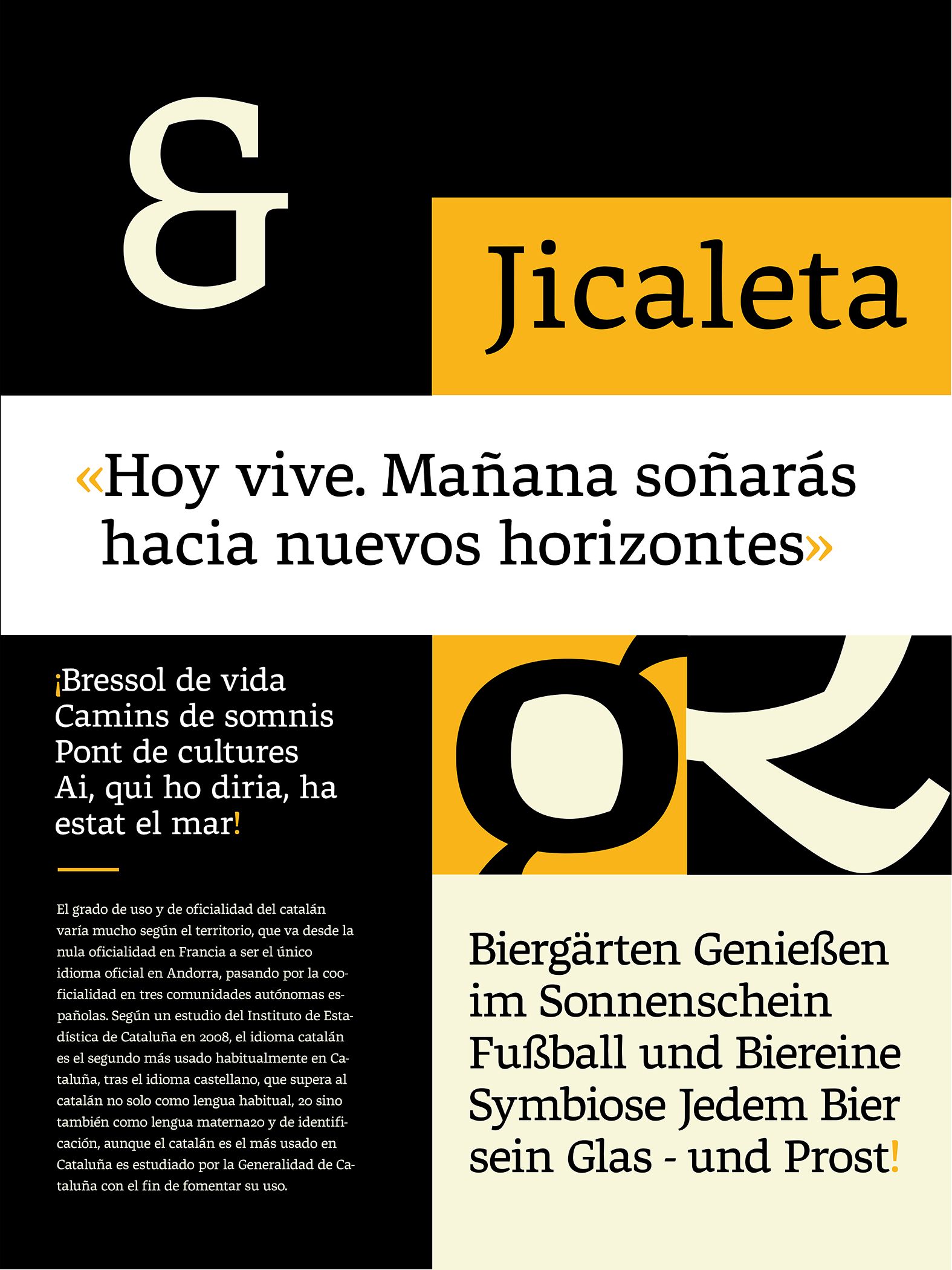 Jicaleta es una tipografía para textos de largo aliento en pantallas. Es un proyecto colaborativo de Karen Cartas, Pepino Meléndez Quintana, Erika Varela, Manuel López Rocha y Javier Alcaraz para el Primer Torneo Tipográfico Letrástica Comunidad.