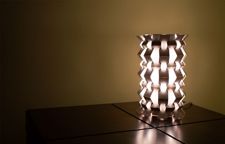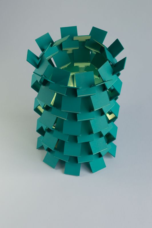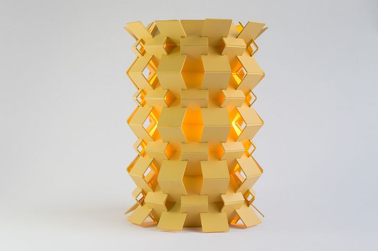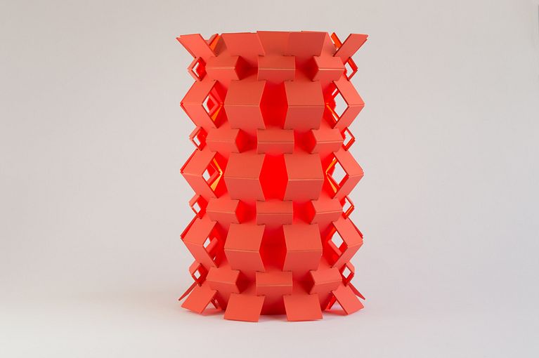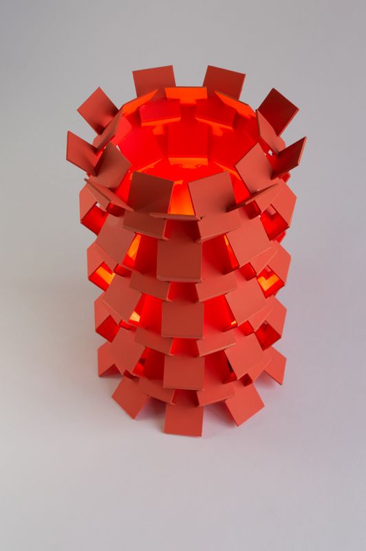 Esta lámpara es un experimento formal a partir de un solo módulo que se repite. La luz se filtra a traves de esta forma de maneras que difuminan muy bien la luz, y le da una presencia impactante a la lámpara, tanto prendida como apagada.
