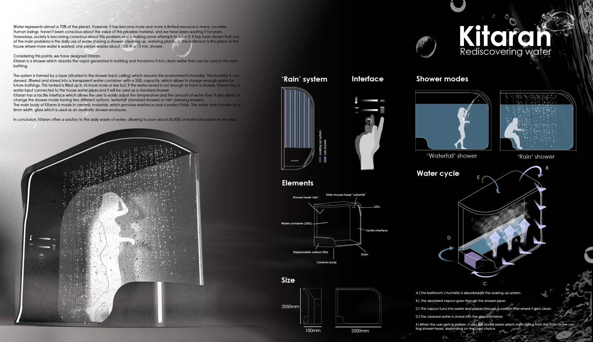 Proyecto con el que participamos en el concurso de diseño interncional de Roca. Consiste en una ducha que absorbe la humedad creada durante el baño, y la almacena una vez condensada y depurada para reutilizarla en duchas posteriores y reducir así el consumo de agua corriente por baño.