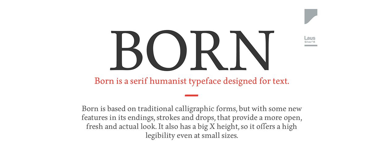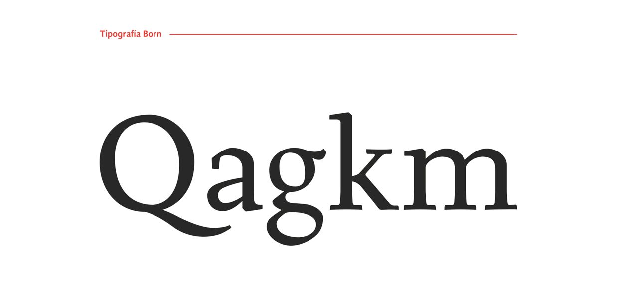 Born es una tipografía humanista que sigue las formas caligráficas tradicionales en su base pero con algunas novedades en sus remates, trazos y gotas que aportan un aspecto más abierto, fresco y actual. Además posee una elevada altura de x, de modo que ofrece una alta legibilidad incluso a tamaños pequeños