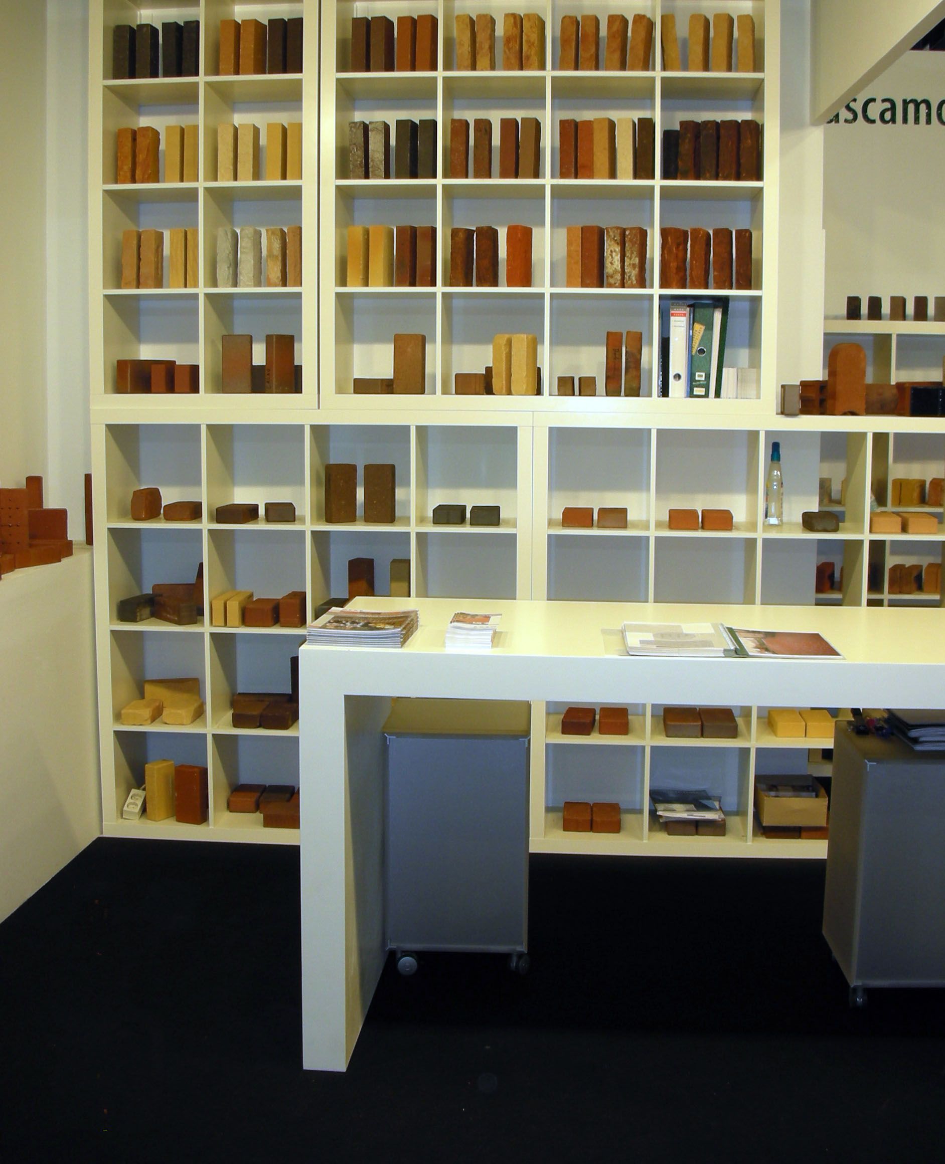 The idea was to show the great amount of different bricks, sizes an colours, like a library. The desk was designed by myself and the rest bought at Ikea.