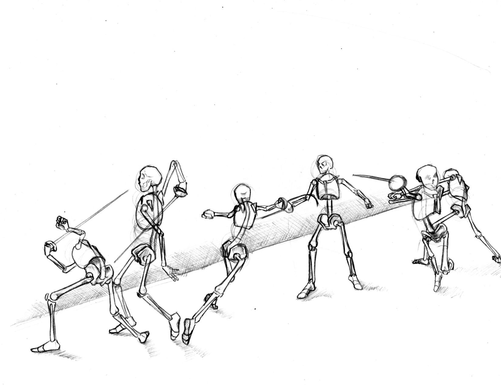 Me encantan las poses dinámicas de los personajes practicando esgrima.