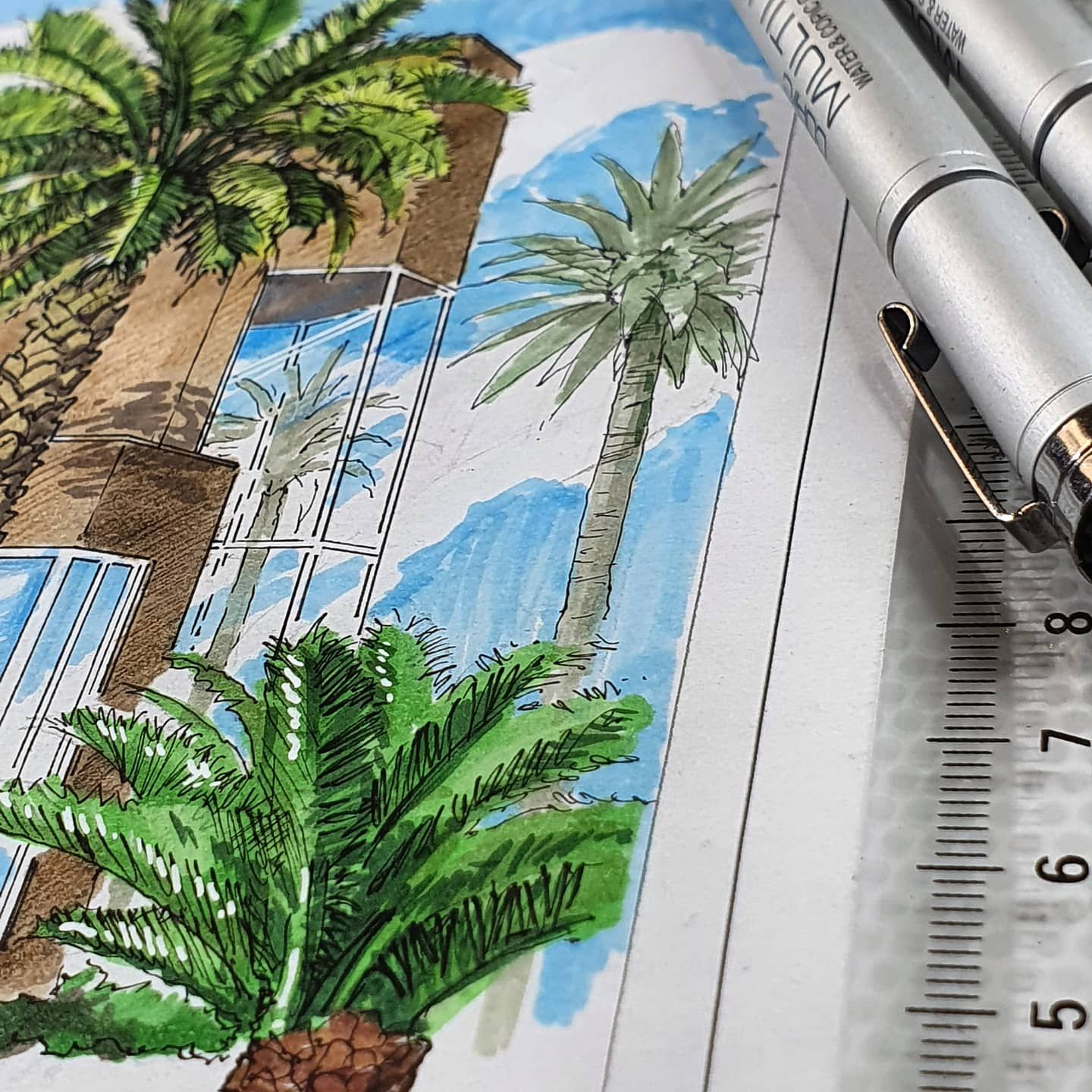 Illustration of a project made using two vanishing points for a residential client in partnership with Dreison & Santini architects, markers, ink and colored pencils.
