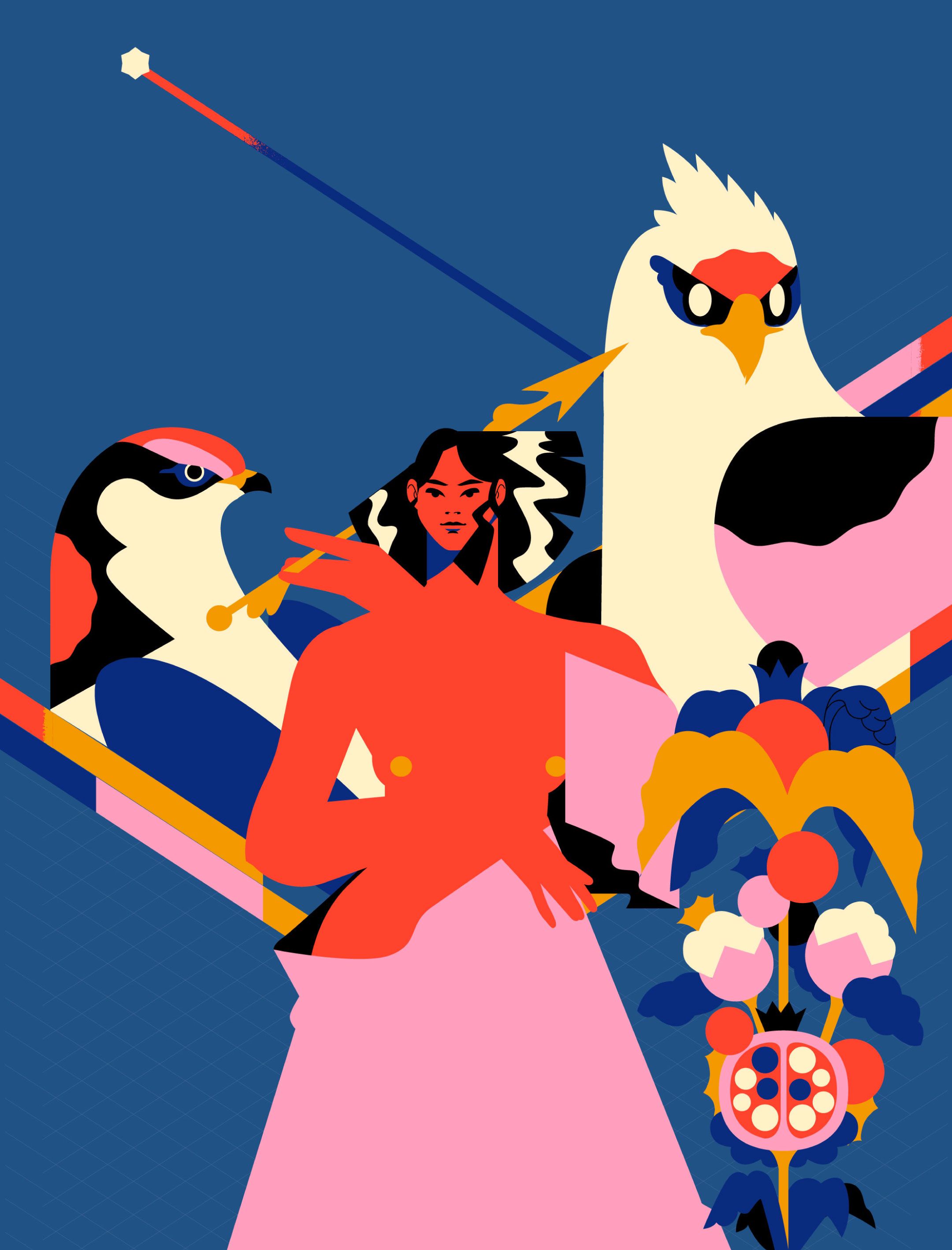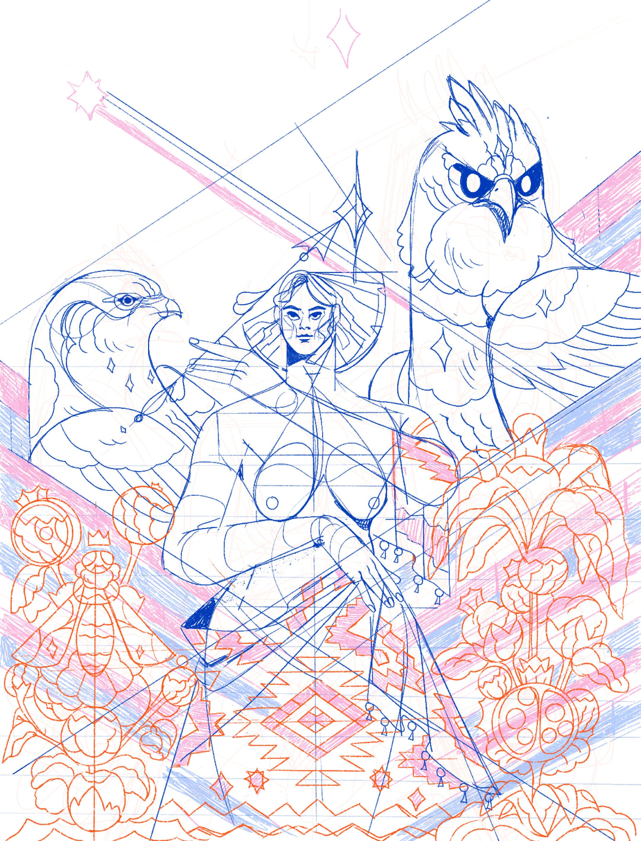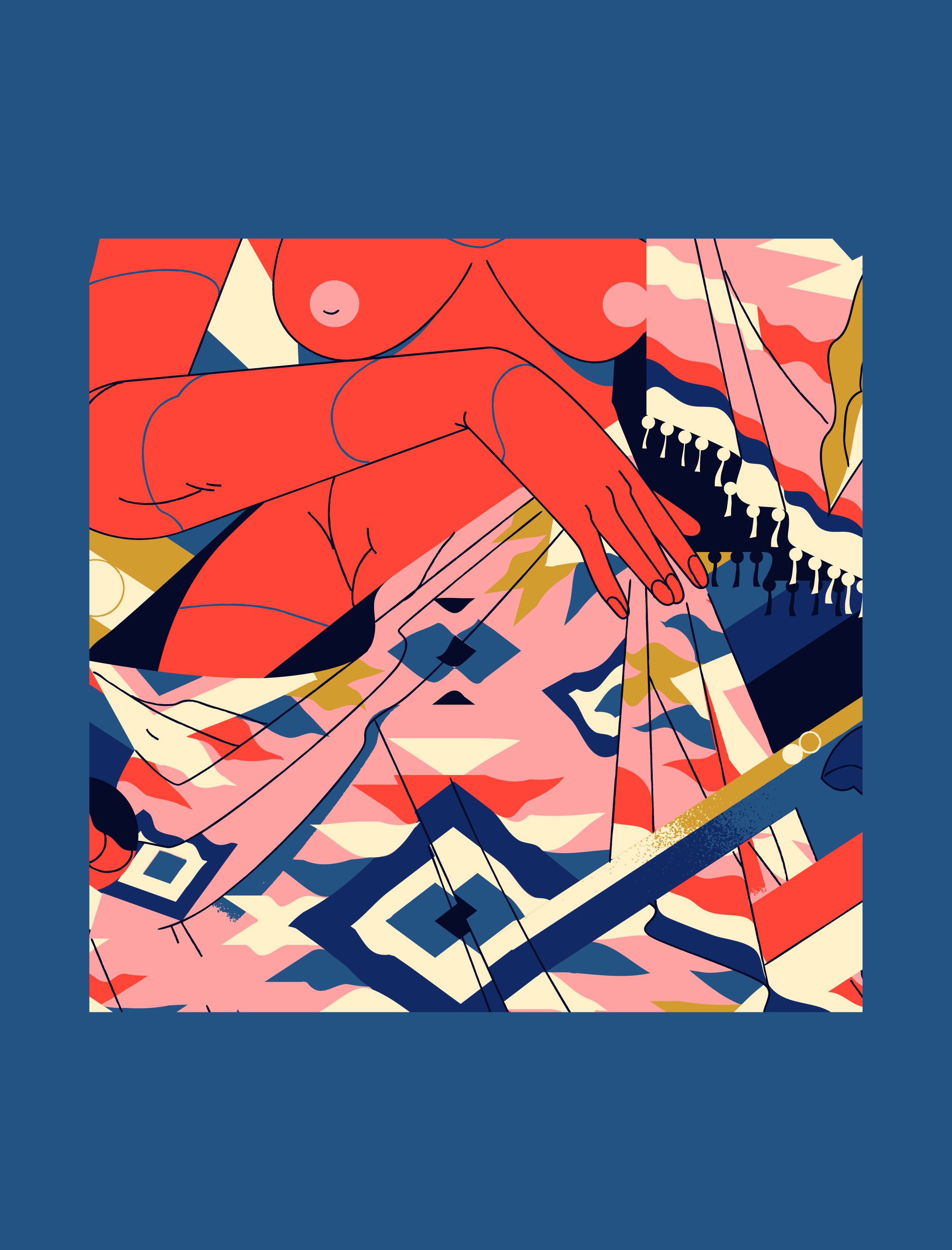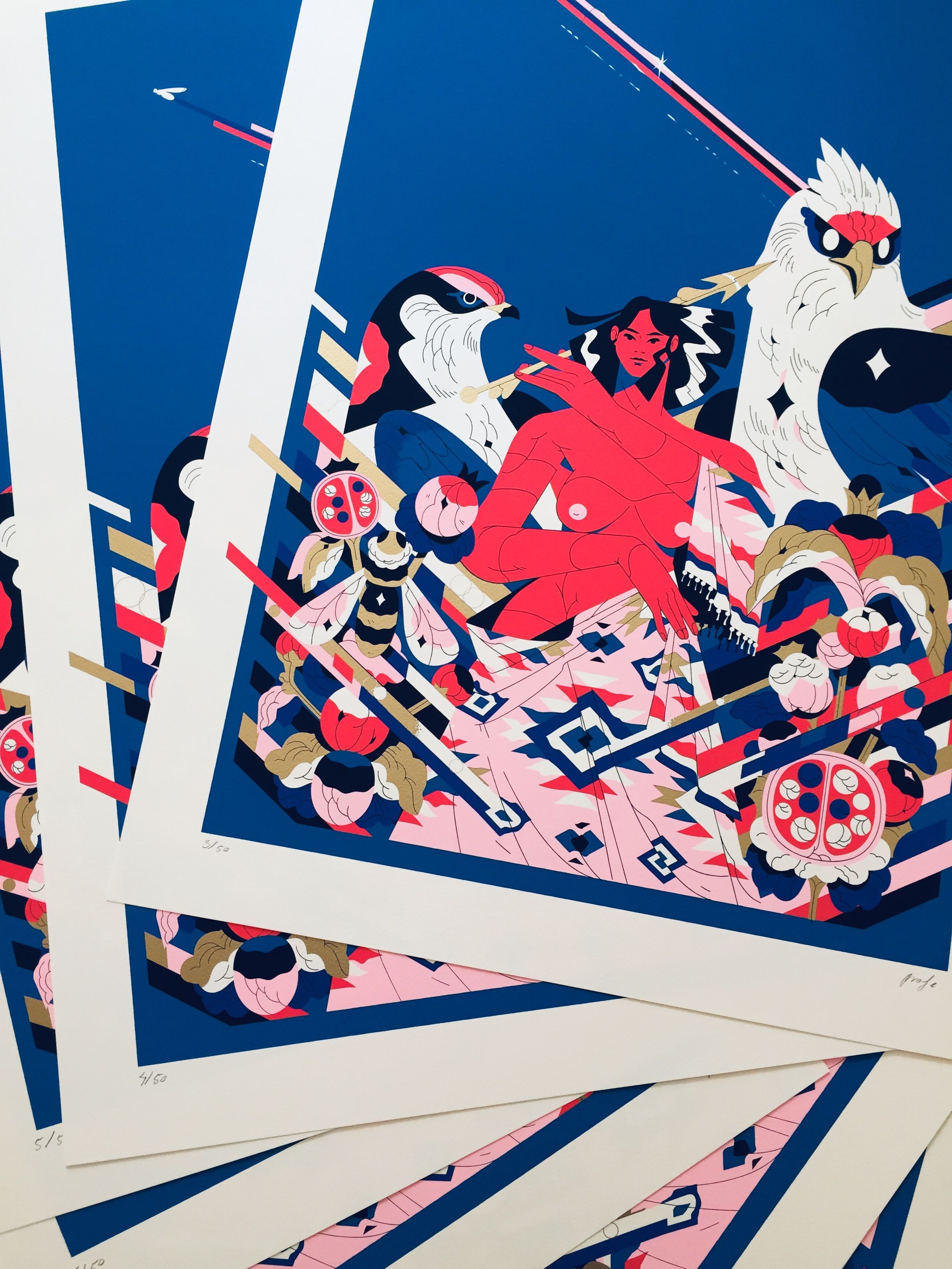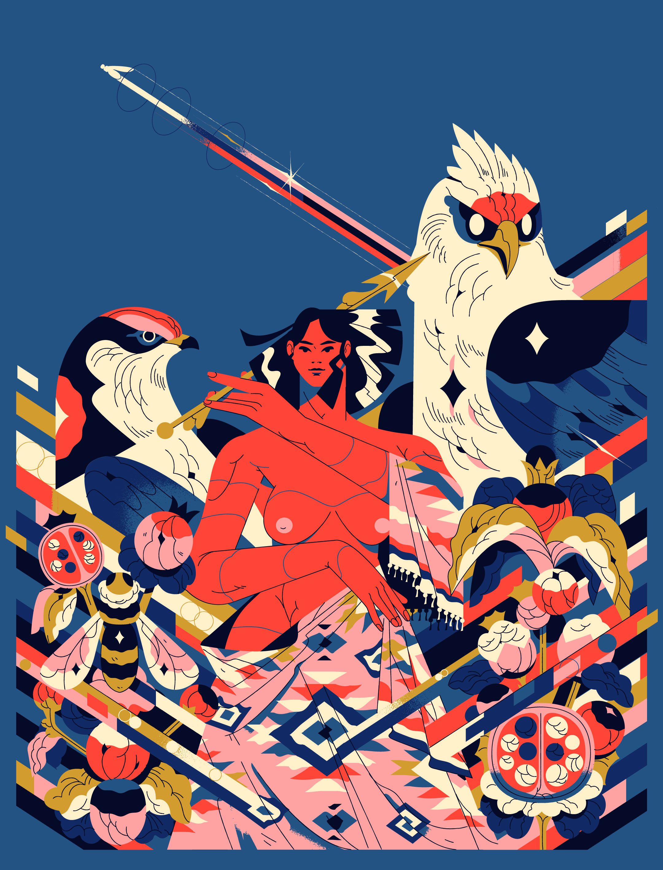 Ilustración inspirado en los textiles y en la gráfica de los videojuegos de la década de los 80'sComienzo siempre bajando un borrador en mi cabeza, que luego paso muy rápido a una hoja, solo para saber que quiero hacer.Una vez que tengo claro lo que quiero y no quiero hacer, boceto casi con líneas finales.Luego, cada parte de la ilustración la voy vectorizando para formar plastas.Al final coloco líneas negras (este proceso ayuda mucho para preparar el archivo en métodos de impresión como la serigrafía)Tuvo un final bonito impreso en serigrafía a 6 tintas en un formato de 46 cm x 66 cm. Realizado en taller 75 grados
