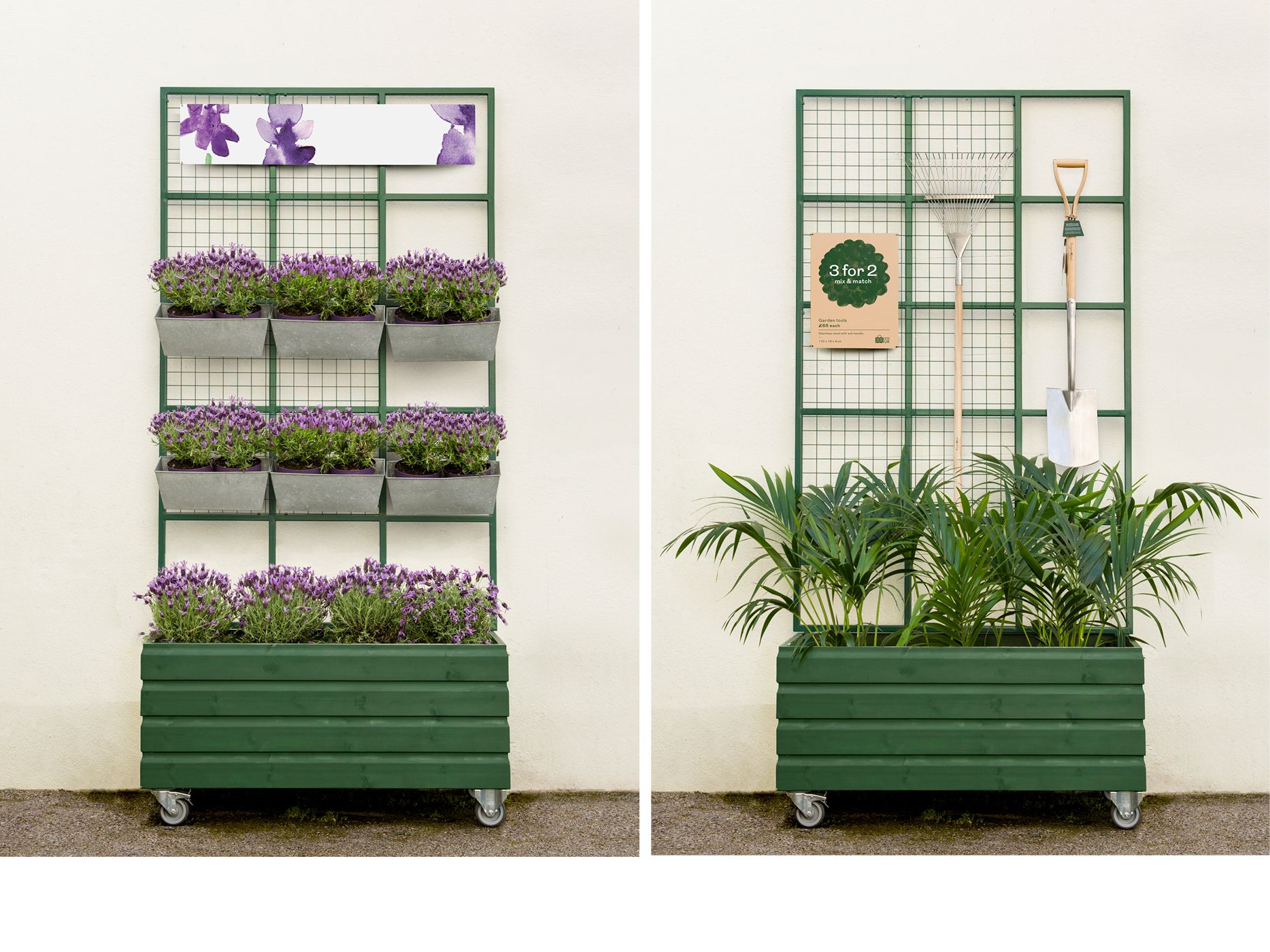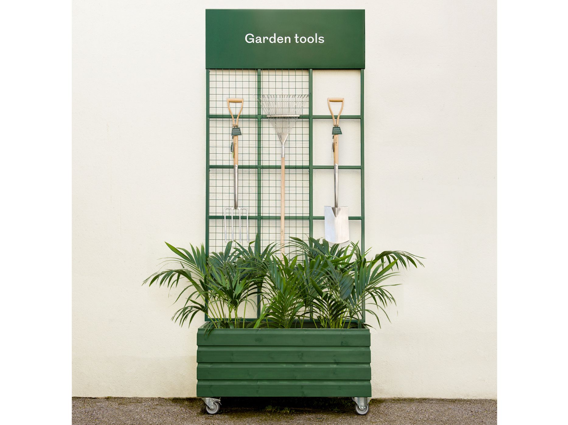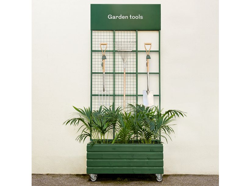 Designed to work indoors and outdoors. A combination of a grid display system and a planter base for multi-use, multiple application and versatile visual displays. Raised on wheels, making the unit mobile and easy to move around.
