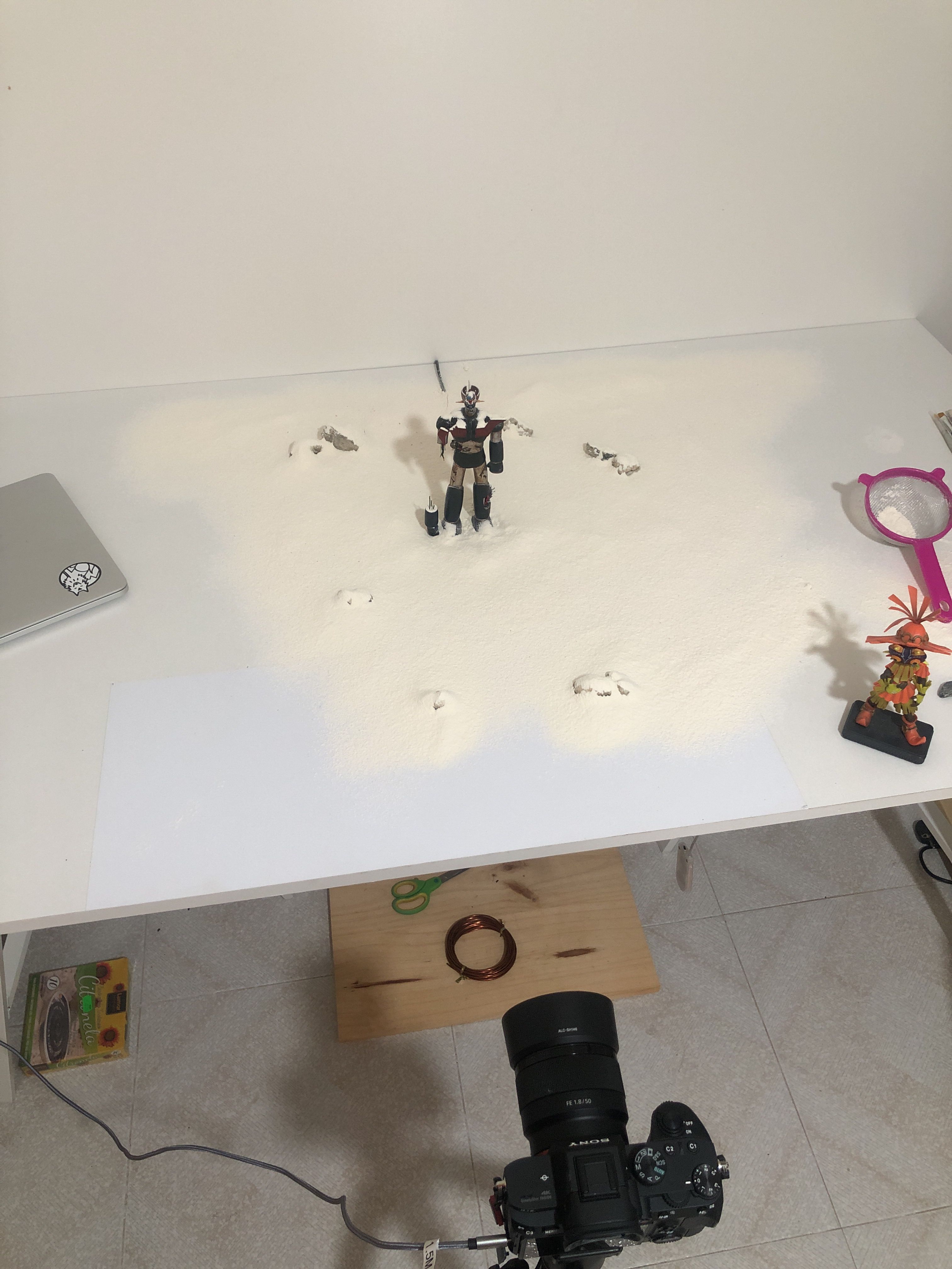 En pintura usé la gamma Vallejo para conseguir el efecto de óxido y perdida de fuel. Lo más complicado era como simular el desgaste del metal (la ventisca picando continuamente la coraza de Mazinger). Lo solucioné rociando antes con laca y con un colador espolvorear harina al Mazinger para que motas de harina se quedaran y diera el efecto.