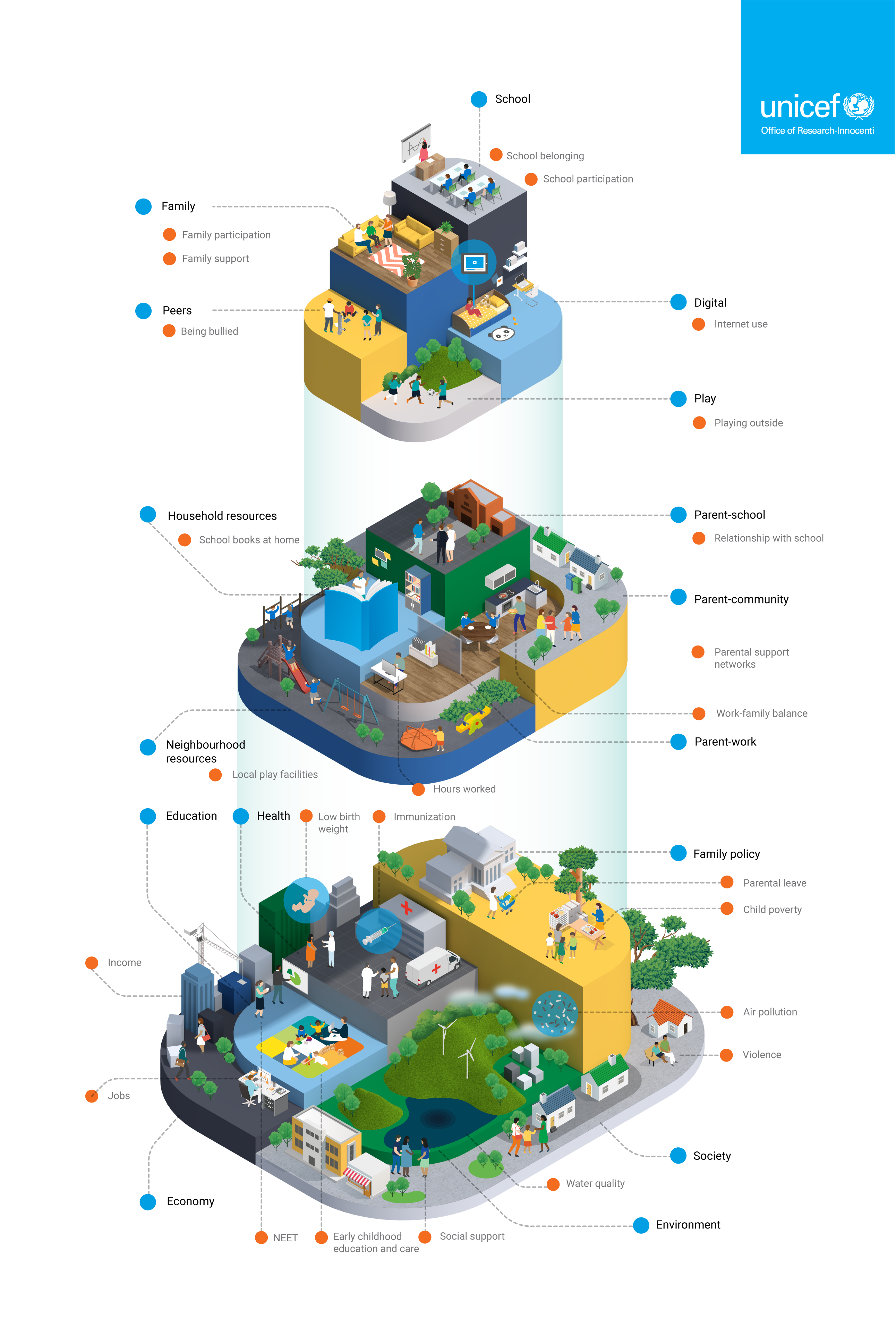 Not all children have an equal opportunity to reach their full potential. UNICEF Innocenti’s report have discussed on the reality of life for children in the wealthiest countries. Illustrator Jing Zhang has partnered up with development team at Stickeyes, and the communication specialists and officers at Unicef, bringing this report to life - Innocenti Report Card 16 microsite https://www.unicef-irc.org/child-well-being-report-card-16 where we dive deep into the activities, relationships, networks, resources, policies and context that combine to shape child well-being with a focus on 41 'rich' countries of the OECD and the EU.