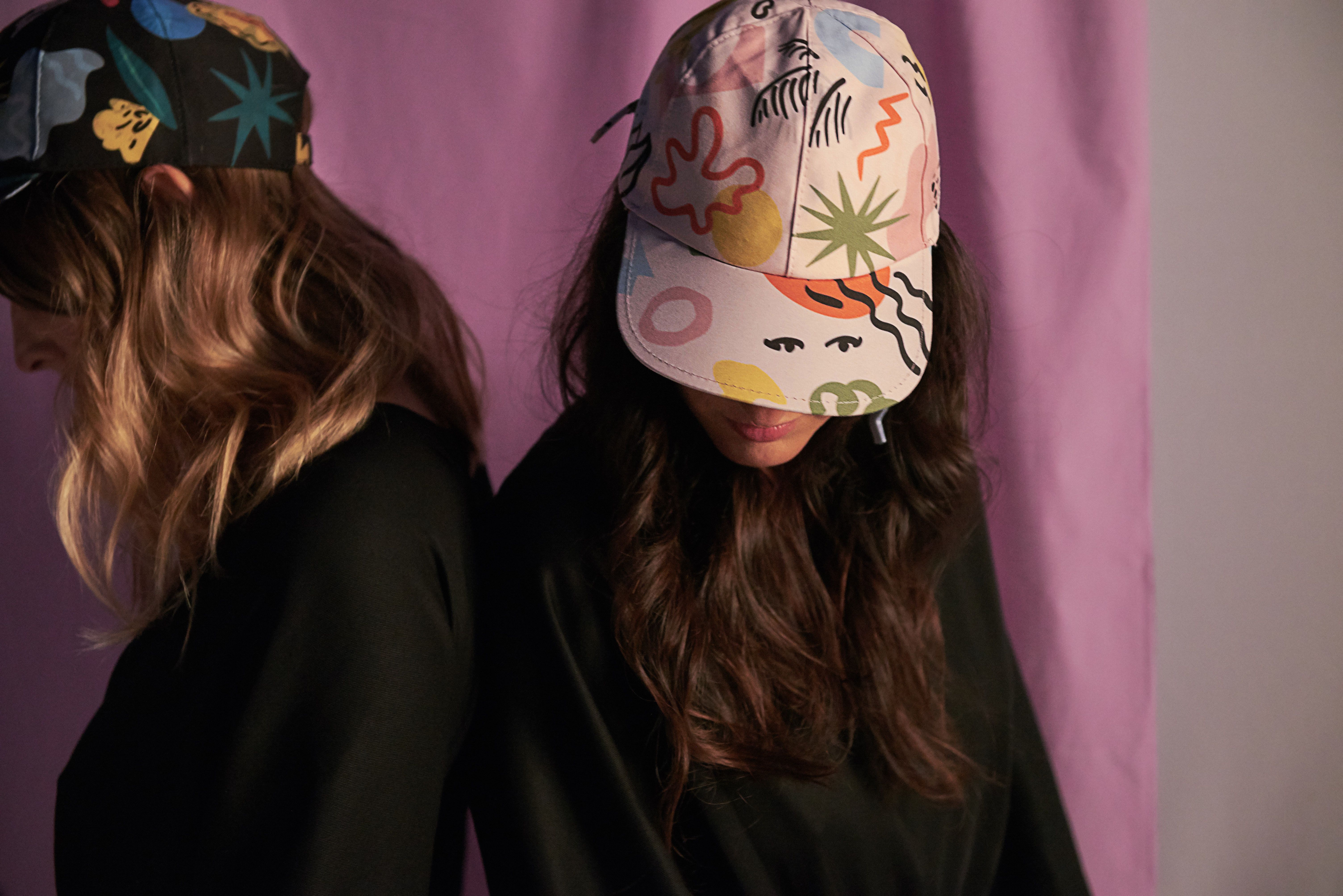 La gorras son de gabardina estampada por sublimación, forradas y confeccionadas a mano. Cuentan con un hebilla metálica para ajustarla a medida y vienen en dos colores: Rosa Jarana y Negra Pandora. Para esta colección también desarrollamos un tag especial para cada modelo que comunicaban el espíritu de la colaboración.
