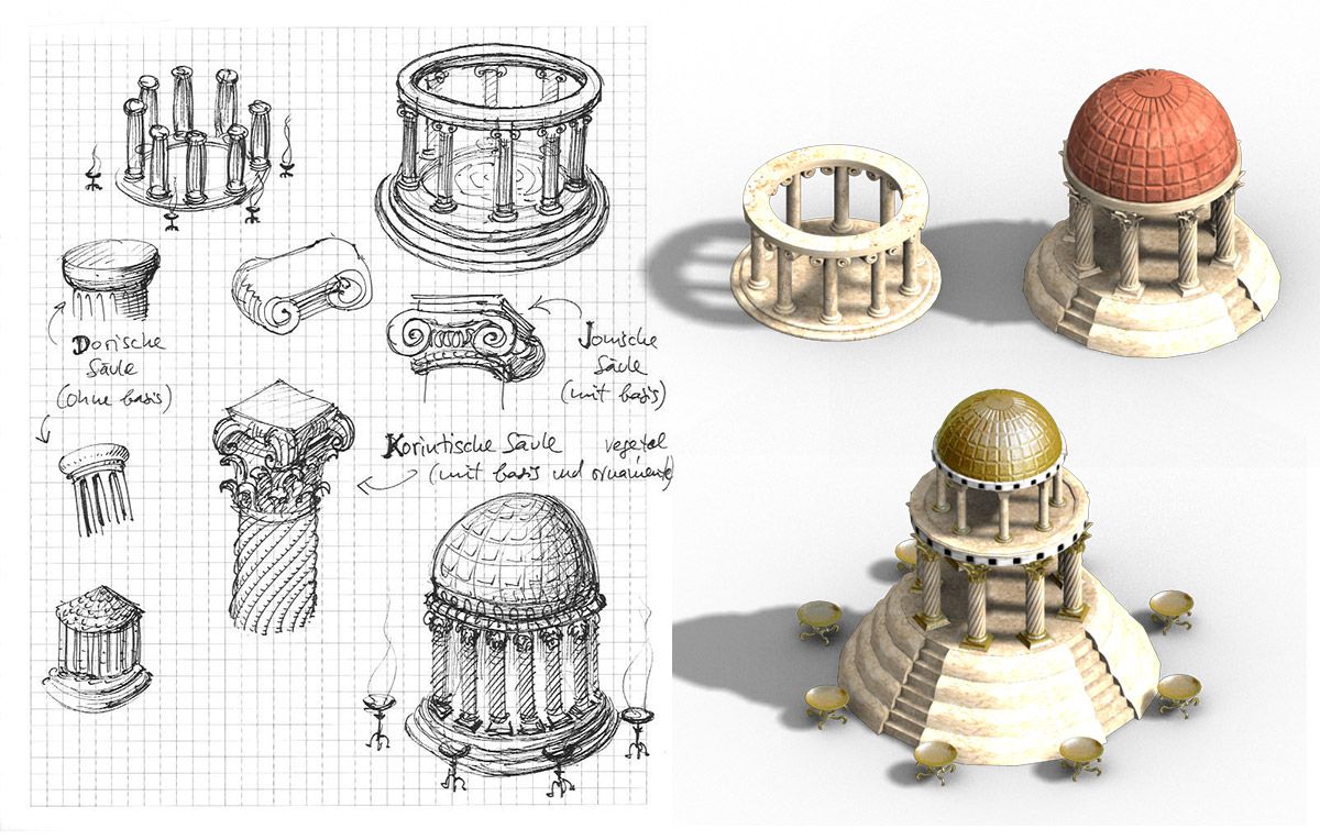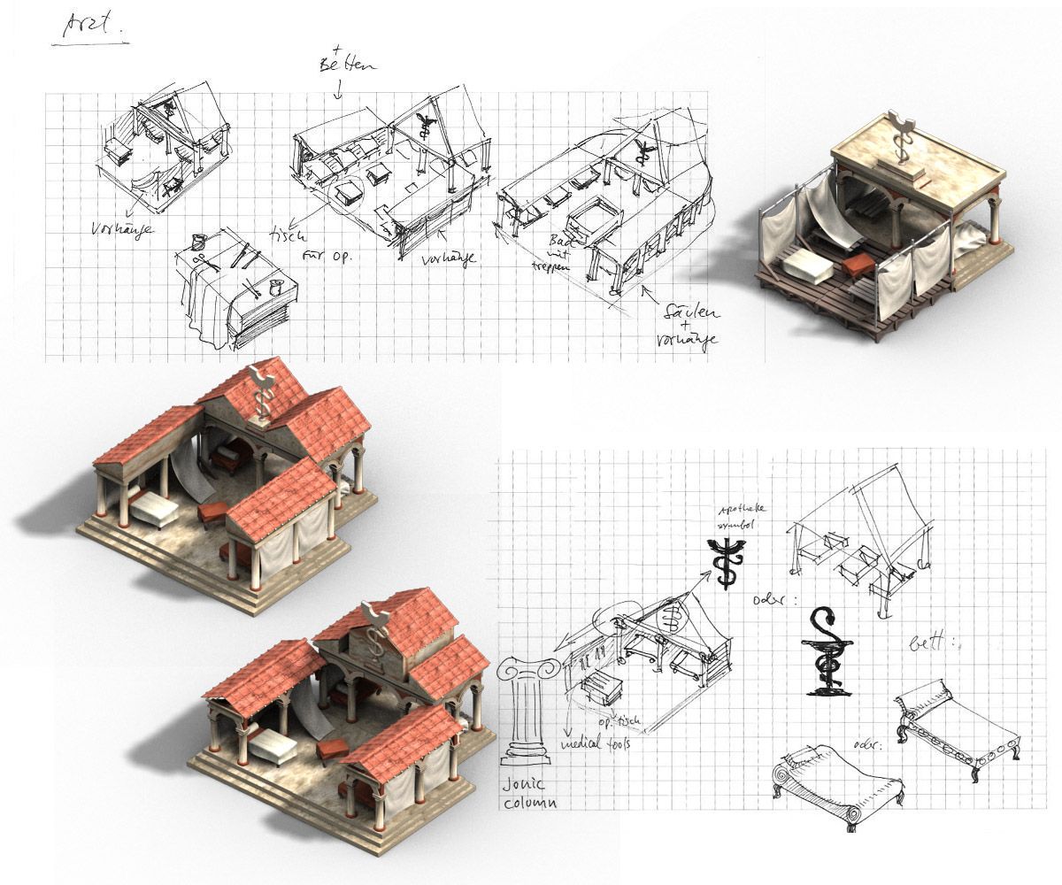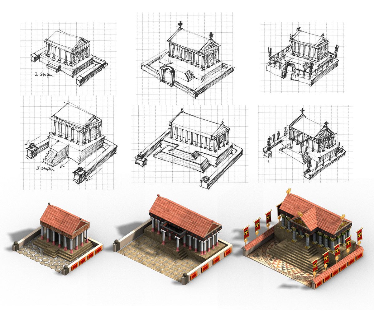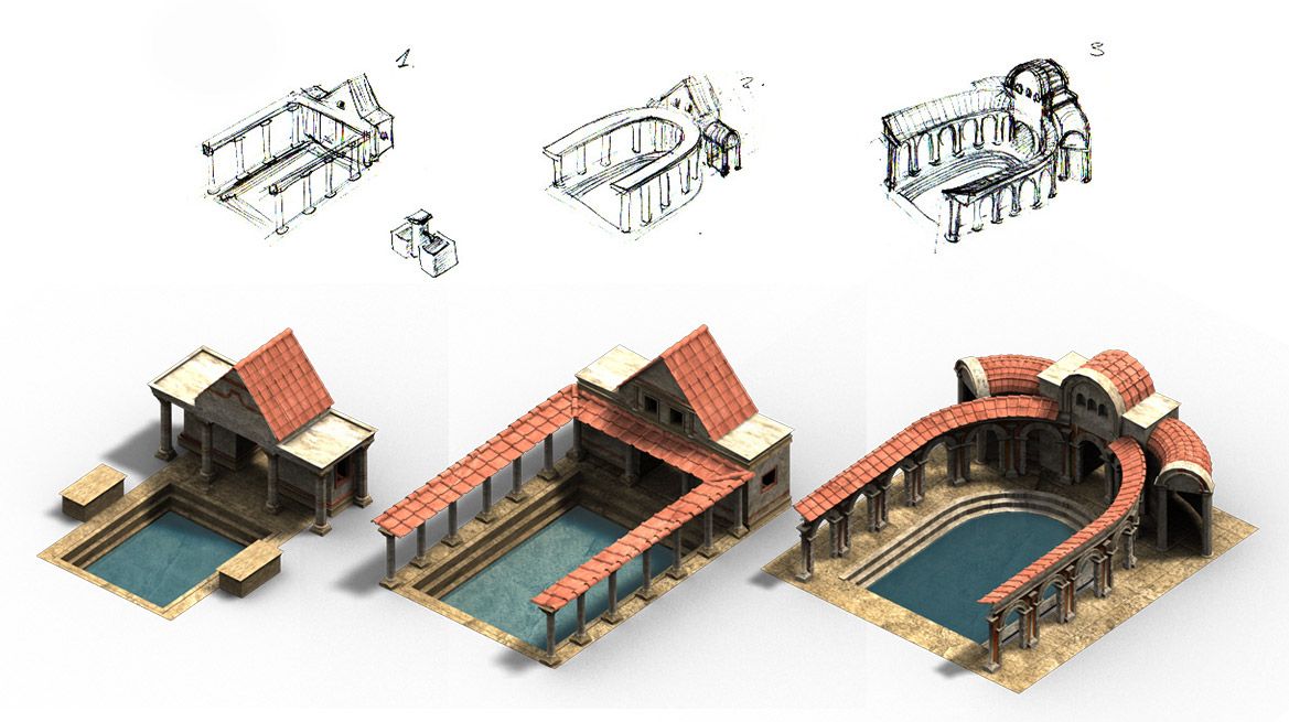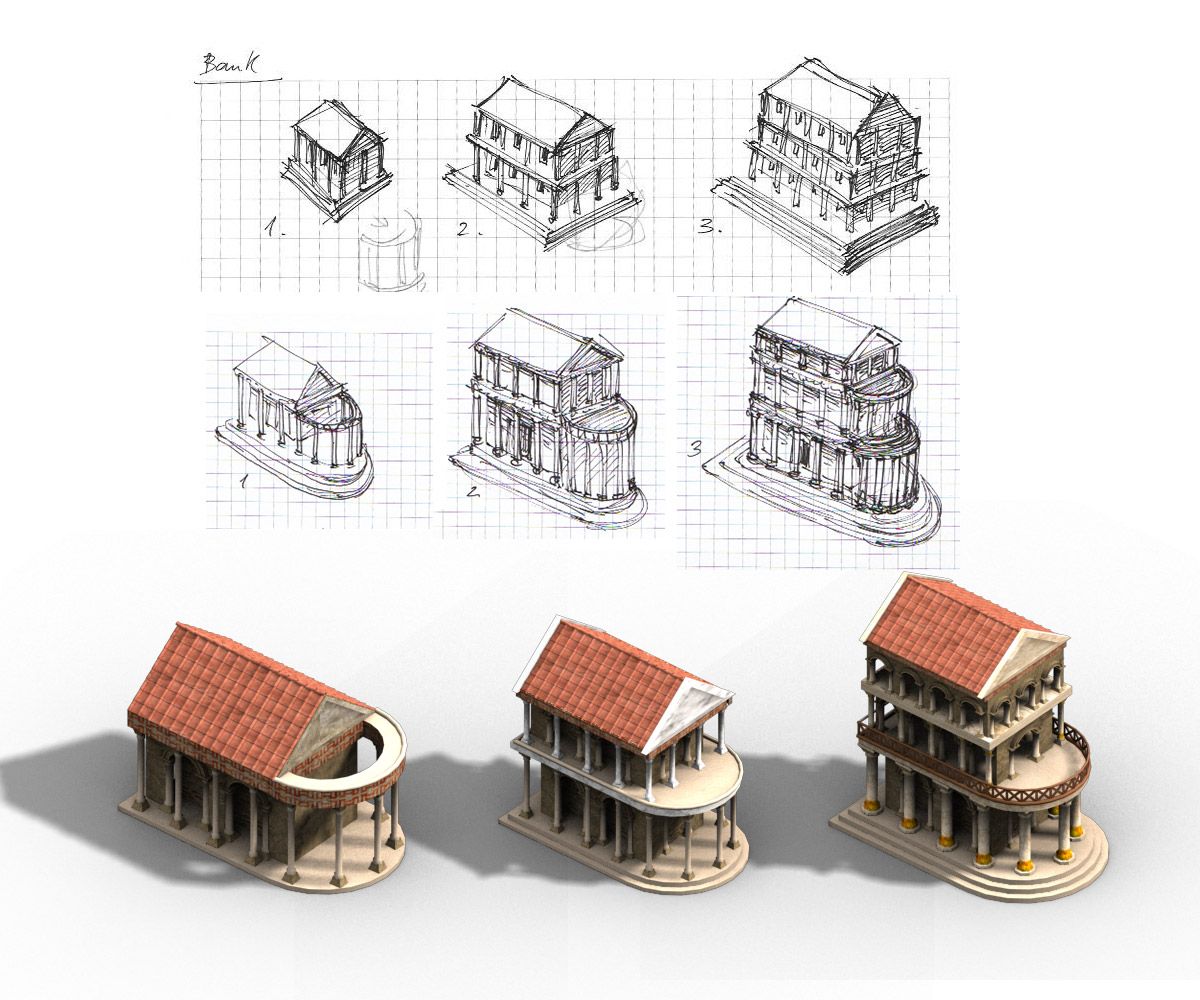 Me encargaron renovar muchos de los antiguos edificios romanos del juego. Y eso incluía la fase de concept art, bocetaje de ideas para estructuras arquitectónicas y edificios, para acabar ejecutándolos en 3D, aunque los gráficos son prerenderizados en el juego y no en 3D a tiempo real, pues había de ejecutarse en un navegador con los mínimos recursos posibles.
