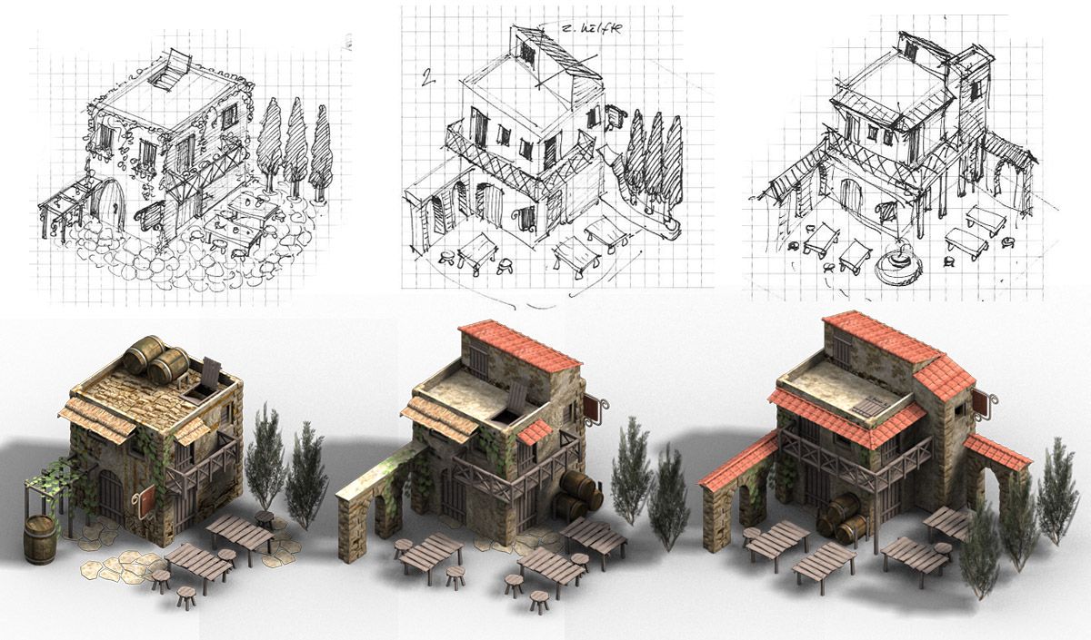 El proceso consistió de un simple papel y rotulador al principio, y luego esos bocetos me sirvieron como referencia para modelar los edificios con 3D Studio Max. También utilicé Adobe Photoshop para retocar texturas.