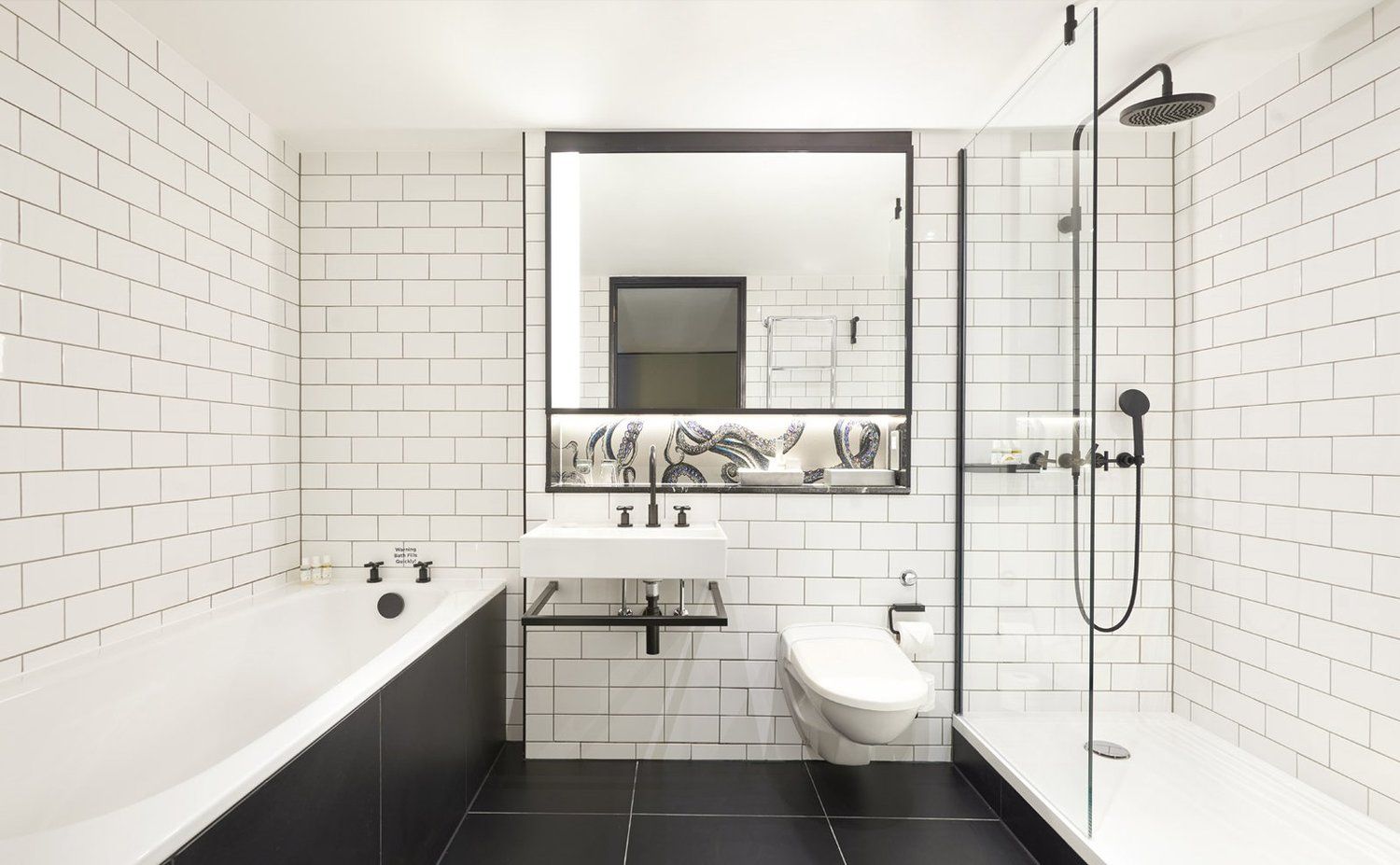 The bathrooms preserve the clean, timeless metro tiles from the original design, complemented by a number of new, modern features including black Dornbracht brassware and a contemporary floating sink by Laufen.