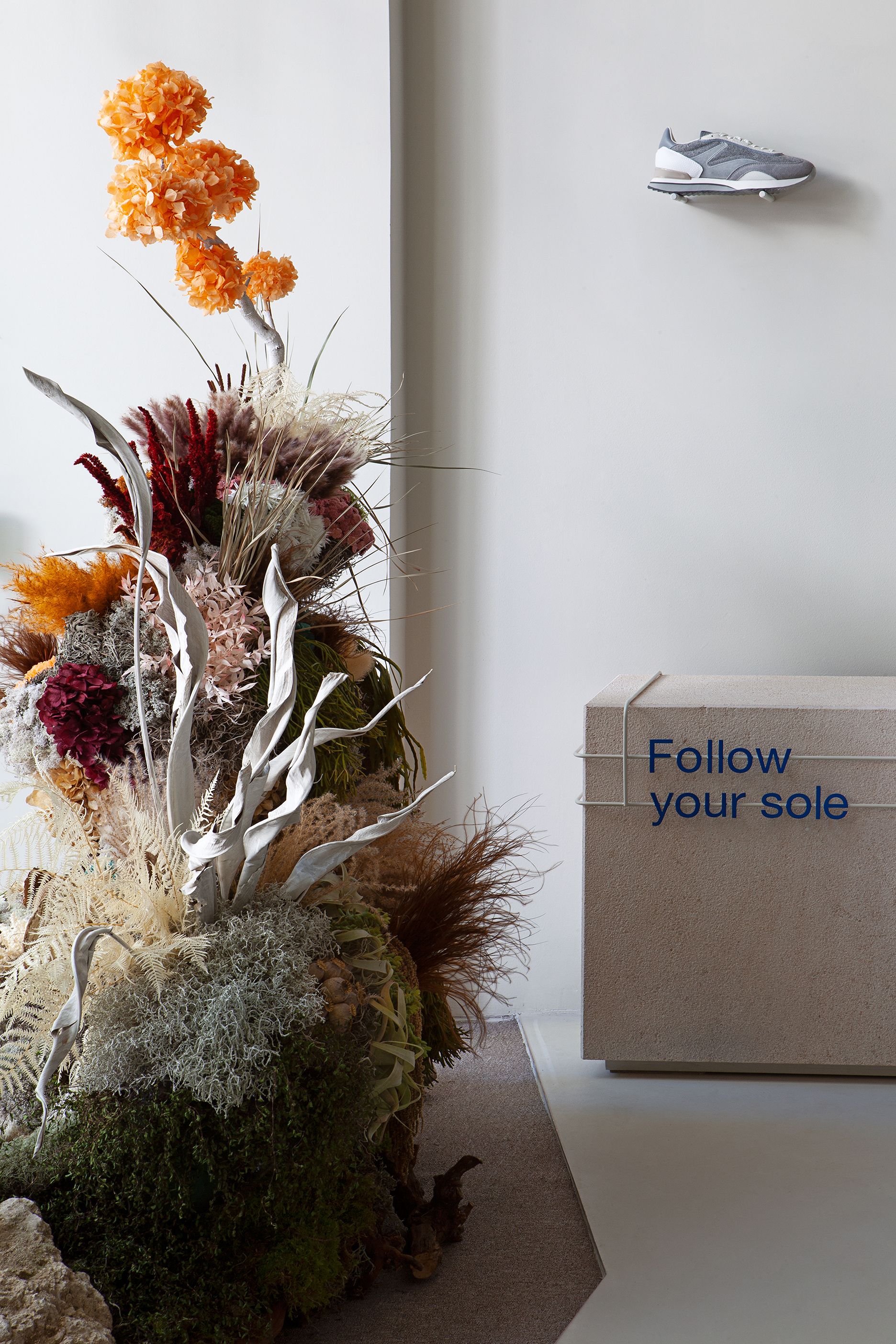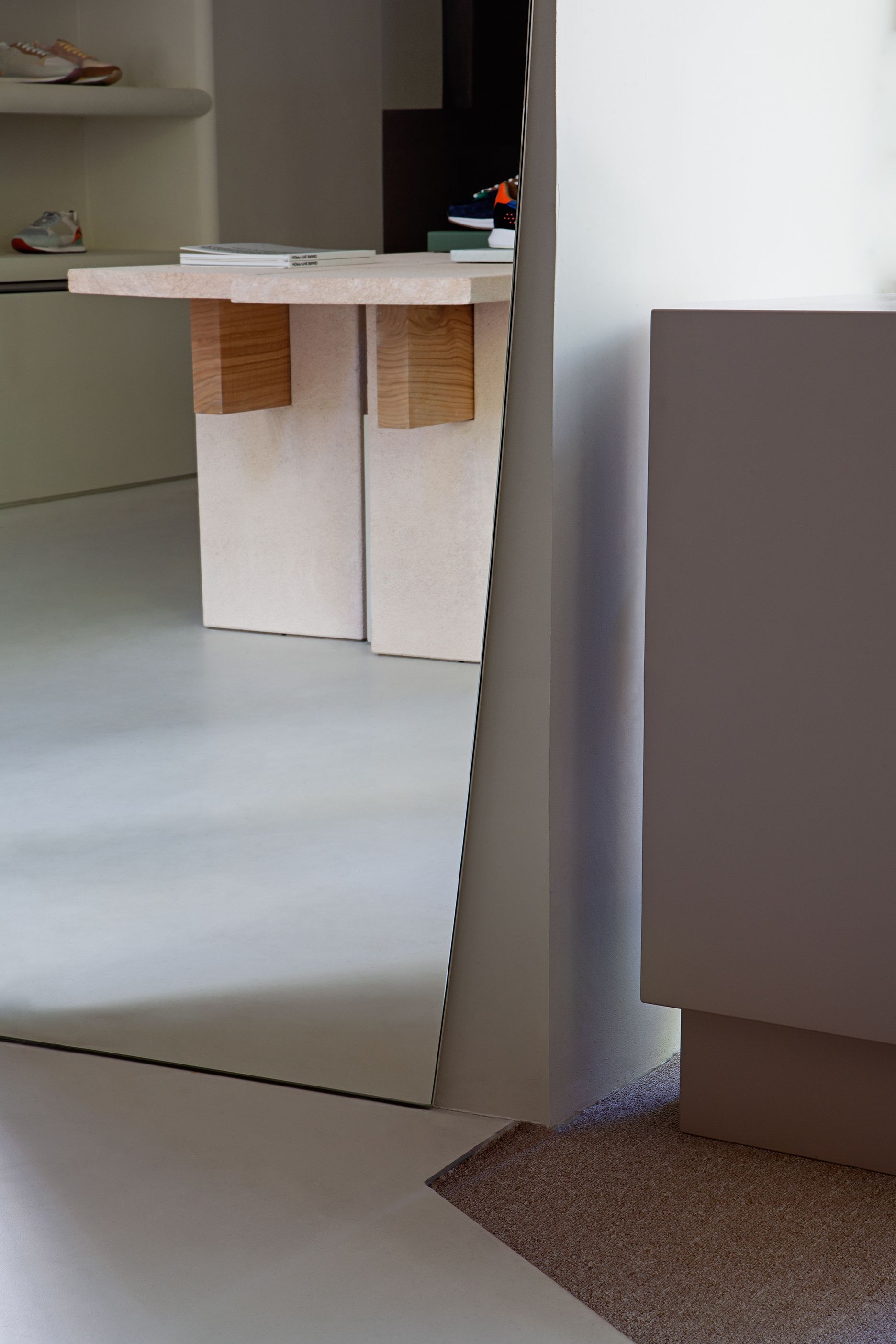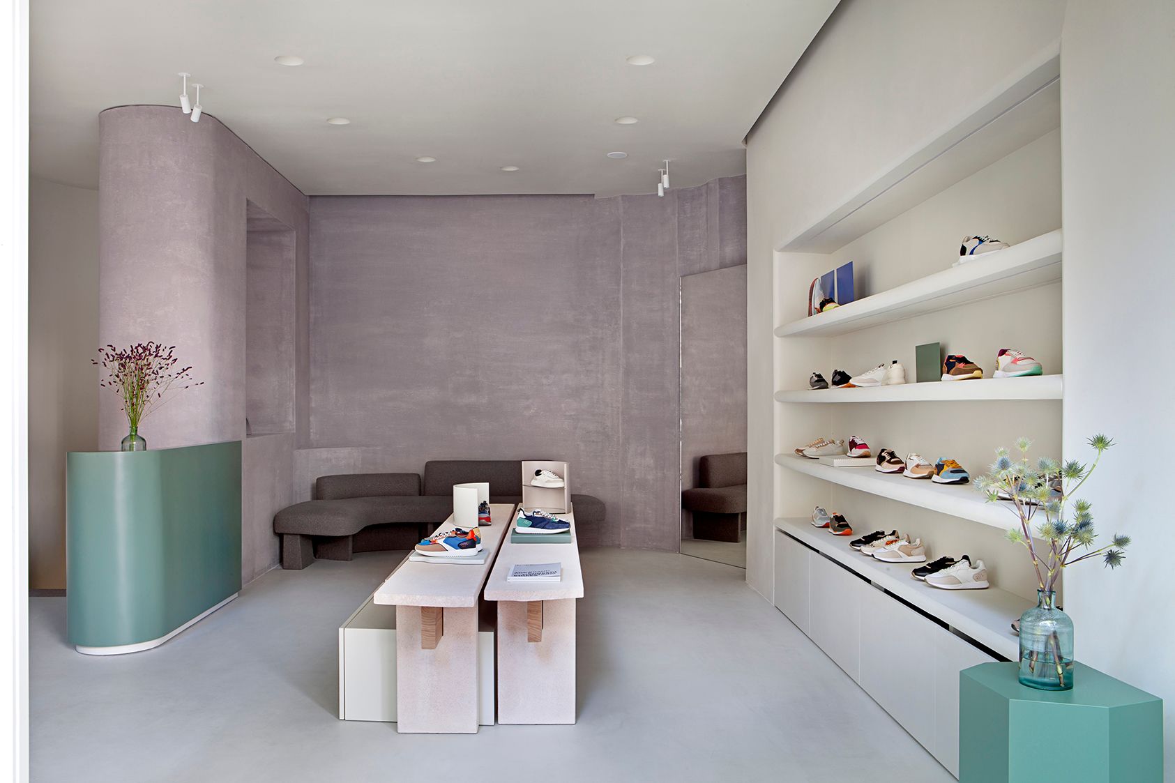 The brands’ products are colourful and unisex and these features were taken in consideration for the final design. Shoes are the protagonists in the store, the finishes of the interior architecture orbit around these focal points, being neutral and respectful in a soft colour palette composed by pink, grey gradient and pale washed greens tones. The materials, such as marble, stone and lacquered metal are the hard solutions for a soft balance between architecture and products to display. All this, combined with a hand-made resin floor application, conveys a zen-like sense of spatial harmony.