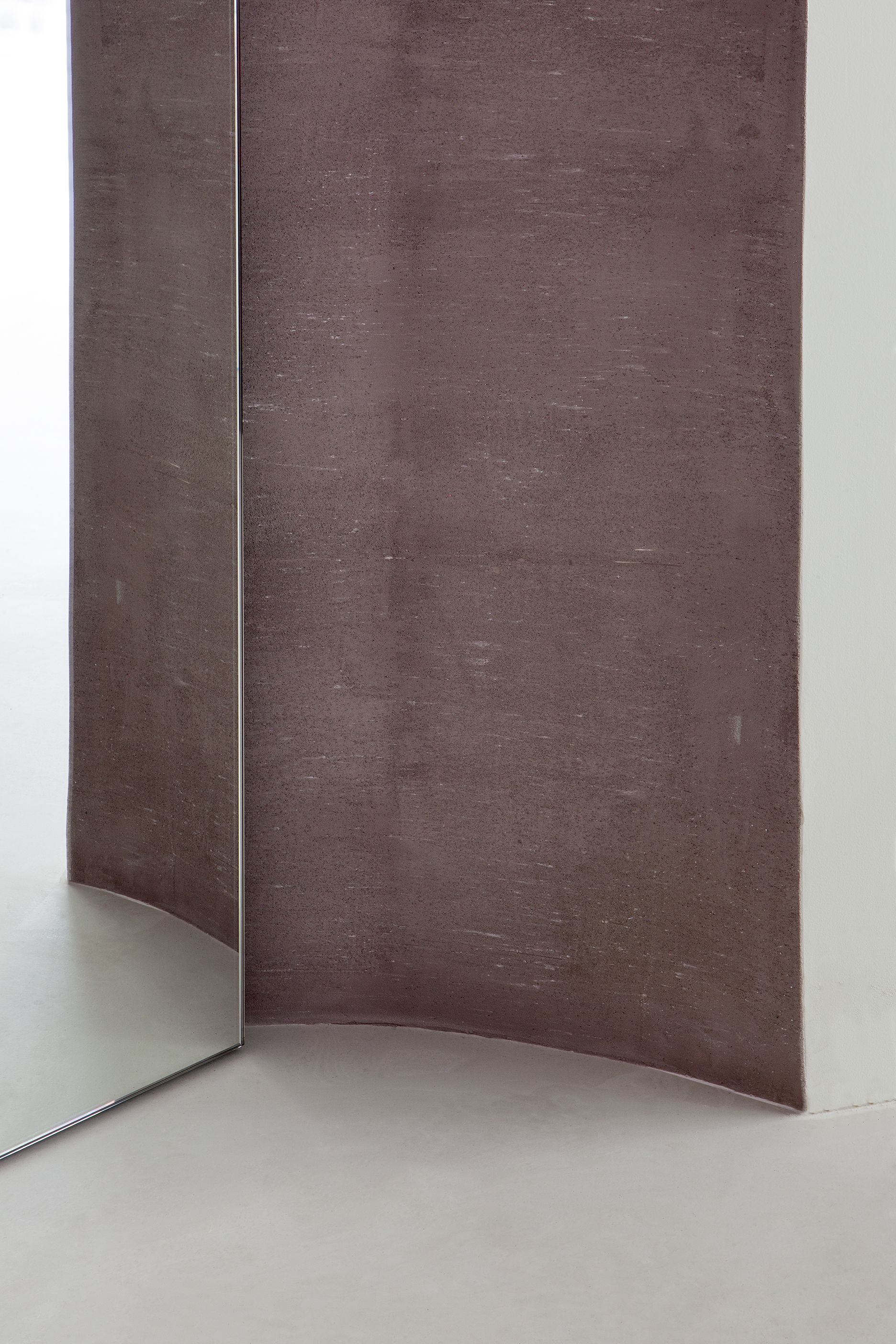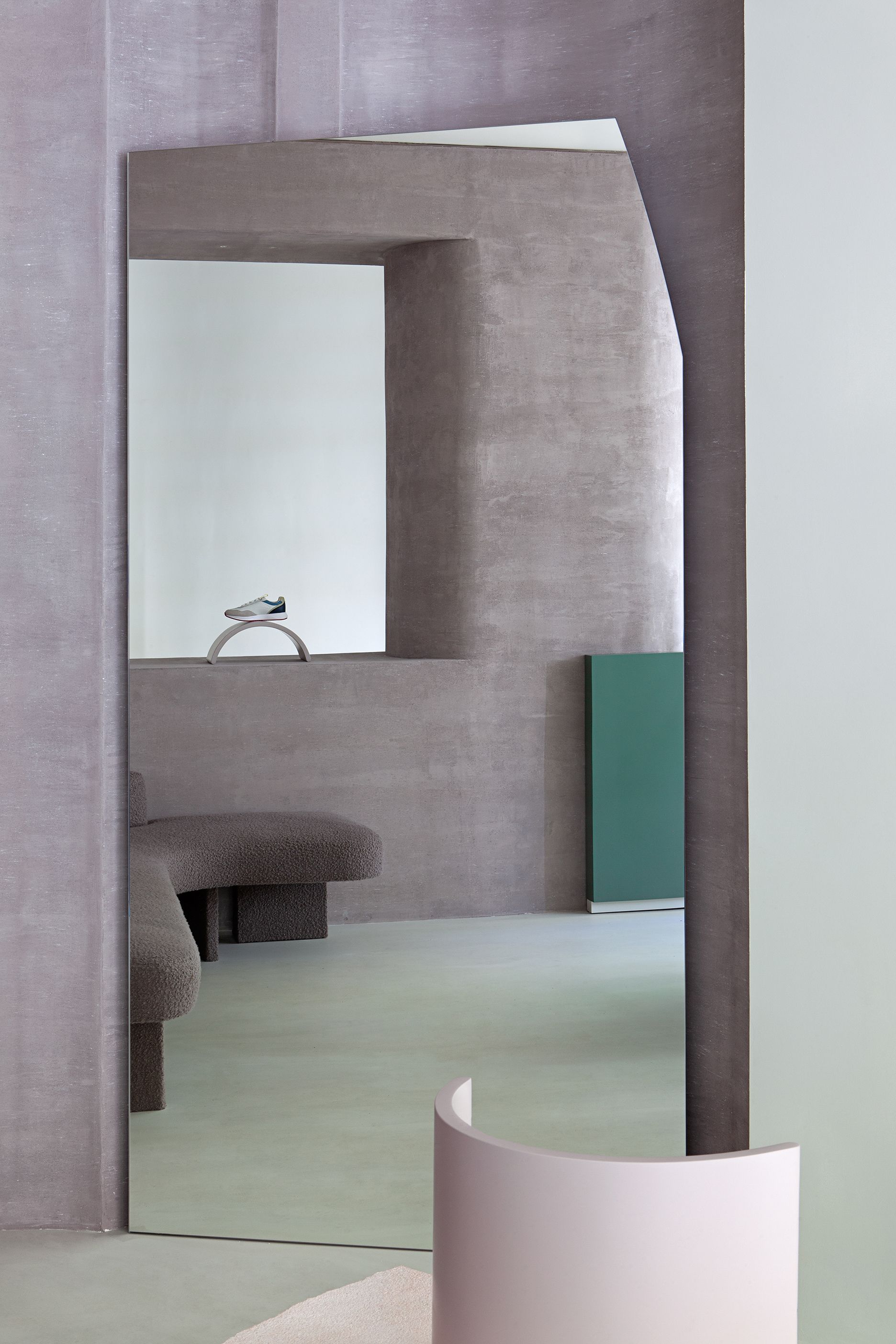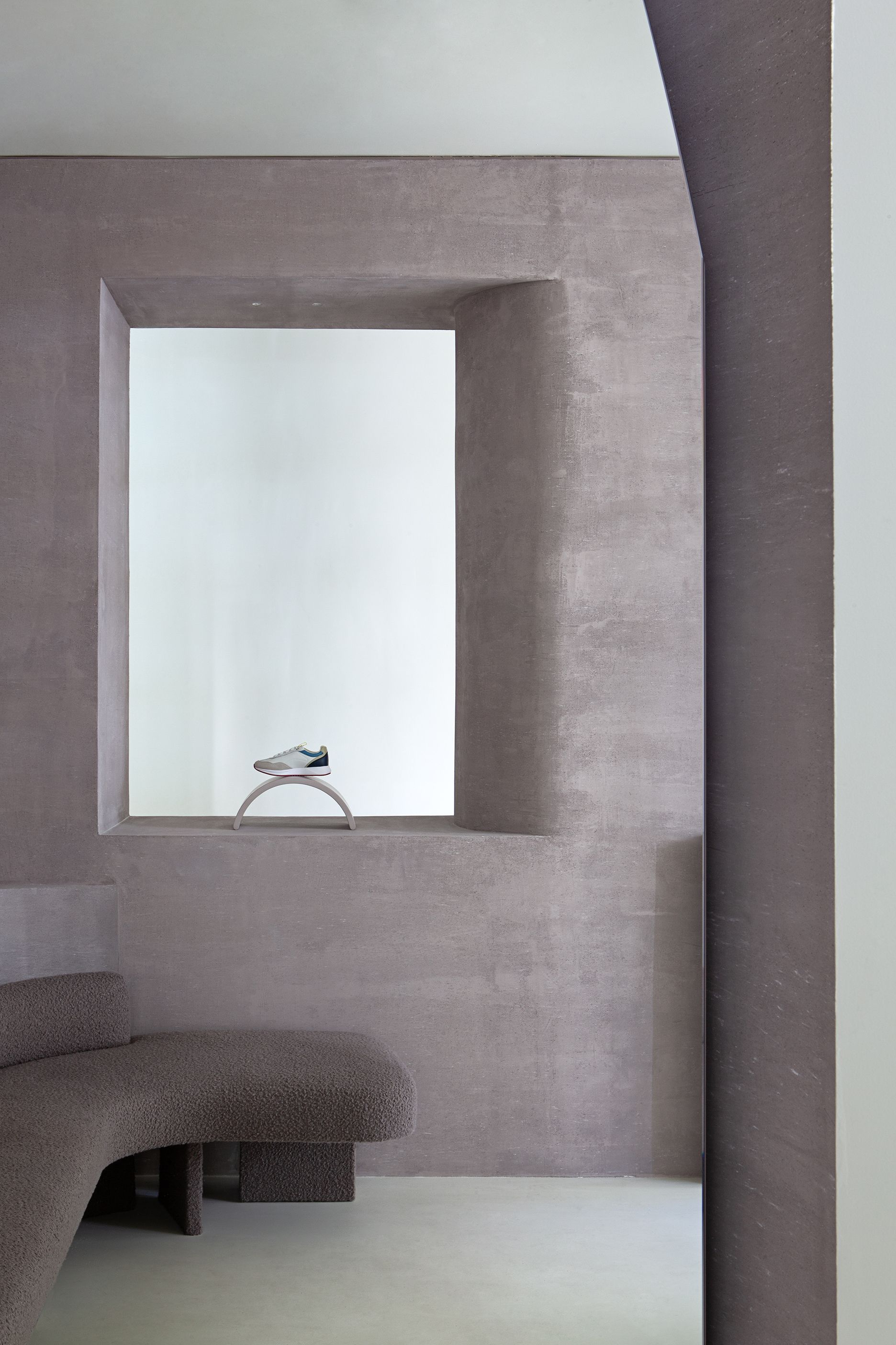 The curved walls are treated with a layer of pink-mauve pigmented cement called “Mountbatten Pink” (known to be the color used for the naval camouflage by the British Royal Navy during World War II). Large mirrors are used in the corners to widen the space and reflect the customers during the fitting moment.