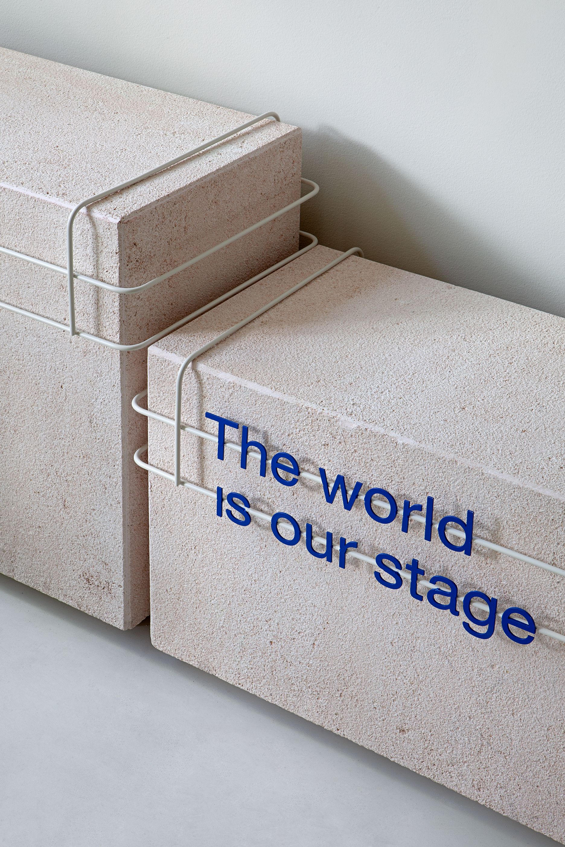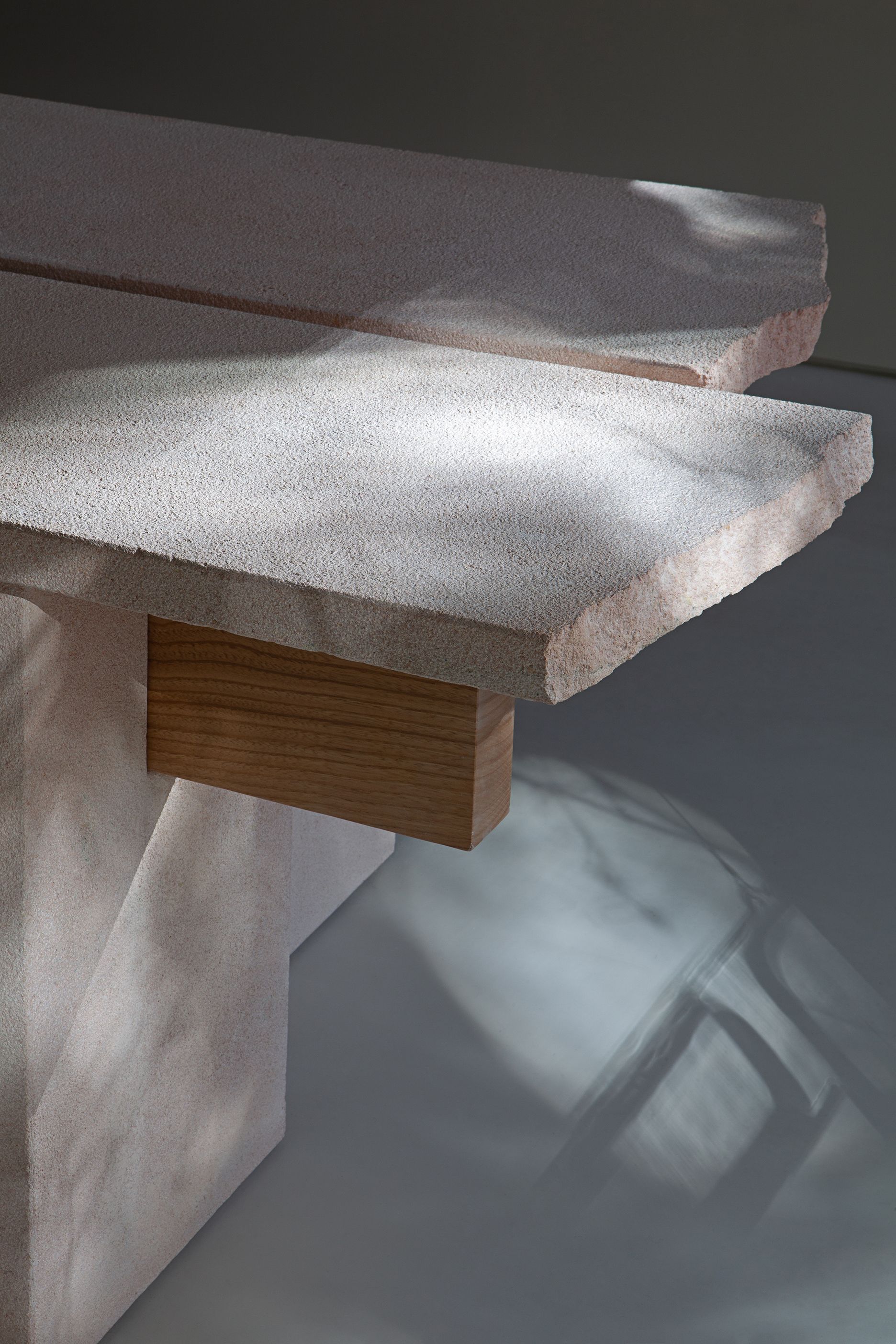 The store is entirely furnished with bespoke pieces, such as the sofa, tables, props and visual accessories. The sofa is finished with tweed Bouclé textile, similar to a woven pattern. The central area is revolving around two Sepulveda Stone tables, a traditional material of the Madrid region that provides a sense of natural earthiness. The stone finish resembles somehow the limestone and sandstone in a beige salmon tone.