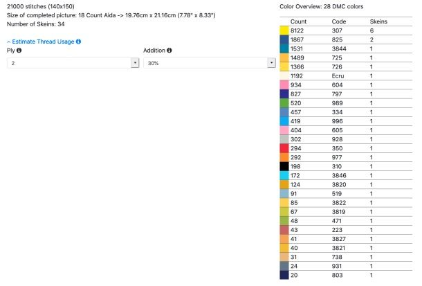 Avant de créer le motif, Pixel Stitch vous permet de personnaliser le nombre de points, la taille de votre tissu et de choisir le nombre de couleurs que vous souhaitez utiliser, tout en indiquant les numéros exacts des marques de fil DMC, Anchor et Sulky.