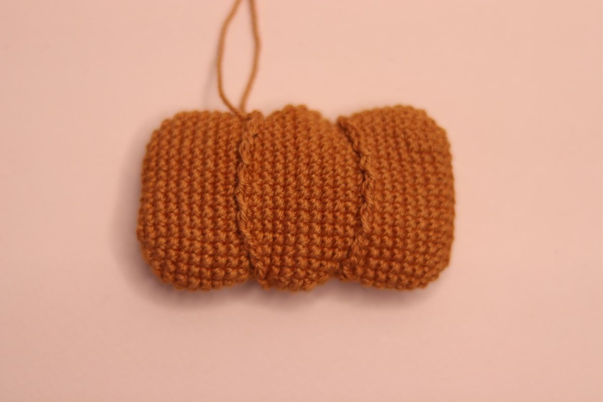 Rang 1 : inc, 9 sc, 4 sc ensemble dans le ch, 9 sc, inc [26].