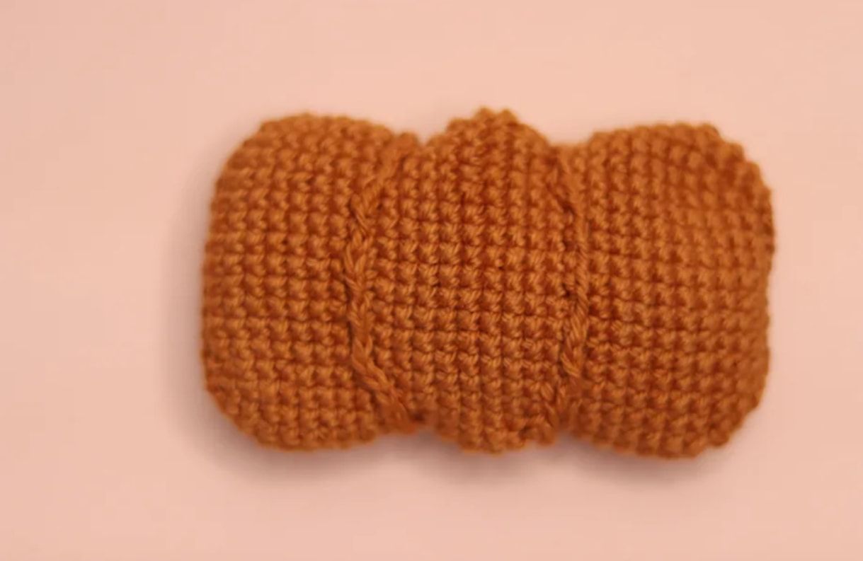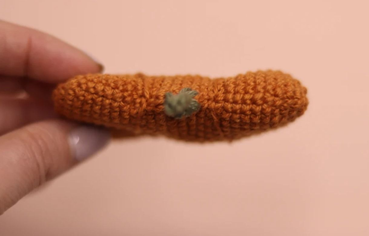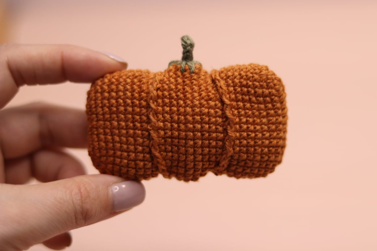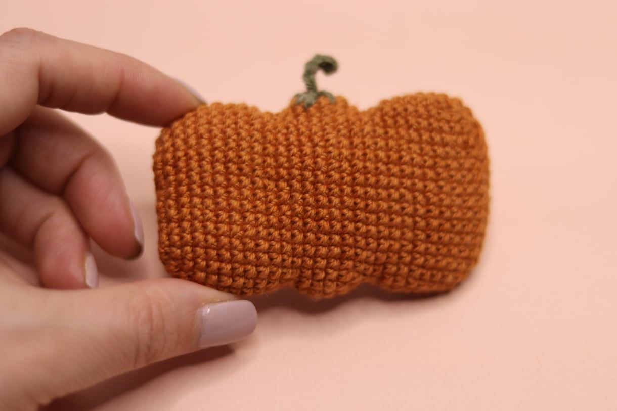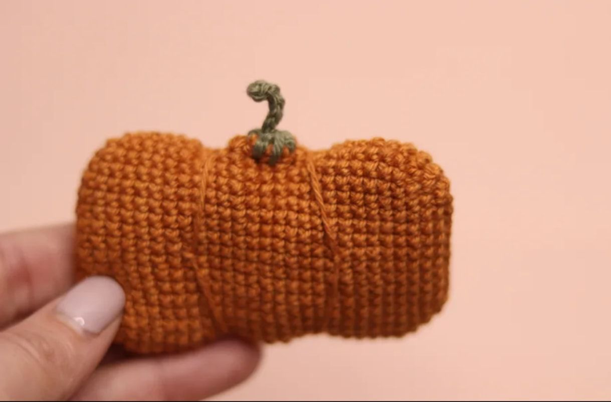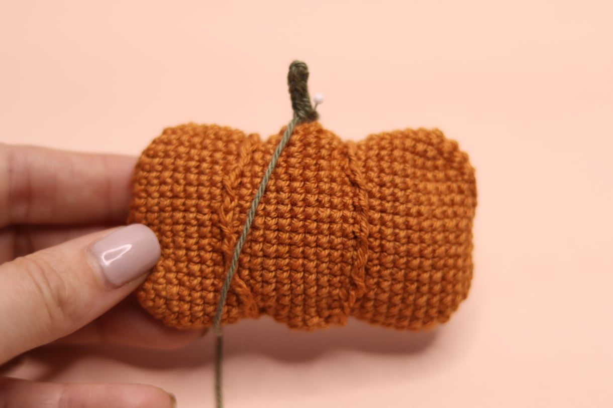 3. Une fois la citrouille rembourrée et cousue, nous devons retoucher les lignes distinctes de son corps. Pour ce faire, prenez le fil orange et l'aiguille à crochet, faites un noeud plat et fixez-le avec un point glissé (sl st) sur le fil exposé des côtés de la citrouille, là où se trouve la courbure. À partir de là, faites tout le tour en crochetant des points glissés dans chaque brin exposé.