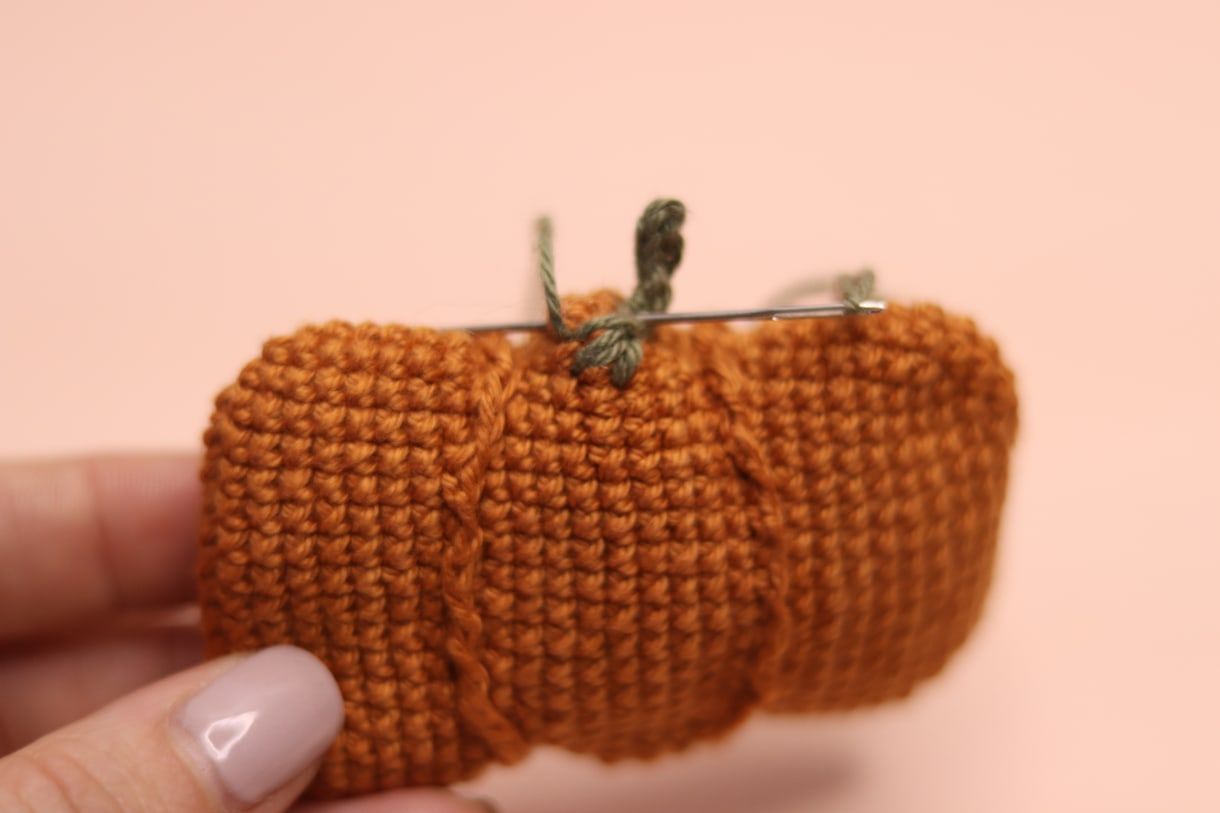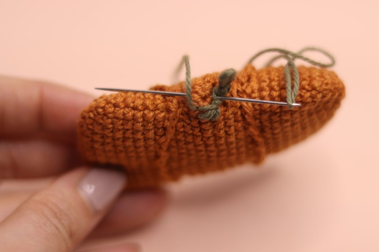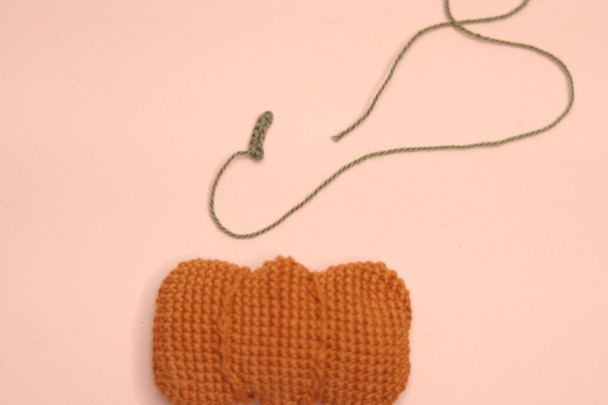 6. Coupez le long fil pour le coudre au centre de la partie supérieure de la citrouille. Ce fil est utilisé pour coudre la tige ainsi que pour former sa base avec plusieurs points autour.