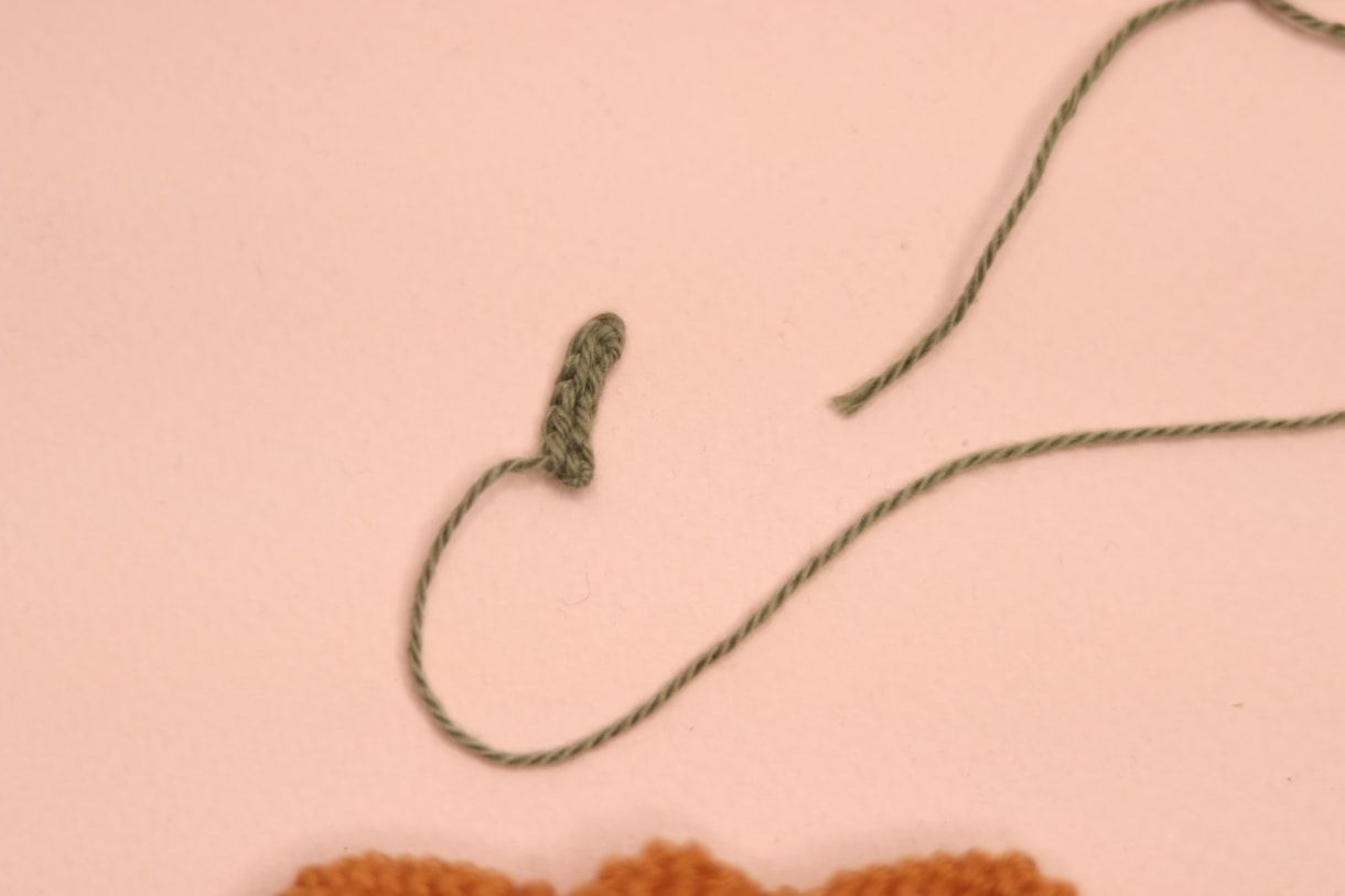 5. Pour la tige verte, on crochète une chaîne de 7 mailles et on la recouvre à partir de la 3ème maille avec des mailles coulissantes (une maille coulissante dans chaque maille).