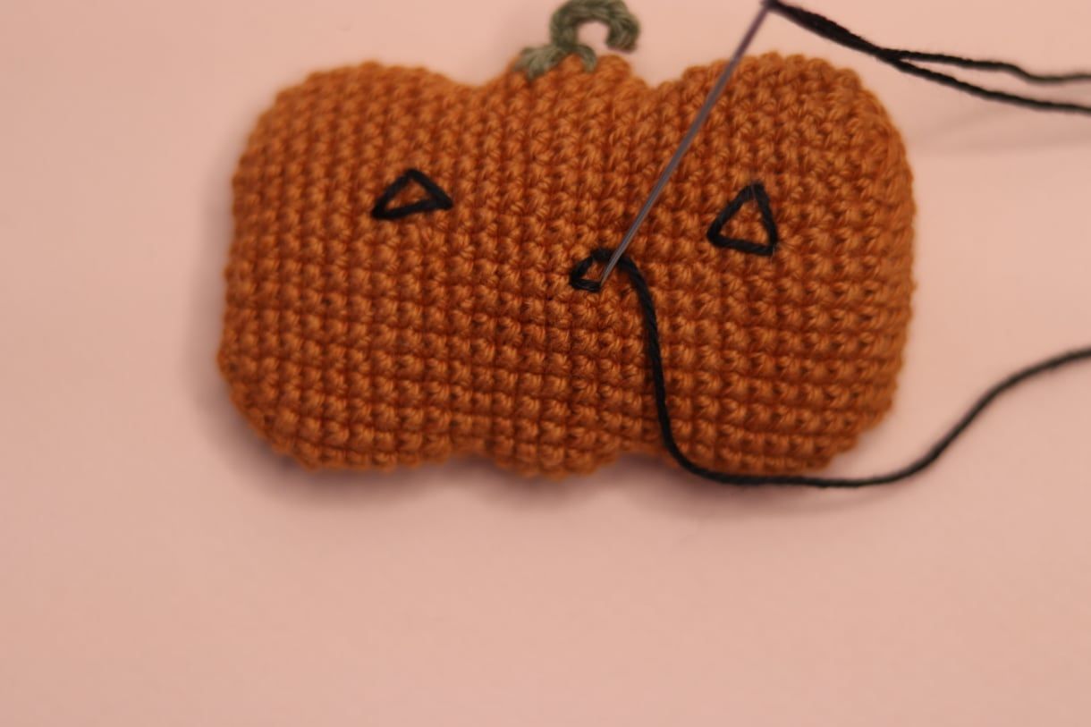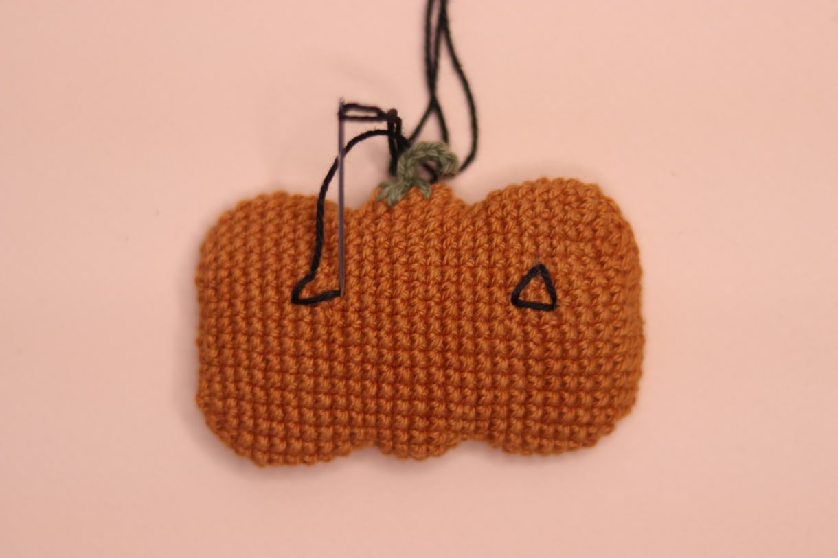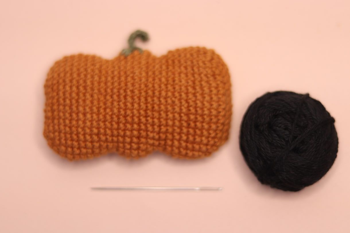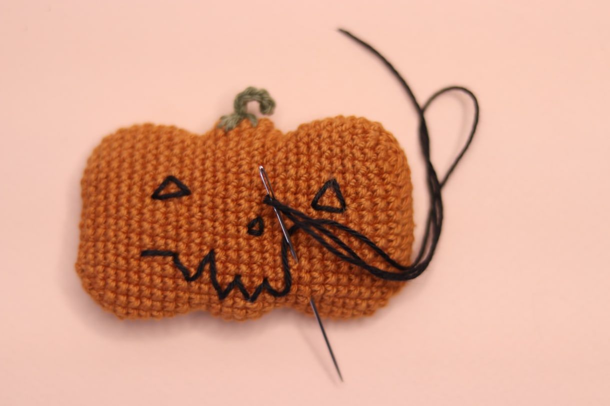 Si vous crochetez une citrouille aux côtés lisses, vous pouvez ajouter quelques détails supplémentaires pour créer un motif de Jack-o'-lanterne en utilisant du fil fingering noir et une aiguille.
