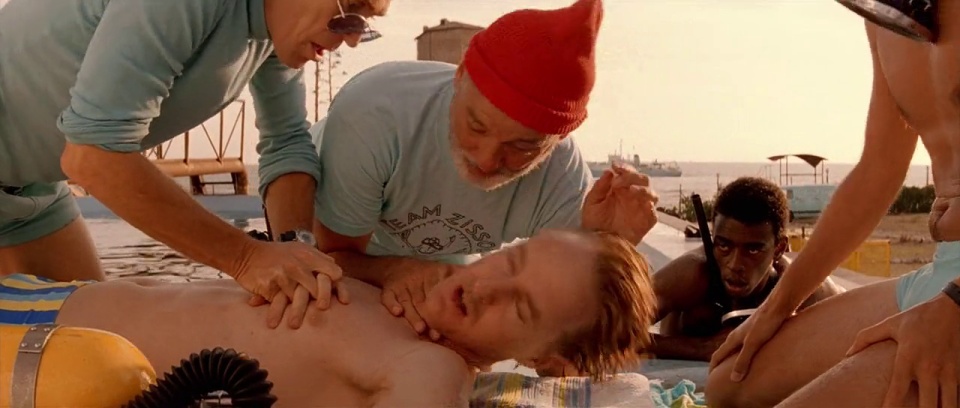 Zissou est un narcissique, concentré sur sa mission et sur la façon dont elle apparaîtra à l'écran. Alors qu'il fait du bouche-à-bouche à son "fils", il demande au directeur de la photographie comment il filme la scène. Nous voyons un posemètre entrer dans le cadre et entendons une réponse technique de l'équipe.