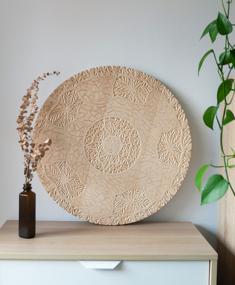 This piece consist of several wooden boards of 10cm glued together. I then draw the final design directly onto the wood by hand and using a ruler. It consists of organic patterns, combining 3 and 2 corner chips, carved at an angle between 55º & 65º. You can also see some thin lines carved using a Cannard 30mm carving knife by Pfeil Tools.