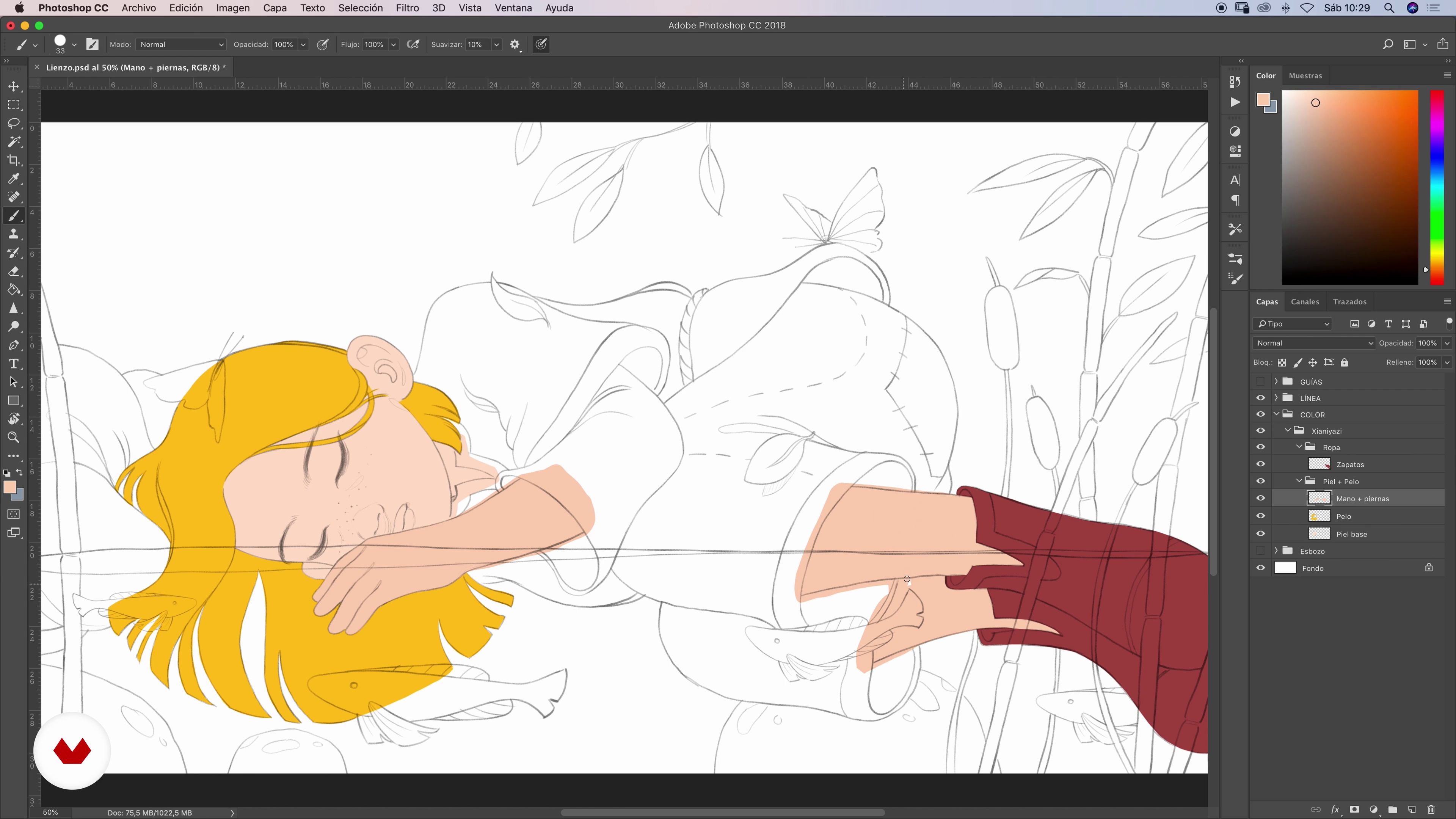 “Dans cette leçon. nous allons appliquer les premières couches de couleur uniforme à notre image. étape par étape. afin de déterminer la palette idéale pour notre scène et créer l’ambiance souhaitée. Allons-y. Tout d'abord. nous ouvrirons notre fichier dans Photoshop. Après avoir enregistré. je m'aperçois d'une erreur ici dans la ligne. je n'ai pas masqué les bottes de l'enfant. Si vous observez attentivement ici. vous verrez que je n'ai pas bien effacé la ligne. Donc. en un instant... Grâce à l'organisation soignée avec les noms. etc.. il devient très simple de repérer cette petite erreur. ...”