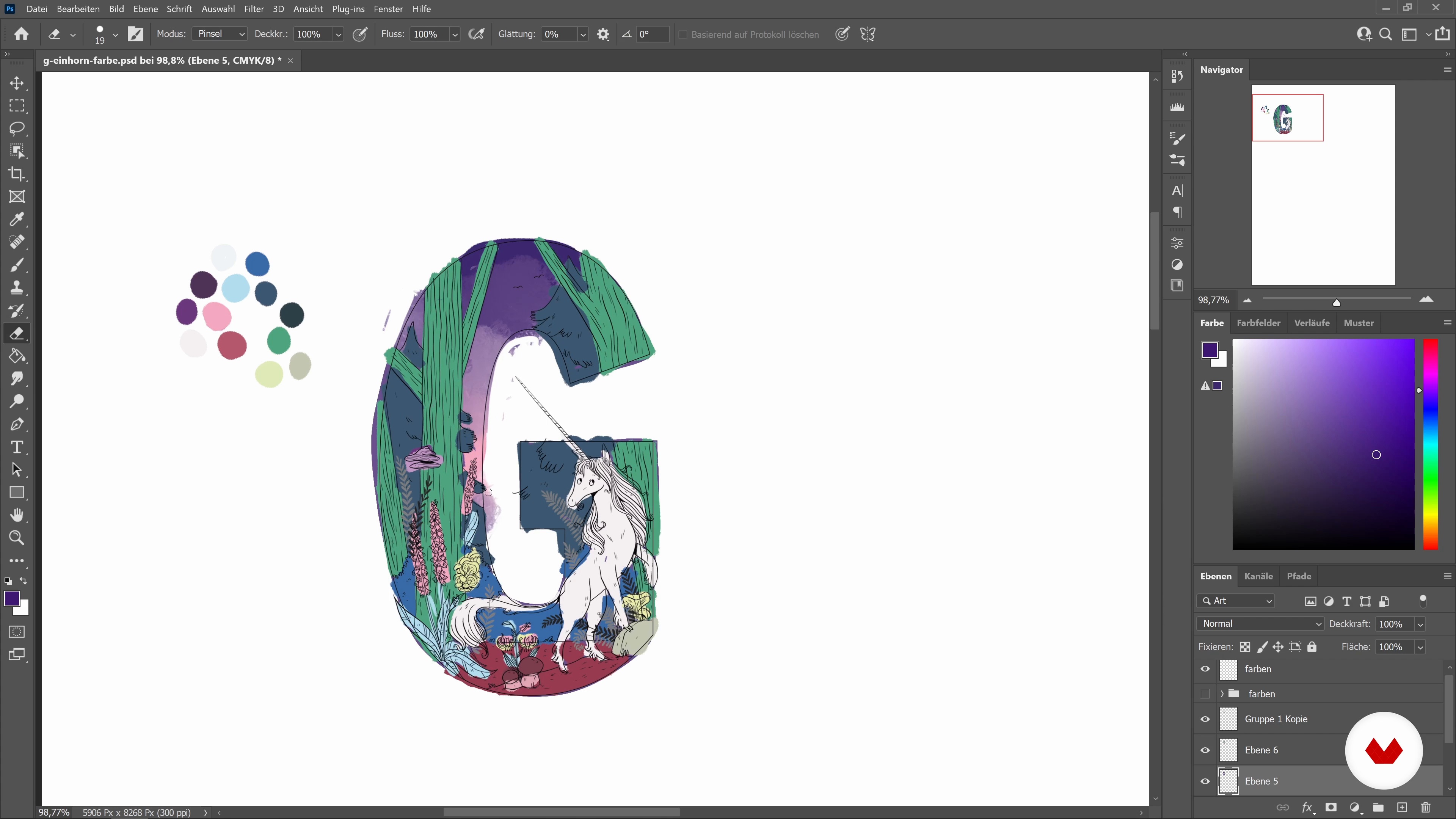 “La couleur est ajoutée Les contours définitifs sont prêts et il est temps de développer une palette de couleurs. Avant cela, je vais vous donner quelques conseils comment créer une palette de couleurs spéciale et travaillez là-dedans. Quand je crée des palettes de couleurs J'aime travailler avec un nombre réduit de couleurs. J'aime utiliser trois à cinq couleurs en fonction de la complexité de l'illustration. Quand j'ai besoin de plus de nuances Je les mélange ensemble des trois à cinq couleurs ou les rendre plus clairs ou plus foncés. c'est toujours bon aussi d'utiliser quelques tons neutr...”