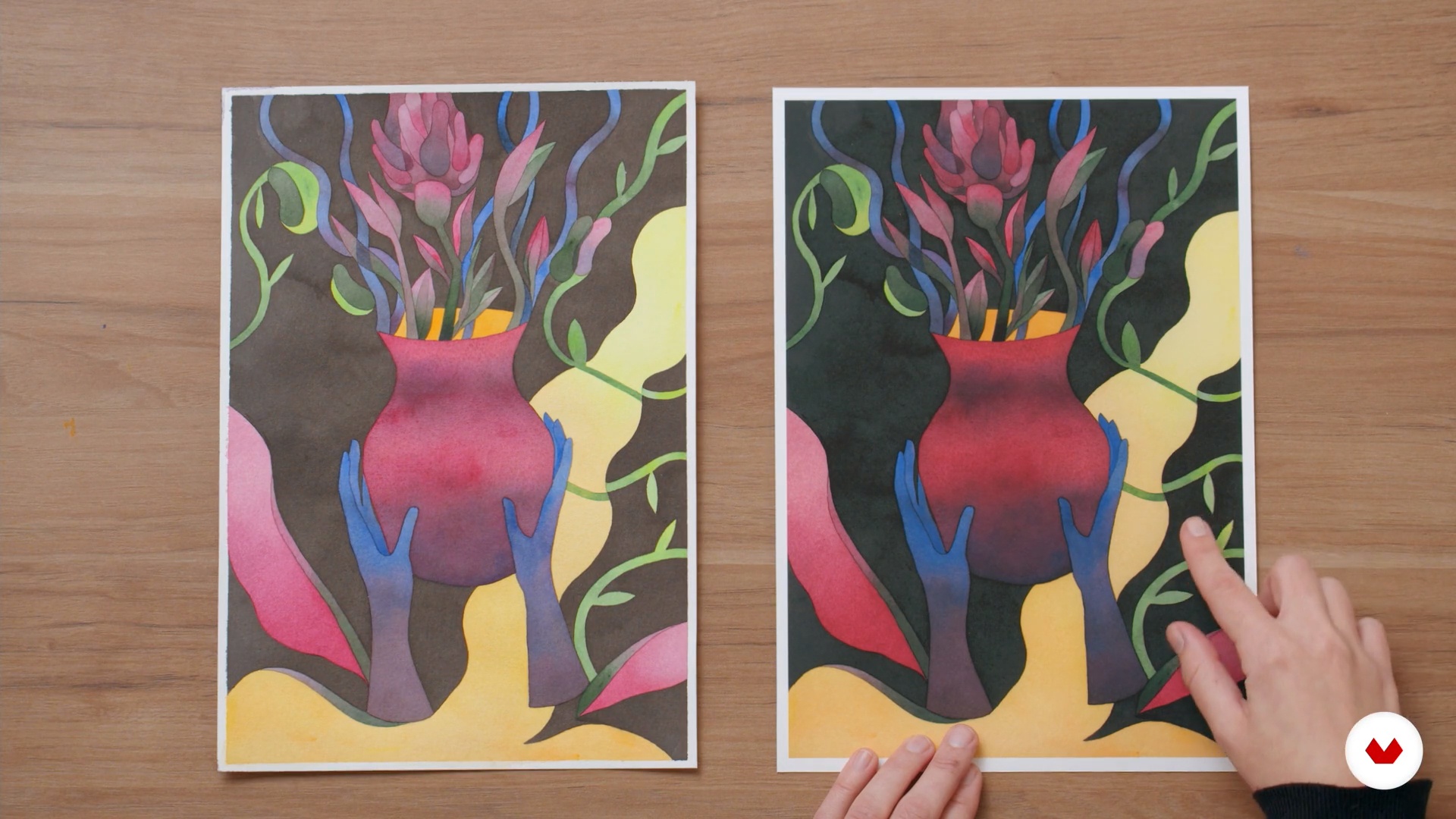 “Vous êtes très proche de la fin ! Maintenant je vais vous donner quelques recommandations pour l'impression et je vais vous parler du soin à apporter à votre aquarelle une fois qu'elle sera prête. ”