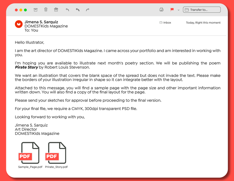 “Projet final Merci d'être allé jusqu'au bout. Je suis content que nous ayons passé ce temps ensemble et que tu me laisses te montrer le processus que j'utilise dans la création d'illustrations de magazines. Rappelez-vous que pour le projet final, Je vous confie une mission différente de celle que j'ai faite, pour ne pas être influencé par mon travail et vous pouvez libérer toute votre créativité dans votre projet. N'oubliez pas de lire toutes les instructions que j'ai laissé dans le brief, et si vous avez des questions, assurez-vous de visiter le Forum et laisse moi savoir. Je ne pourrai pe...”