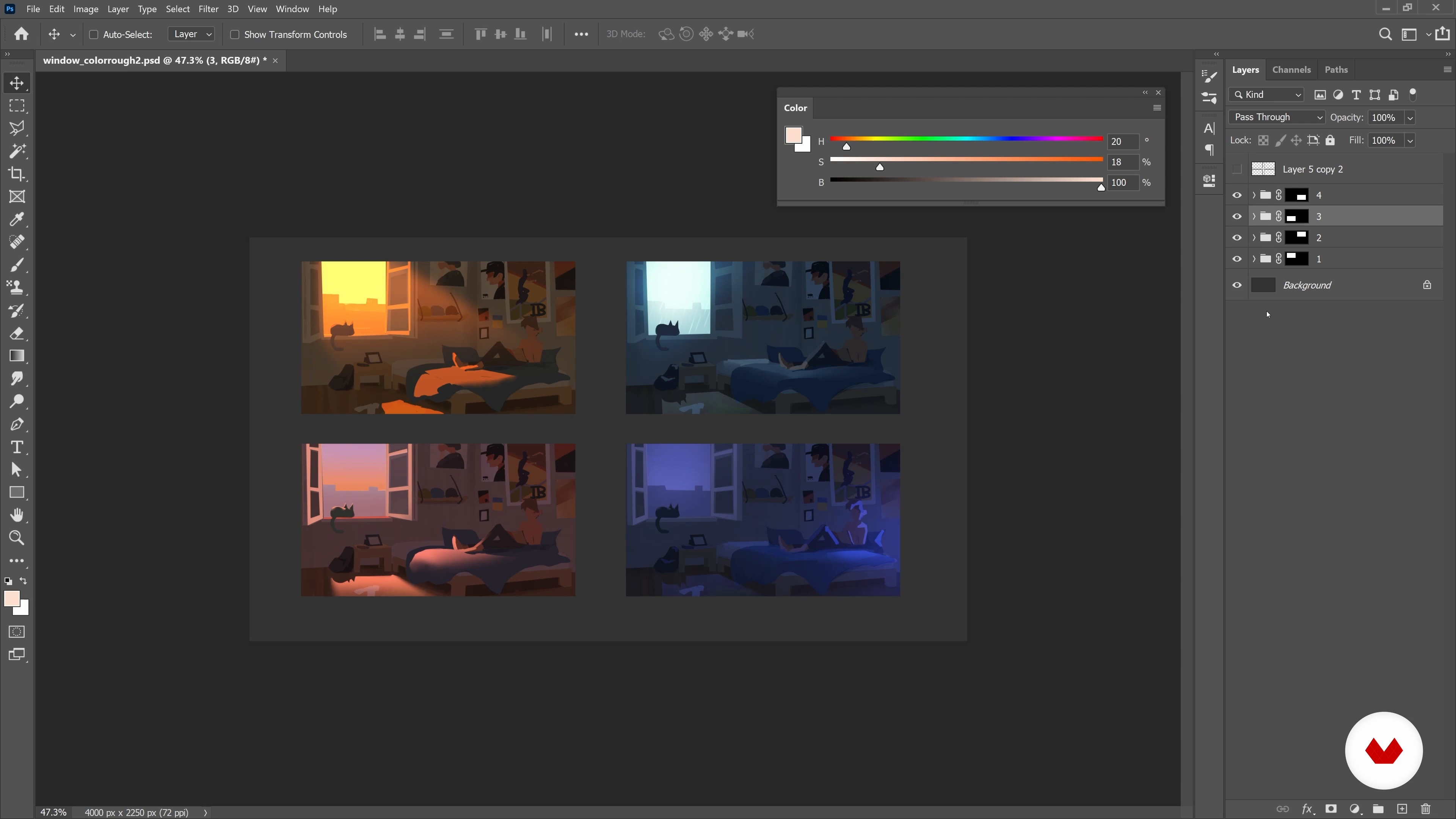 “Finissons avec la quatrième image ! En partant de la base de couleurs froides, je vais créer une ambiance nocturne. Je terminerai ensuite par faire des retouches générales puis exporter le tout. Notre étape de préparation est terminée !”
