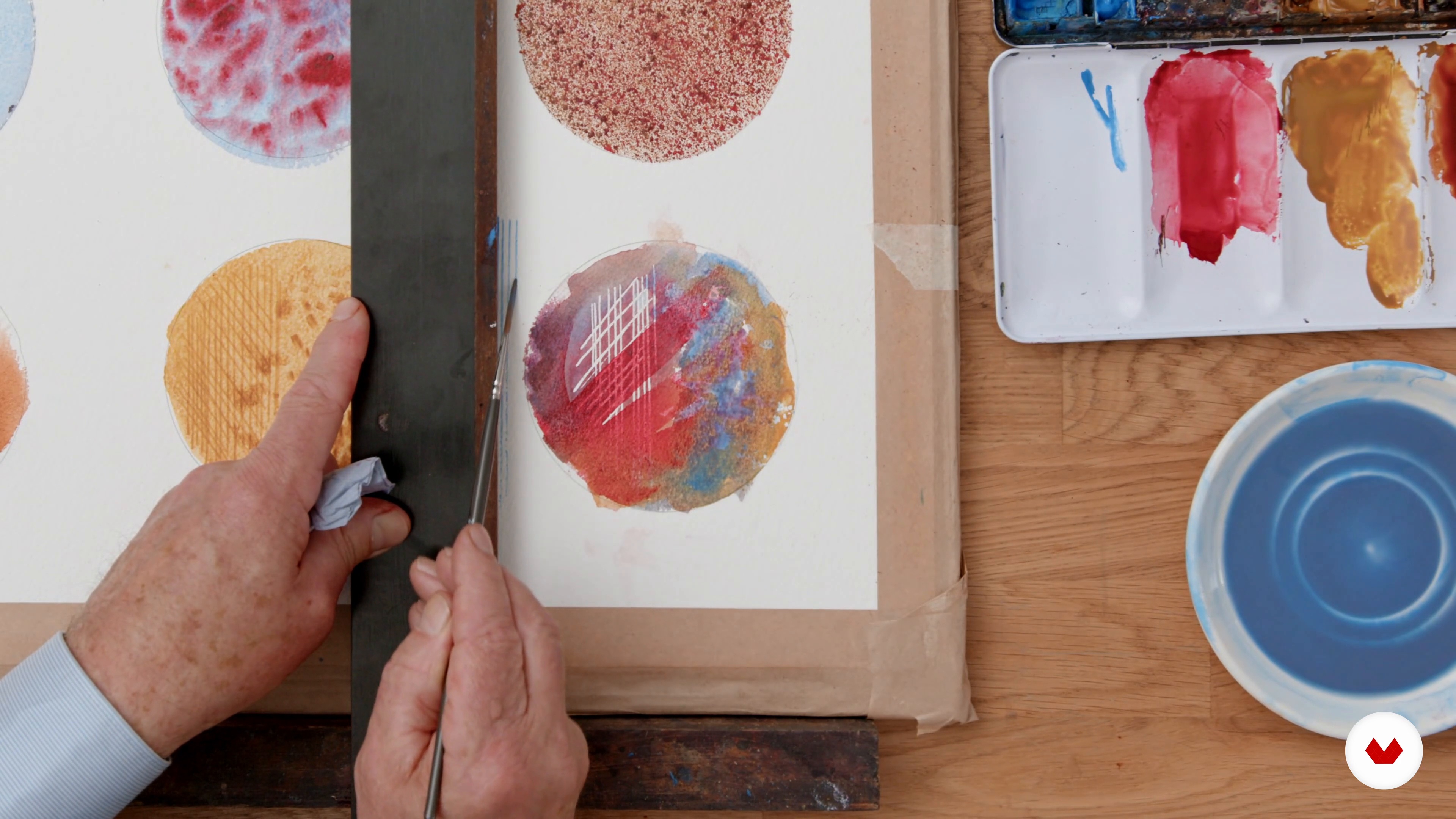 “pour notre cinquième technique spéciale. nous allons faire quelque chose dont vous avez peut-être entendu parler. Ça s'appelle l'éclaboussure. Souvent. les gens éclaboussent mais ils ne la contrôlent pas. Parce que... Ils ne le font pas comme ça. Si vous le faites de cette façon. vous pourrez le contrôler. Tout d'abord. ce cercle ici. Je vais. Utilisez simplement un pochoir pour couvrir soigneusement la zone autour. J'ai donc découpé un trou dans un vieux papier aquarelle. Je vais le positionner au-dessus de ceci. C'est parce que c'est une technique assez aléatoire. Et je veux garder la zon...”