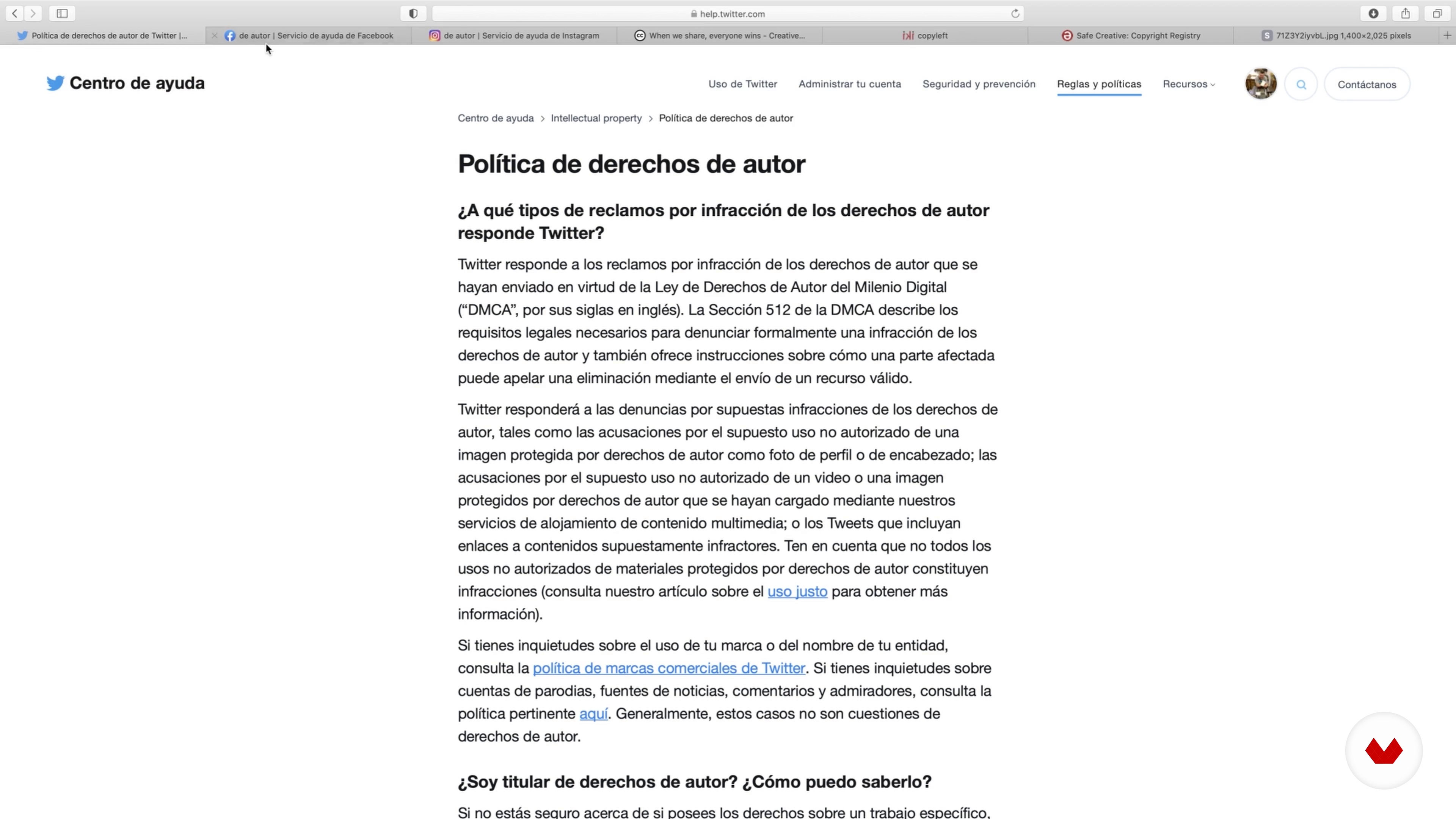 “Droit d'auteur et réseaux sociaux Dans cette leçon, nous allons essayer de parler d'une manière simple, d'un sujet assez complexe : droits d'auteur et l'utilisation de notre texte poétique dans les réseaux sociaux. Fonce. La question du droit d'auteur sur les réseaux sociaux est complexe et, si vous êtes préoccupé par cette question, informez-vous bien. D'une part, vous pouvez consulter les politiques de droit d'auteur des principaux réseaux sociaux. Par exemple, nous avons ici la politique des droits de Twitter. Il y a aussi la politique de copyright de Facebook, qui ressemble beaucoup à c...”