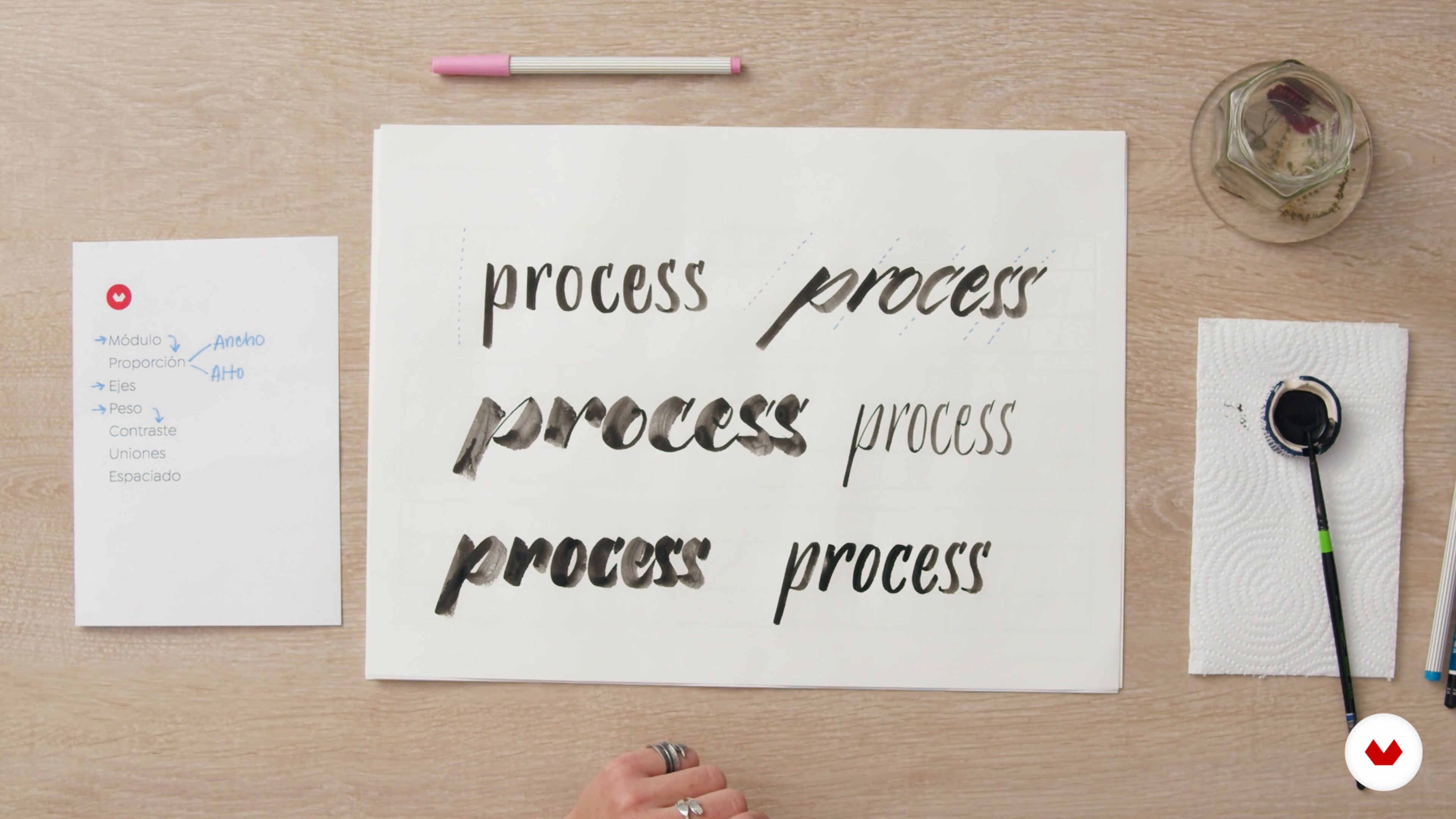 “Pour briser les règles nous devons d'abord apprendre à les suivre. Dans l'unité précédente, nous avons vu différents paramètres pour construire des lettres. Dans cette leçon, nous allons examiner les variantes explorer de nouveaux mondes et formes avec le pinceau. Comme je vous l'ai dit au début du cours, Dans cette leçon, je vais choisir un seul mot qui va être traité parce que je veux voir comment je résous le double S avec tous les exercices de variations. Pour cette leçon, je continue à utiliser la grille avec trois cases et les axes. Avant de commencer avec la brosse, la chose la plus ...”