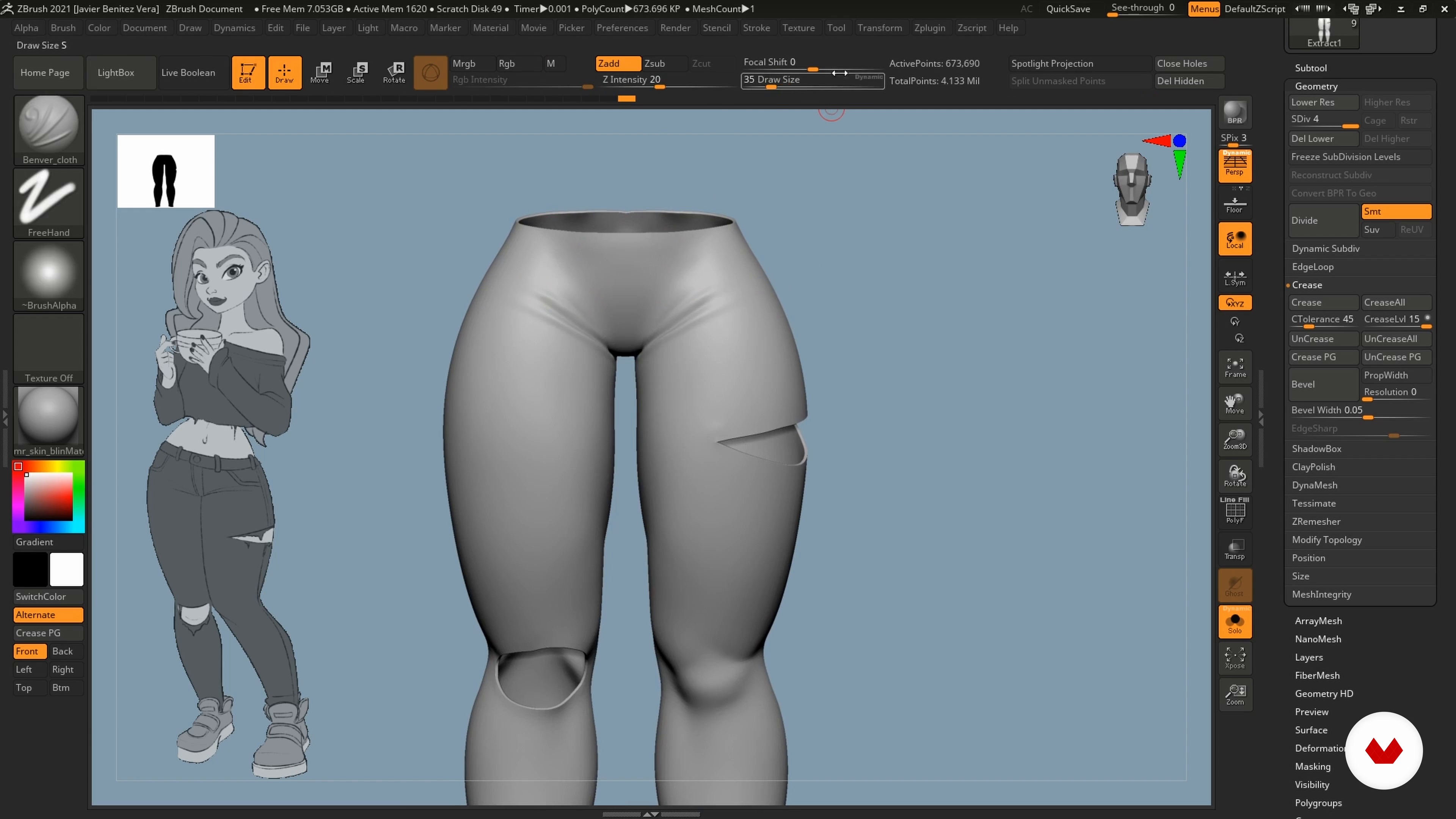“Dans cette leçon. nous allons commencer par la première partie du modelage du pantalon. Voyons cela. Pour créer le pantalon. nous allons utiliser les mêmes outils et suivre le même processus que pour créer le verset. Nous allons donc sélectionner le corps. Ensuite. nous procéderons aux étapes suivantes pour compléter le modèle. Avec le masque. nous allons procéder à la sélection. tout ce que nous voulons. qui sera le pantalon. Ici à la taille. je vais le faire descendre un peu devant. Devant. il n’est pas aussi haut. Derrière. c’est bien. mais devant c'est assez haut. Je vais ajuster pour q...”