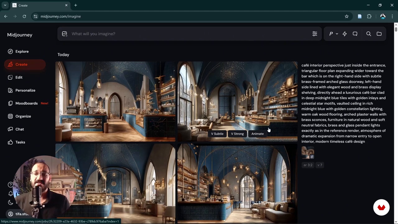 “Vous allez maintenant améliorer vos visuels grâce à la fonction de référence de style de MidJourney pour garantir la cohérence des matériaux, de l'éclairage et de l'ambiance dans les différentes zones du café. Vous pourrez également agrandir les images, générer des mood boards via ChatGPT et préparer les ressources pour une finition avancée avec Nano Banana.”