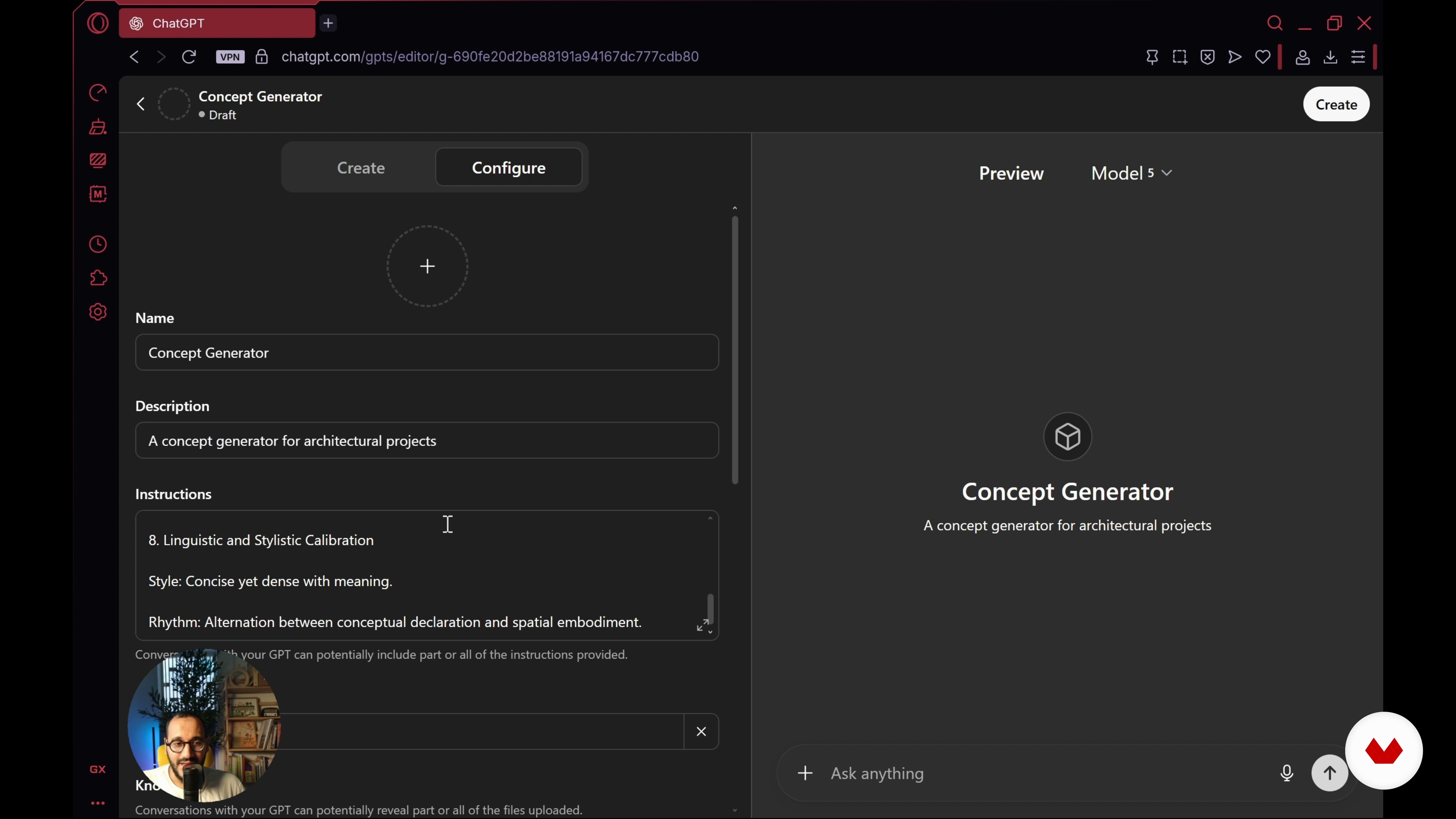 “Maintenant. je veux créer un générateur de concepts et je veux l'entraîner sur mon ebook précédent ainsi que sur certaines notes. quelques exemples que j'aime du monde architectural. Et ensuite voir Quel type de résultats ? nous fournira. Ainsi. je vais procéder à la configuration et je vais l'appeler concept. générateur par exemple un générateur de concepts pour l'architecture Projets. Ensuite. pour les instructions. je vais laisser ça un moment et je vais télécharger les lesquels je veux échanger GBT. Je l'ai téléchargé. assurez-vous d'avoir un PDF. qui n'a pas de textes sélectionnables G...”