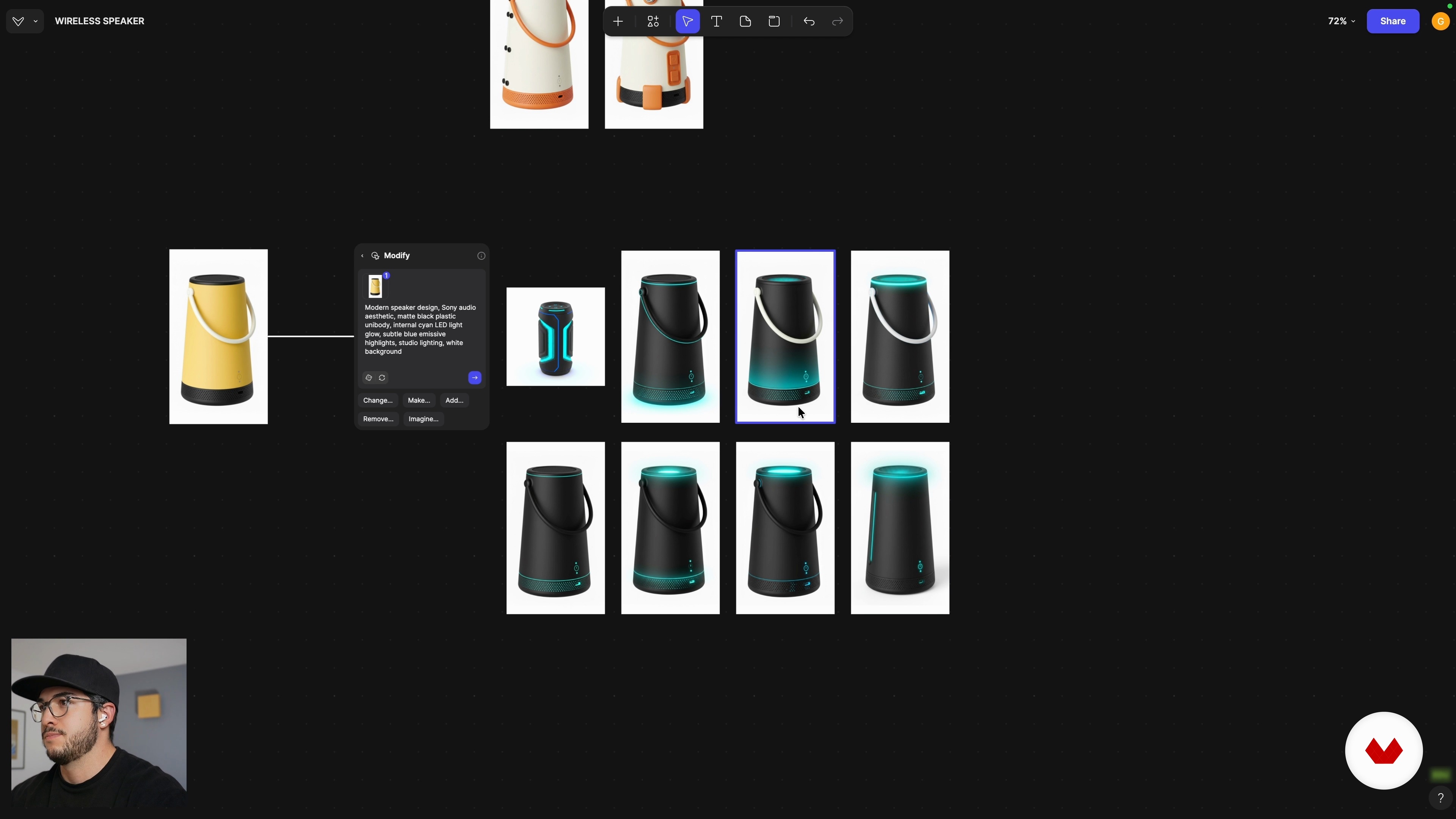 “Tu vas utiliser ton master render nettoyé pour explorer trois directions de CMF sur le même haut-parleur 3D. Tu vas combiner Modify et Variate Color pour tester des styles inspirés de marques (Bang & Olufsen, Teenage Engineering, Sony), mixer les meilleurs détails et choisir les options les plus solides pour ton portfolio.”