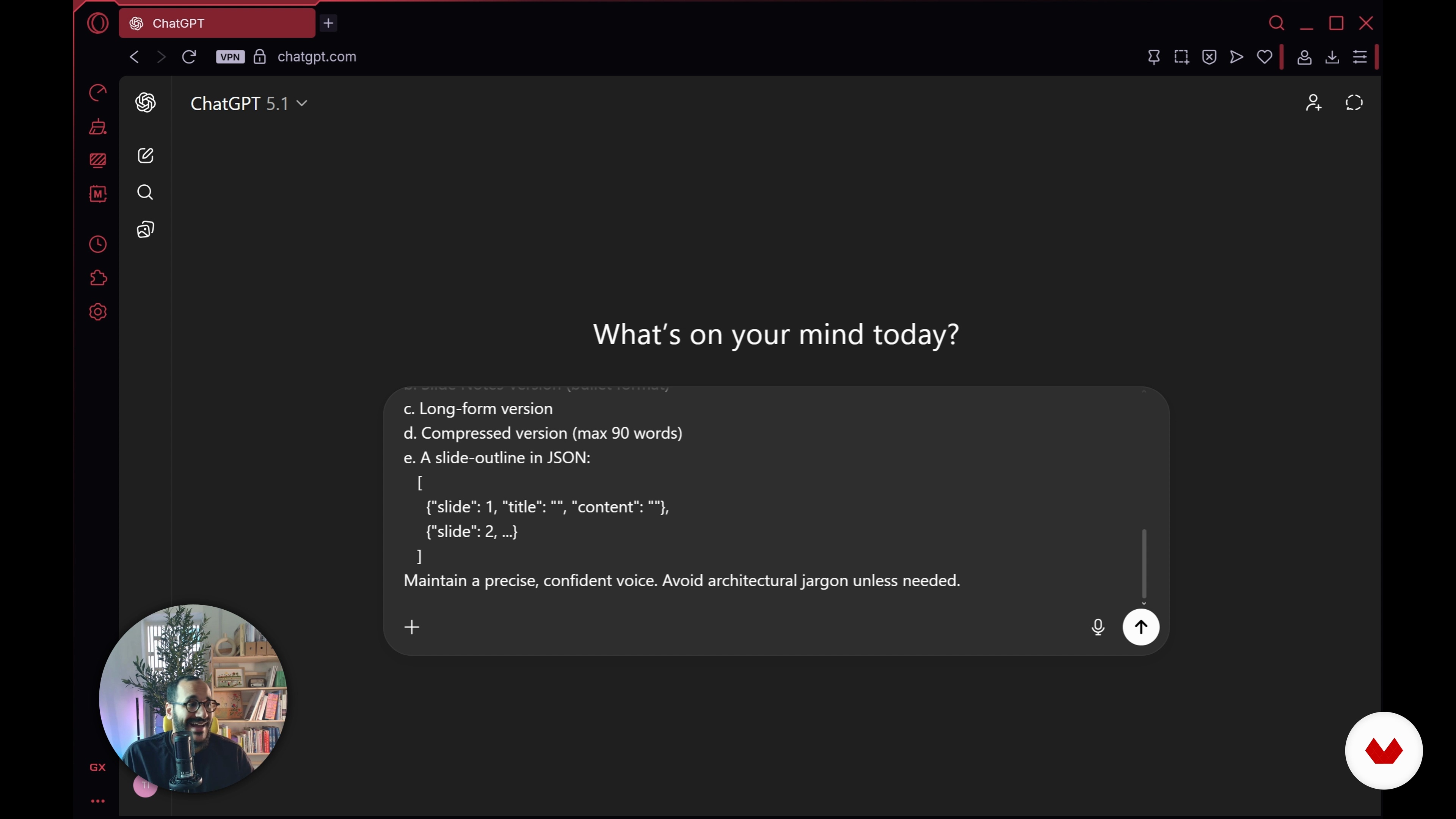 “Tu vas concevoir une colonne narrative pour un deck client en apprenant à briefer ChatGPT avec précision. Tu vas structurer tes prompts autour de cinq éléments : contexte du projet, analyse des parties prenantes, cadrage de l’argument, instructions d’extraction de données et formats de sortie pour les diapositives. Tu testeras ensuite un prompt maître, tu observeras comment l’IA génère problème–vision–proposition–impact et tu affineras ton, longueur et terminologie par des boucles itératives, afin que chaque diapositive découle d’un récit cohérent et persuasif plutôt que d’un texte générique.”
