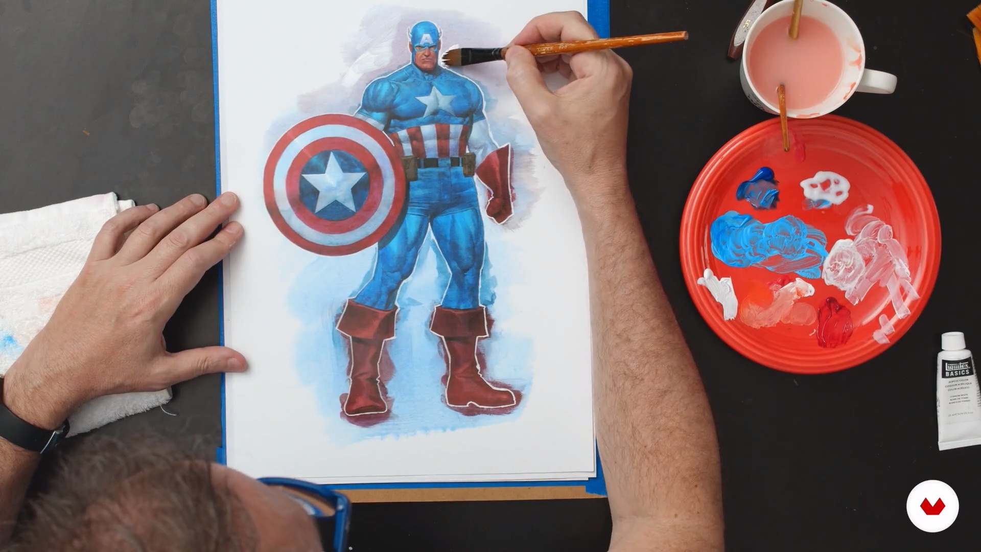 “Que ferons-nous dans ce cours ? Nous allons beaucoup nous amuser. Vous n'avez pas besoin de savoir dessiner pour apprécier ce cours. Parce qu'en réalité ce que je vais vous expliquer c'est que... comment peindre à l'acrylique un dessin qui peut être le vôtre OU peut être calqué. peut être copié. ne vous inquiétez pas. J'ai personnellement choisi Captain America. C'est un personnage coloré et cela me permet de vous montrer comment réaliser une illustration avec une multitude de couleurs. et non en monochrome. D'abord. simplement. un bref survol de la théorie de la lumière et de l'ombre pour ...”