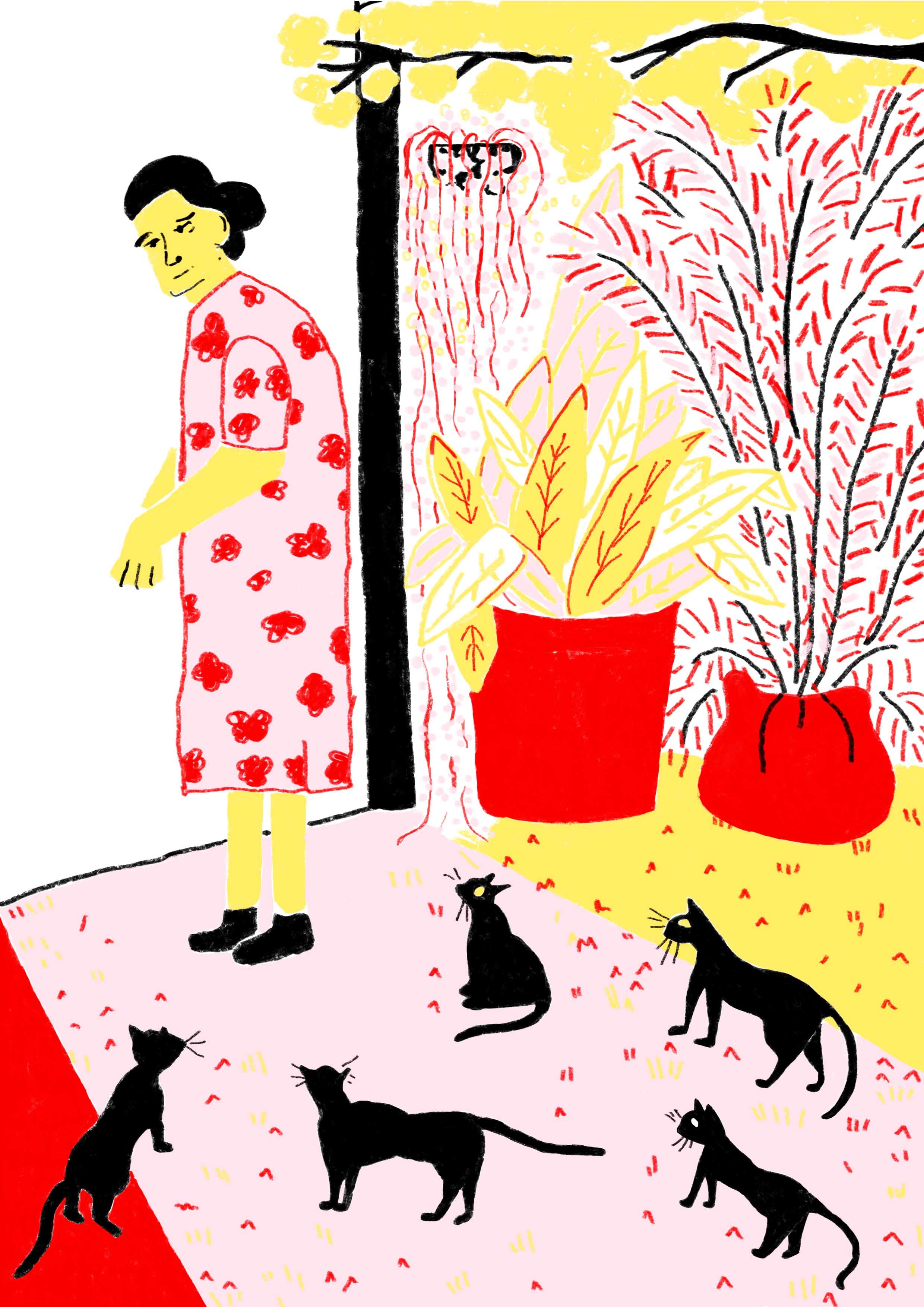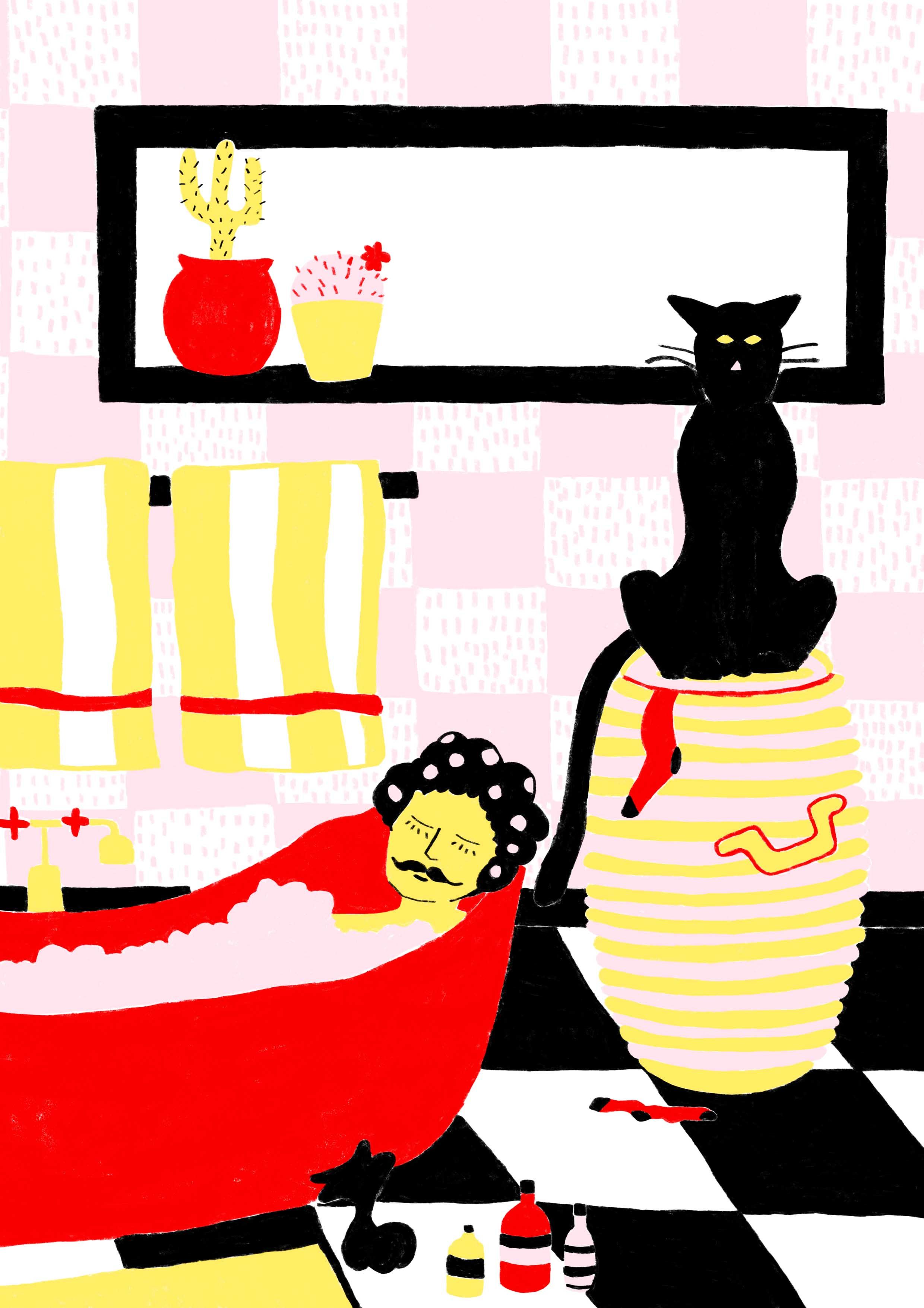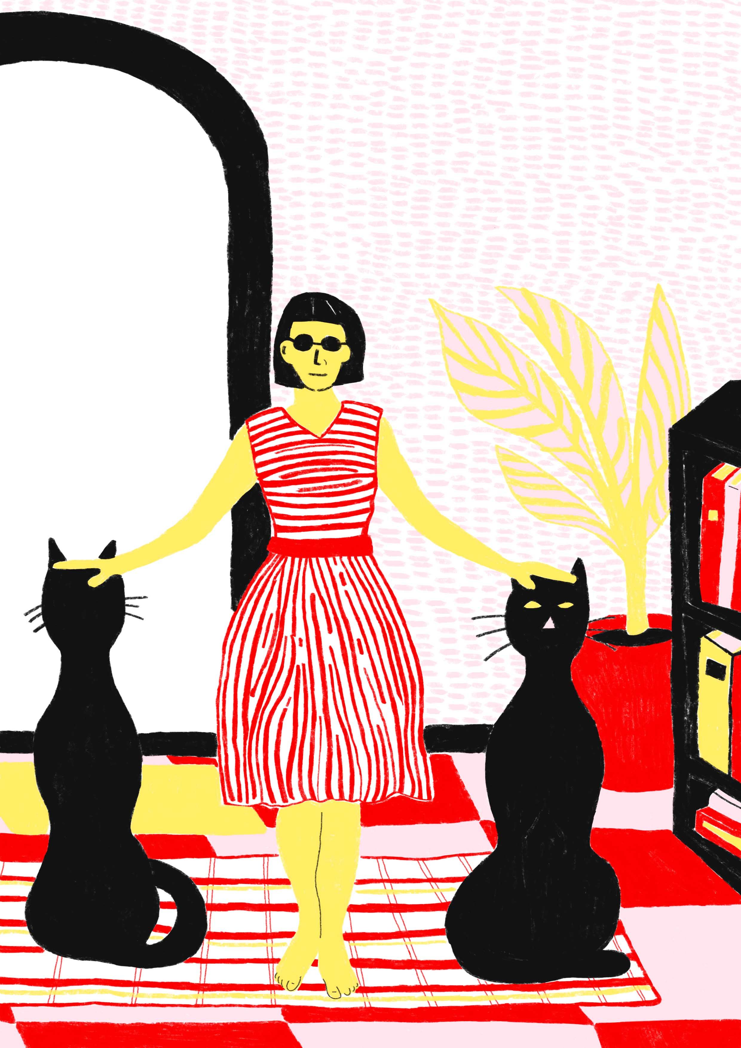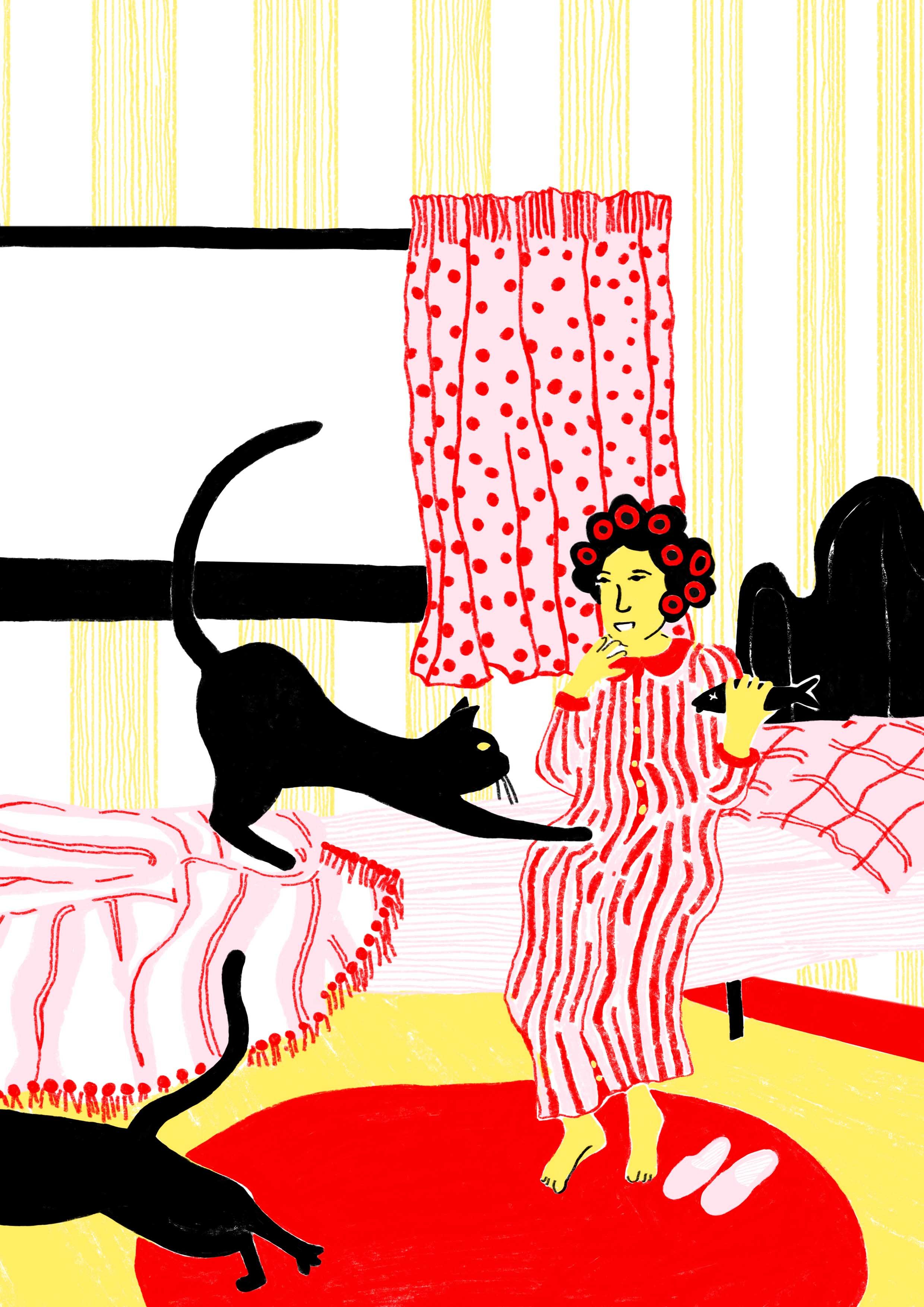 The first four lives were submitted for #IllustrationGym, a course by Santiago Solís Montes de Oca. They were drawn with pencils on paper and you can see the 4 original drawings here >>. As I continued with the series, I wanted to make reproduction prints too, so I started re-drawing the images in Photoshop. For more information about the series or prints, visit here >>