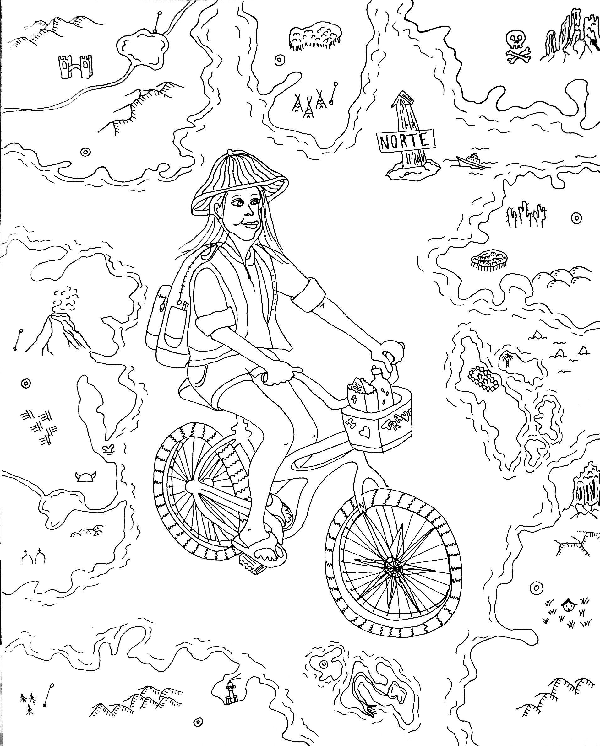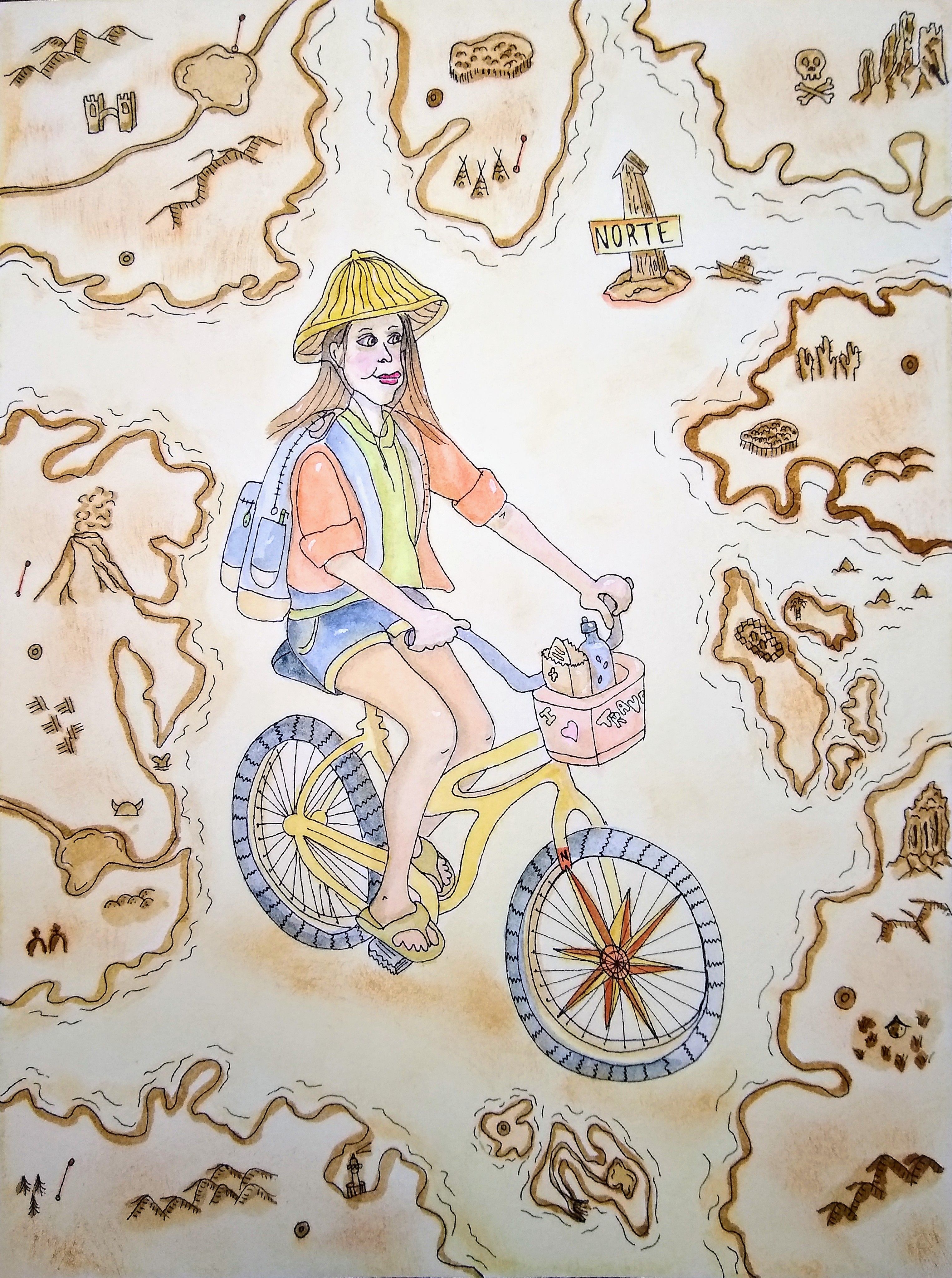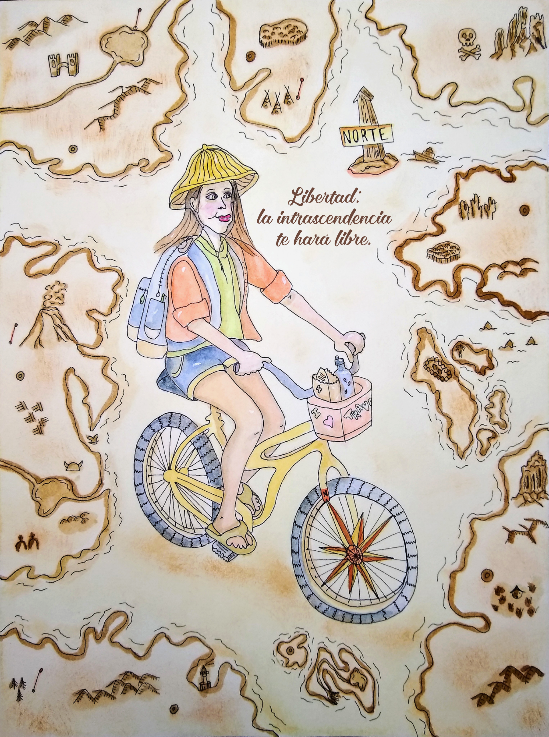 La ilustración final incluye los elementos elegidos al azar: brújula, mochila, y bicicleta, acompañados de un mapa inventado y la frase sobre la libertad.