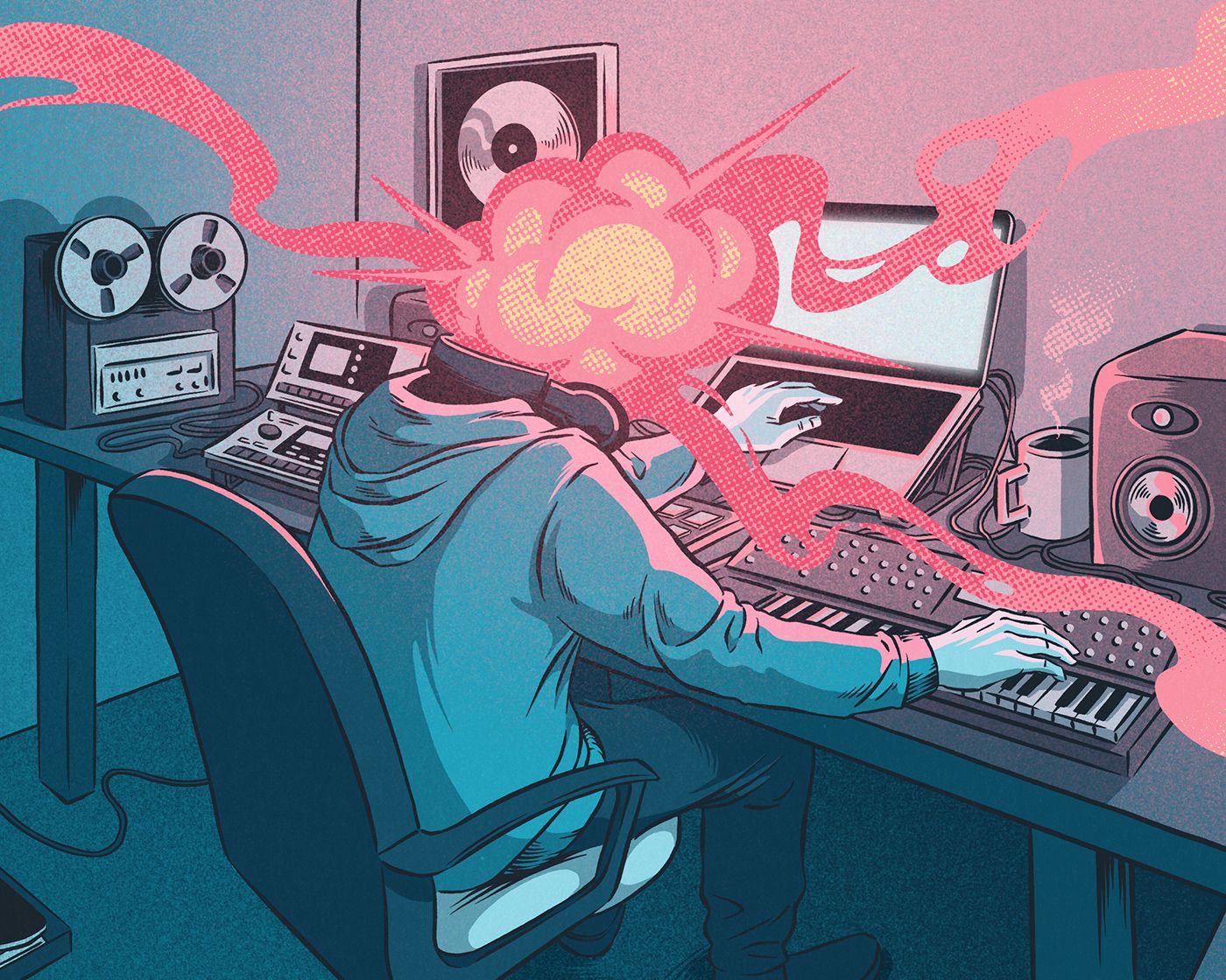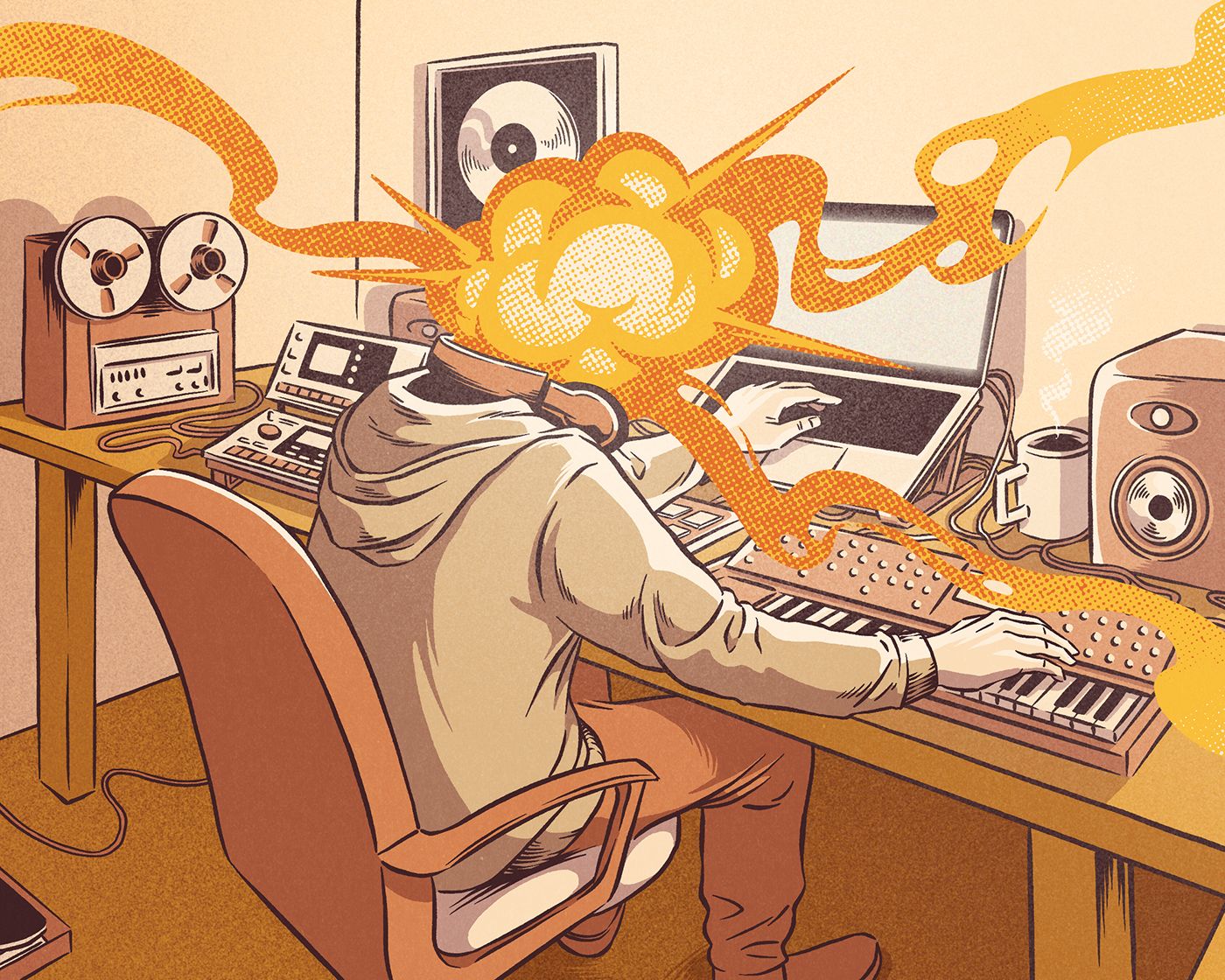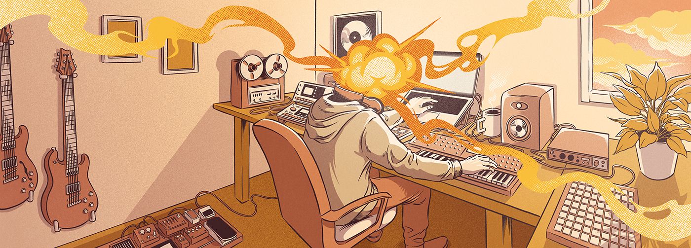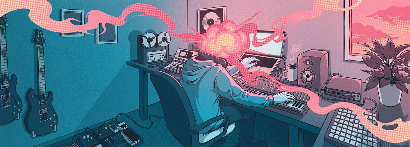La ilustración representa el momento de creación en un estudio casero y la infinidad de material y recursos que ofrece el servicio.