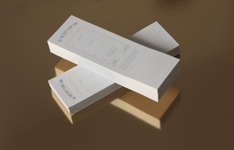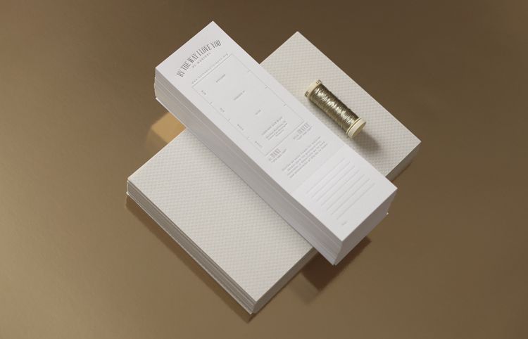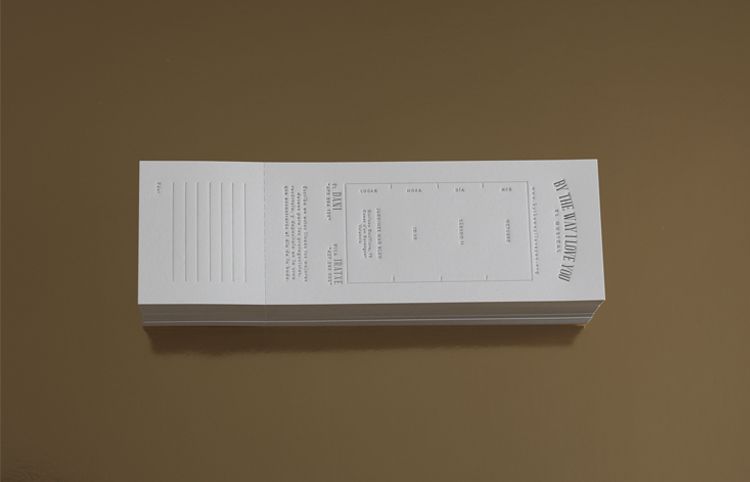 Elle danse et il joue d'un instrument. Il ne s'agit donc pas d'un mariage, mais d'une comédie musicale. Les faire-part ressemblent à des billets de comédie musicale ; ils sont imprimés sur du papier recyclé 250 g avec une finition gaufrée à chaud et comportent une découpe en bas pour le message des mariés. La bande-annonce de la comédie musicale est disponible sur le site web www.bythewayiloveyou.org .